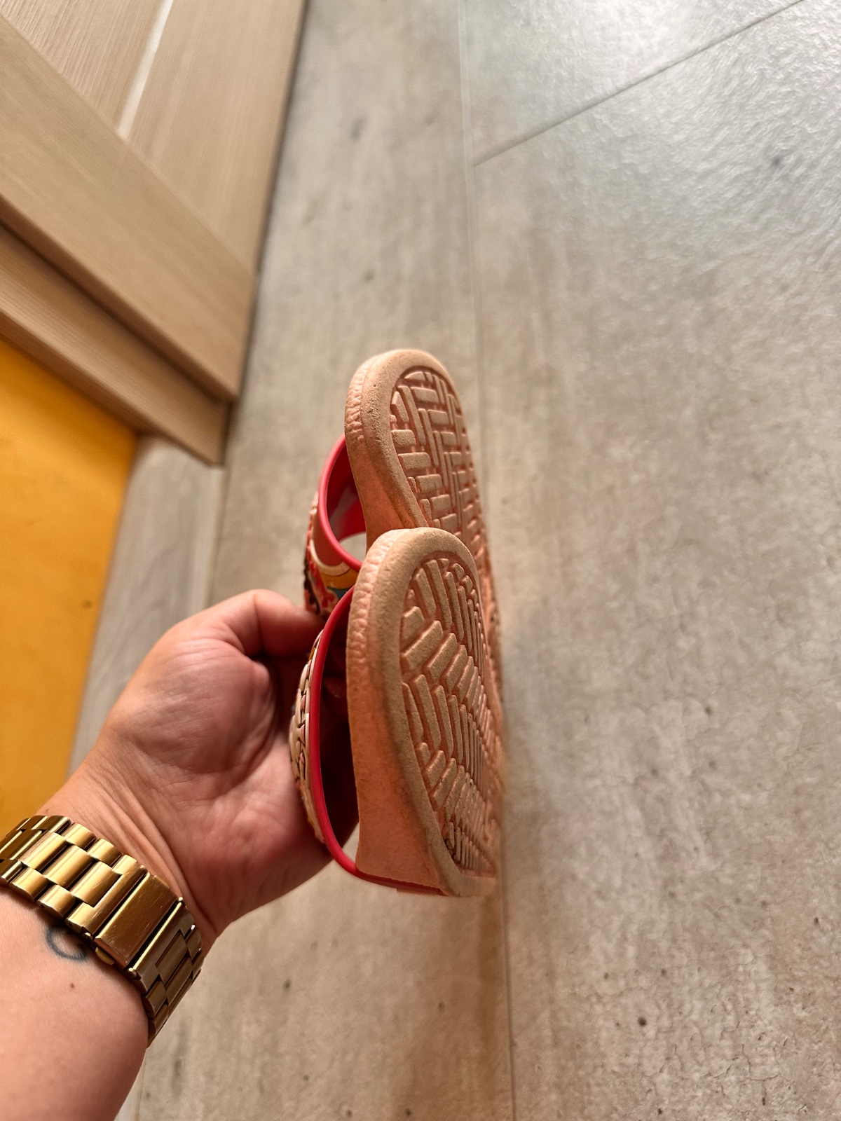 Predam nosene šlapky,su velmi pekne,bez poškodení. Vnutorna dlžka 18-18,5cm-vid foto.snazila som sa ich vyčistit ale niektore fliačky na fotkach vidno. Cena 4€symbolicka/stali povodne 20€.