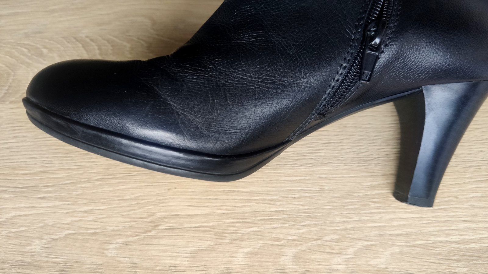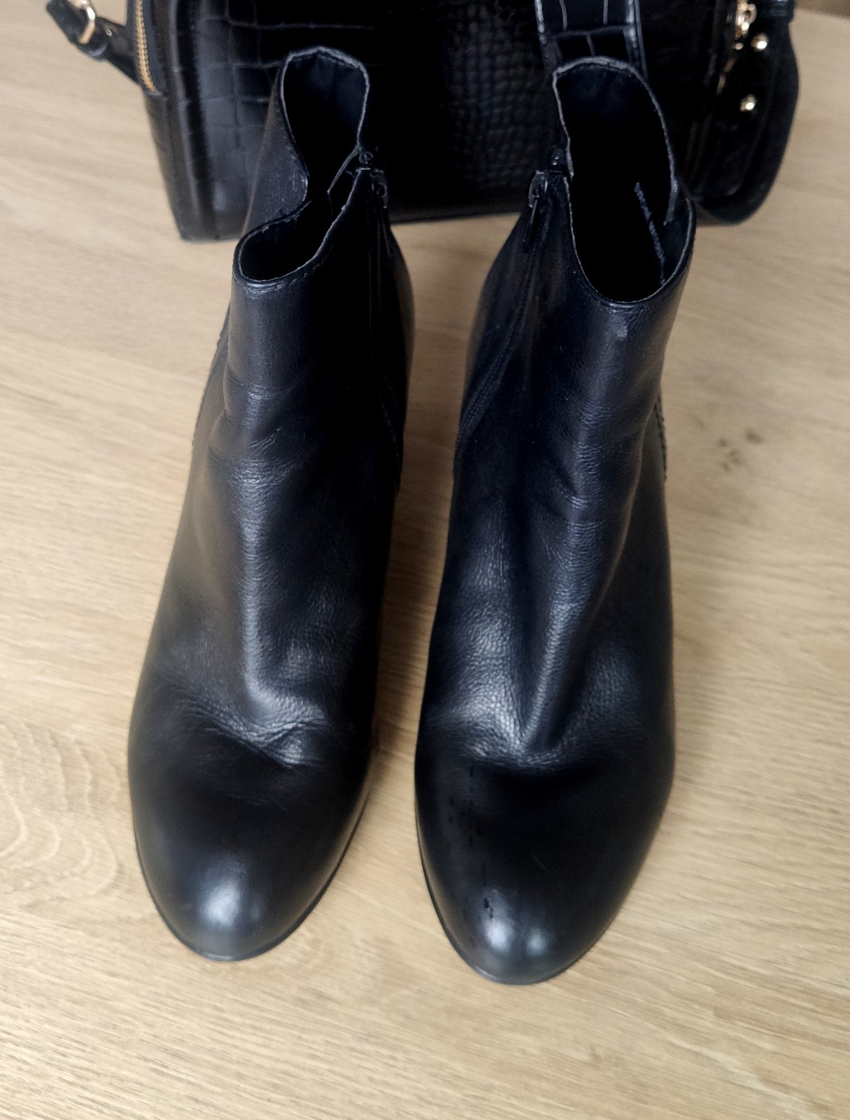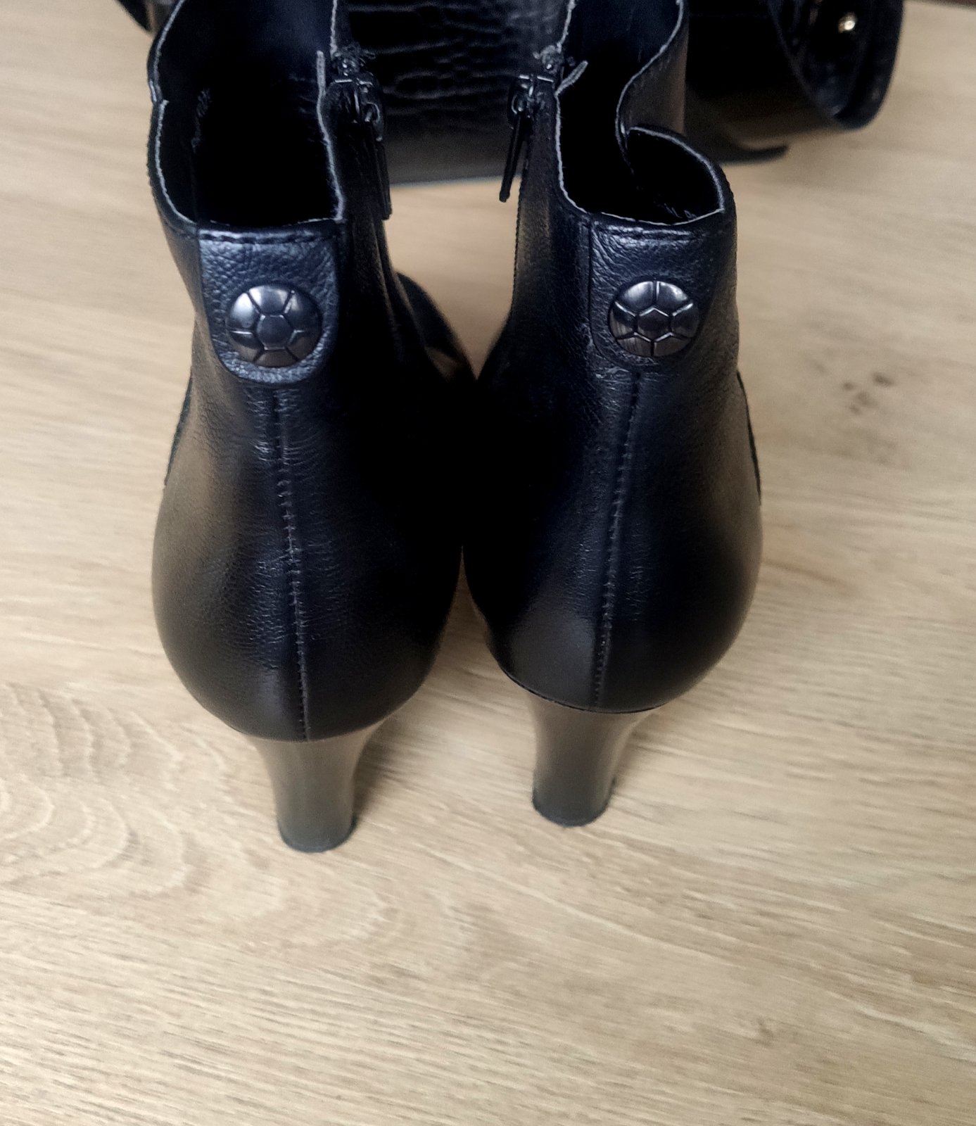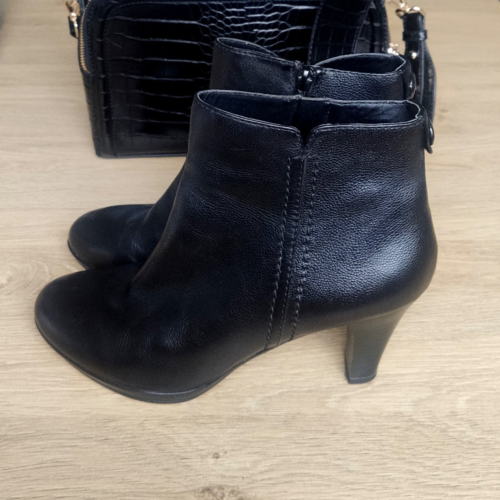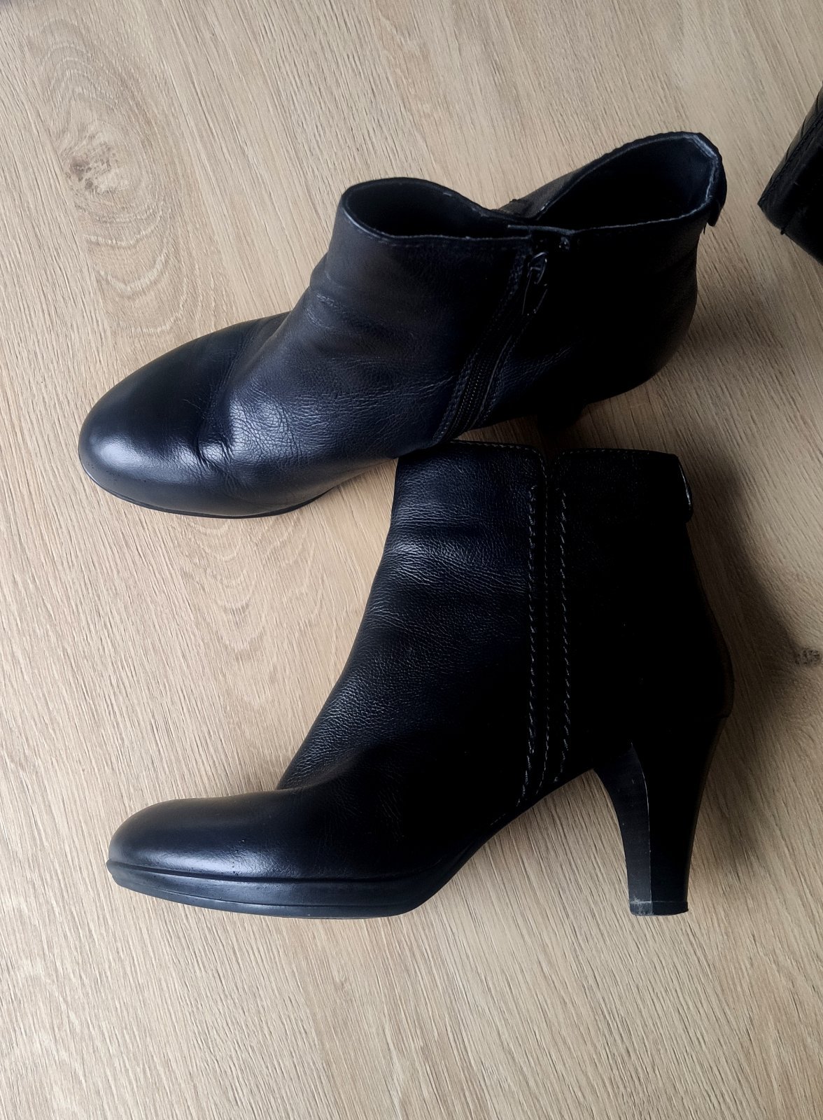 Pohodlné kožené členkové čižmičky na stredne vysokom podpätku z kolekcie Cindy Crawford (5-th Avenue). Pogumovaná nešmykľavá podrážka, ca. 1 cm platforma, stabilné. Sýta čierna farba, kvalitná koža. Bez poškodení, iba jemne šuchnutý opätok na jednej topánke, udržiavané, čisté a vydezinfikované.