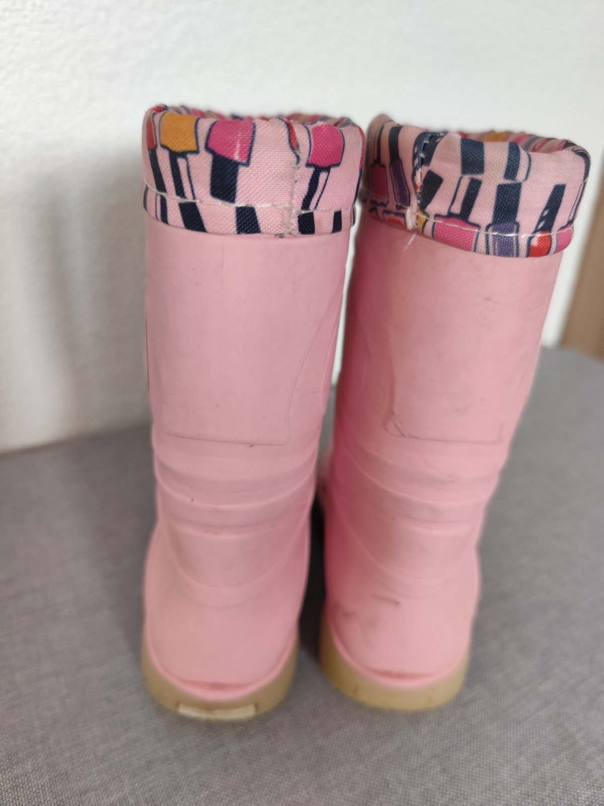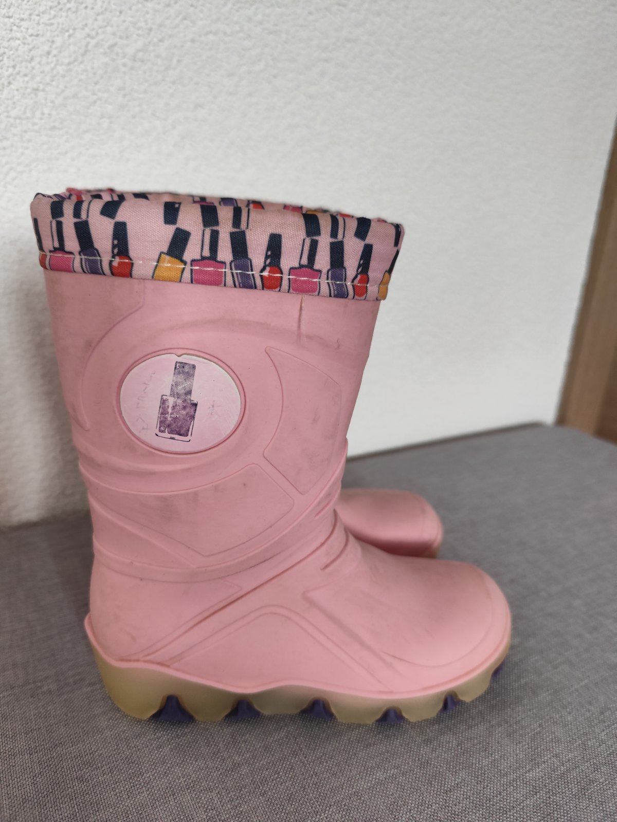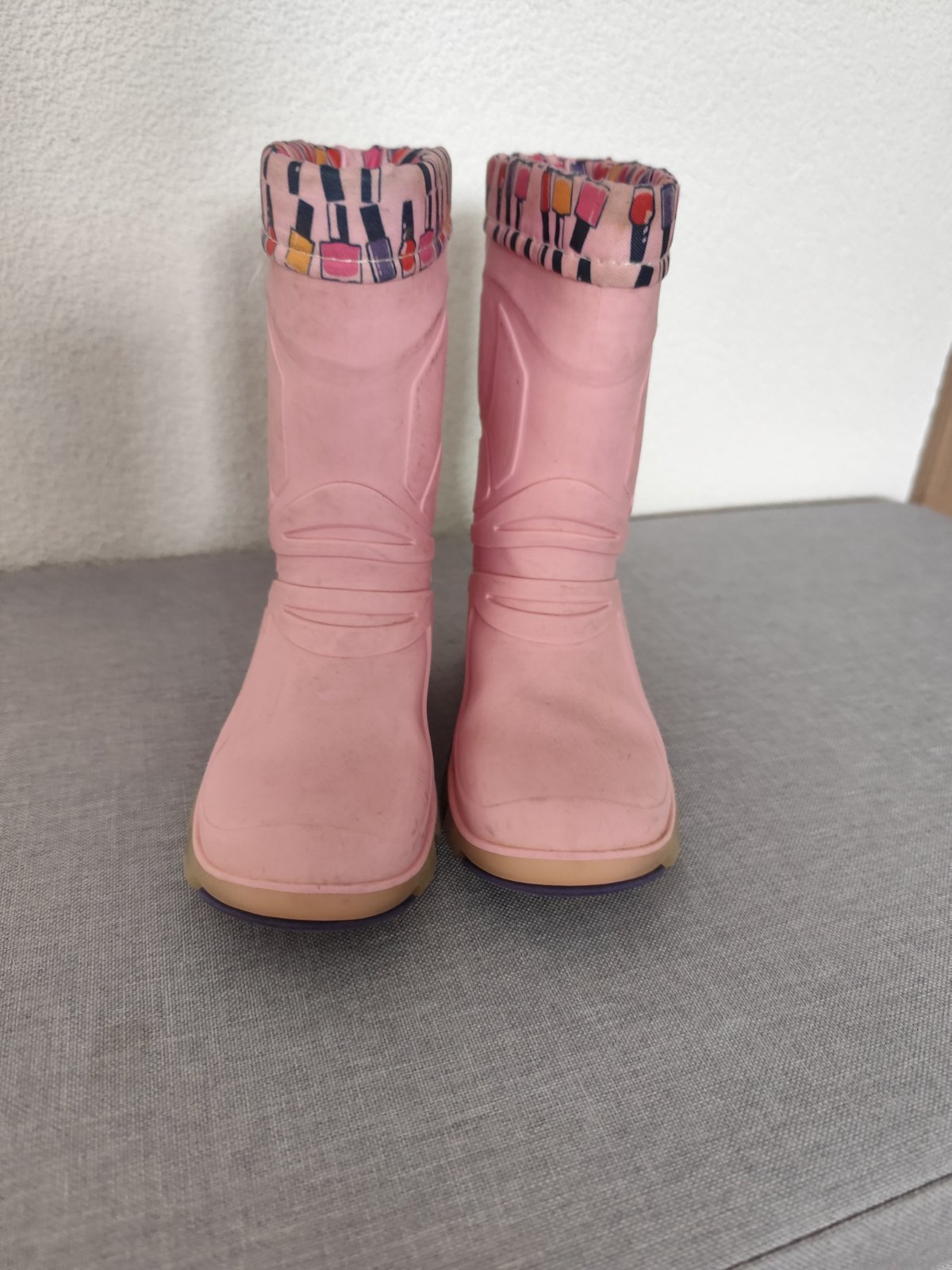 Nenosené, trošku zazlknute dievčenské gumáky. Vnútorná dĺžka 17cm. Poštovné: podľa sadzobníka Slovenskej pošty