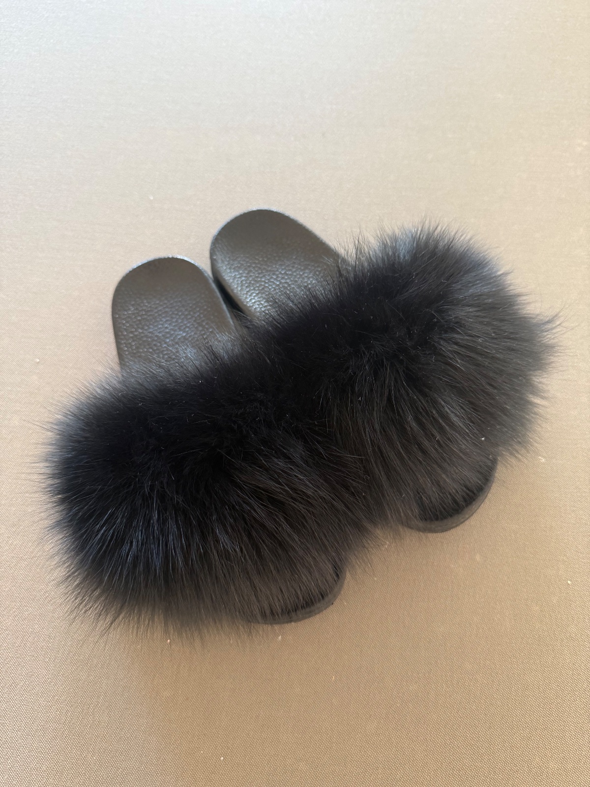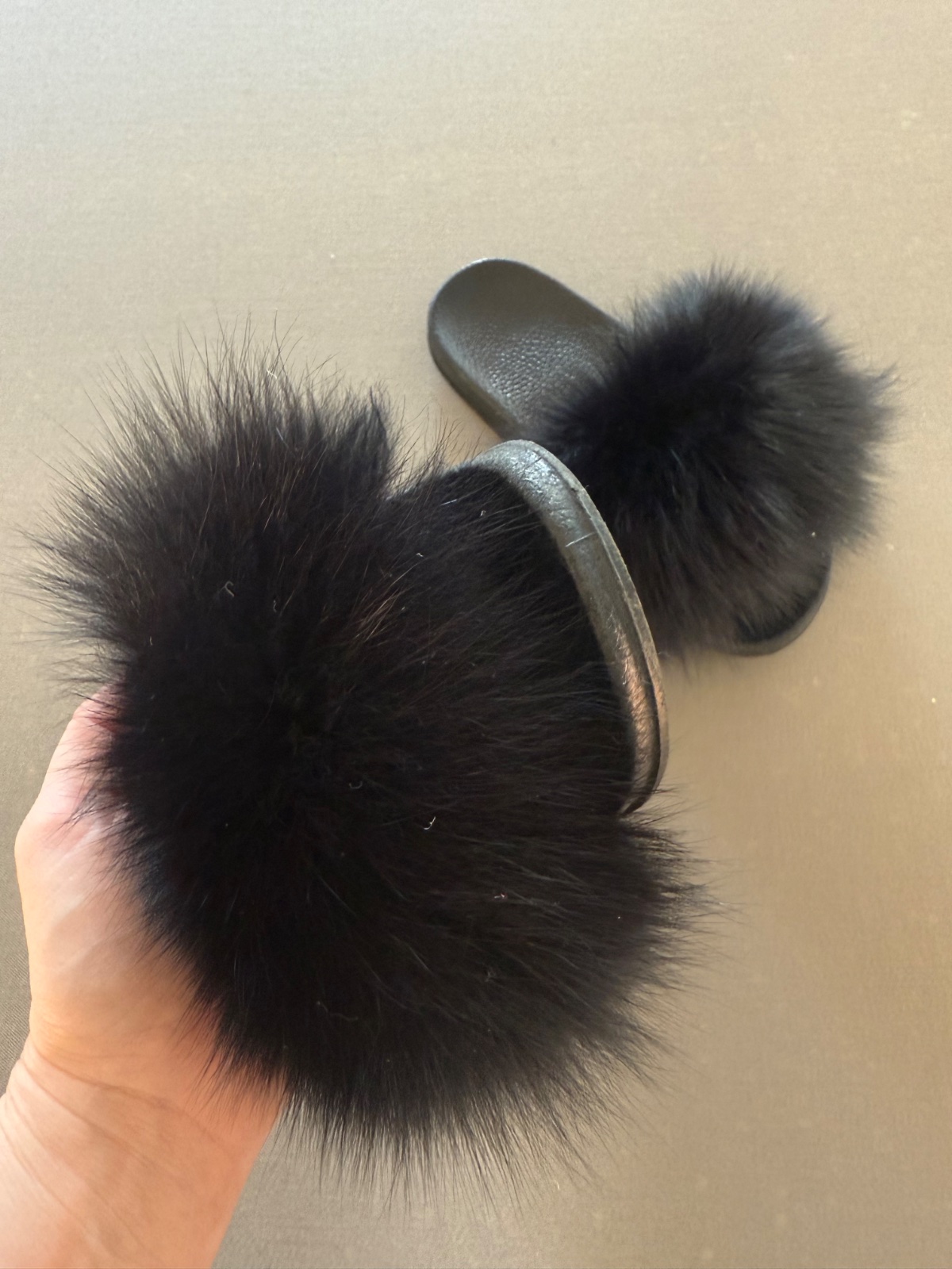 Čierne kožušinové šľapky s pravou kozušinkou. Veľkosť 37. Dĺžka chodidla max 23.