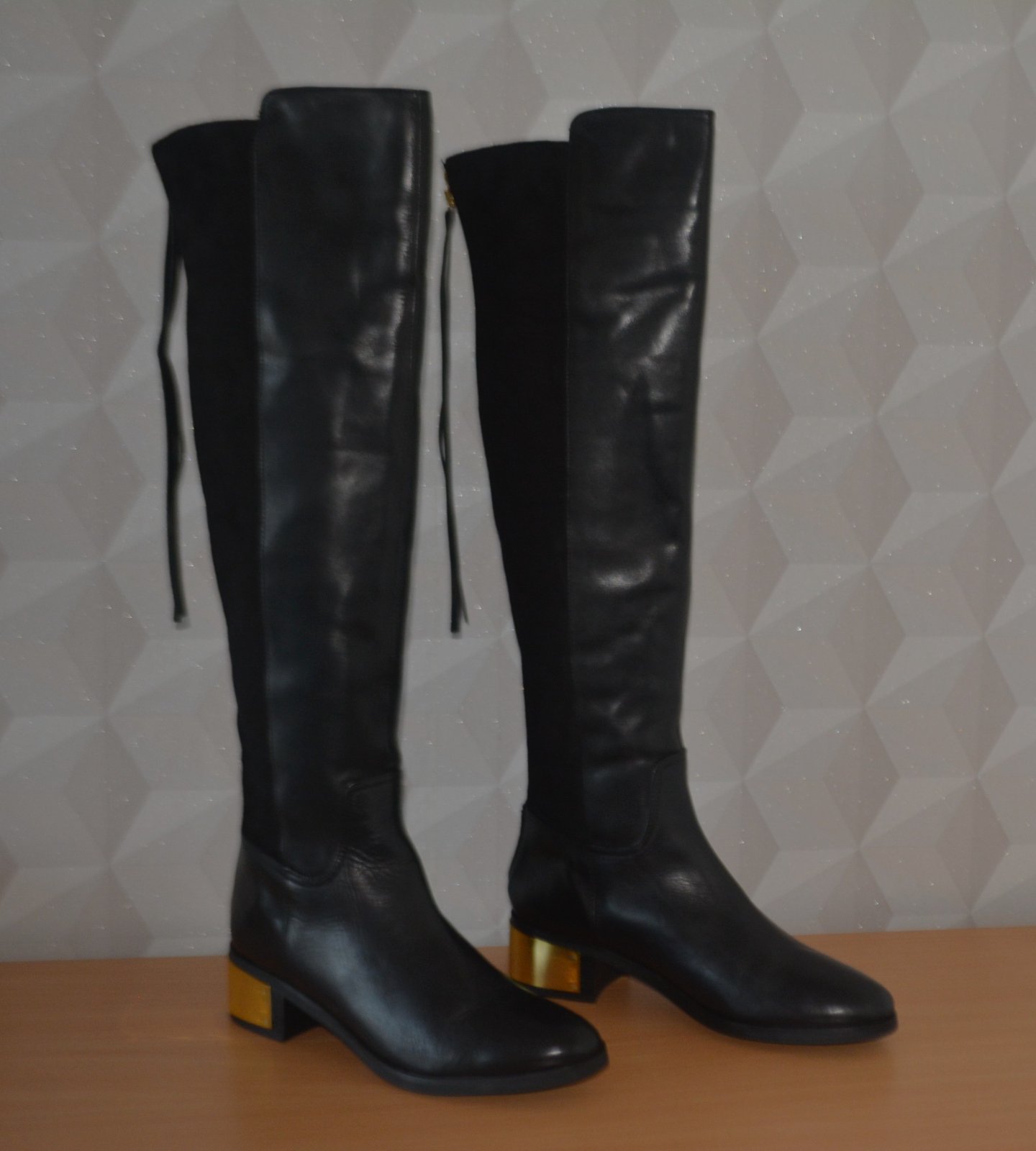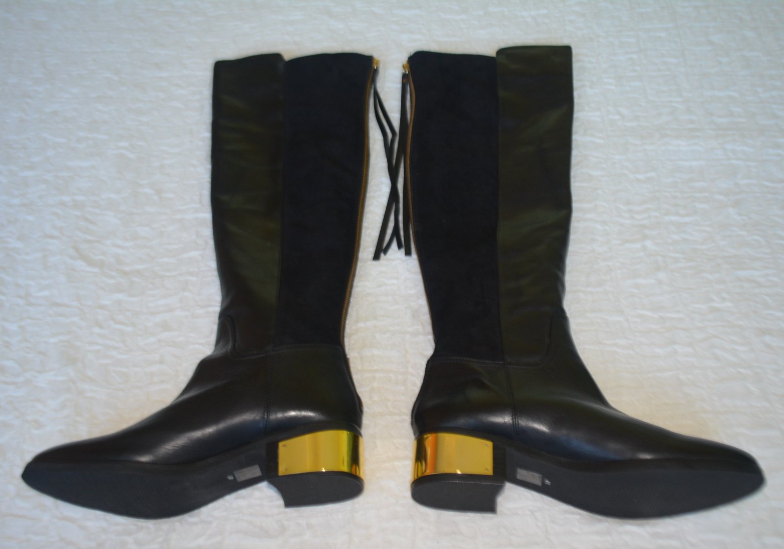 Čižmy zn. KG Kurt Geiger sú moderné elegantné kožené čižmy po kolená s okrúhlou špičkou, koženou prednou časťou kontrastujúcou so semišovou zadnou časťou, 4,5 cm zlatým podpätkom a zipsom po celej dĺžke s dlhým strapcovým zipsom.