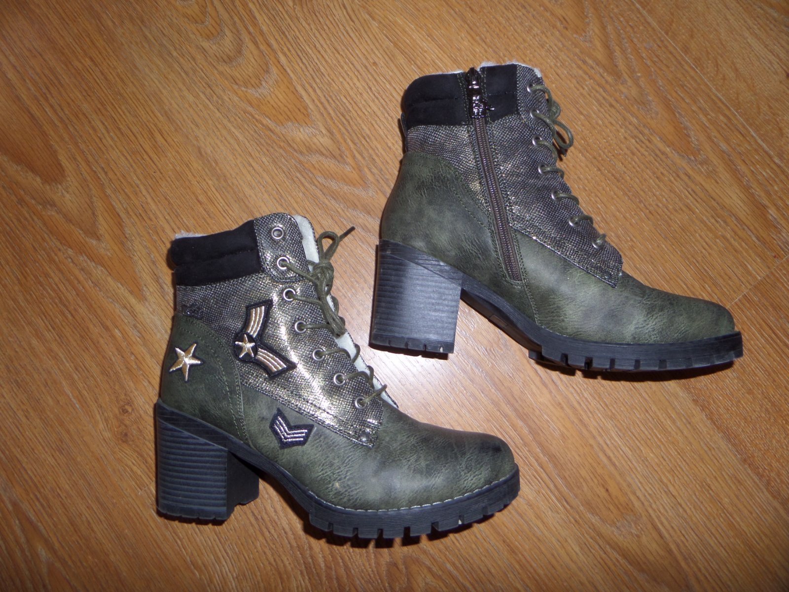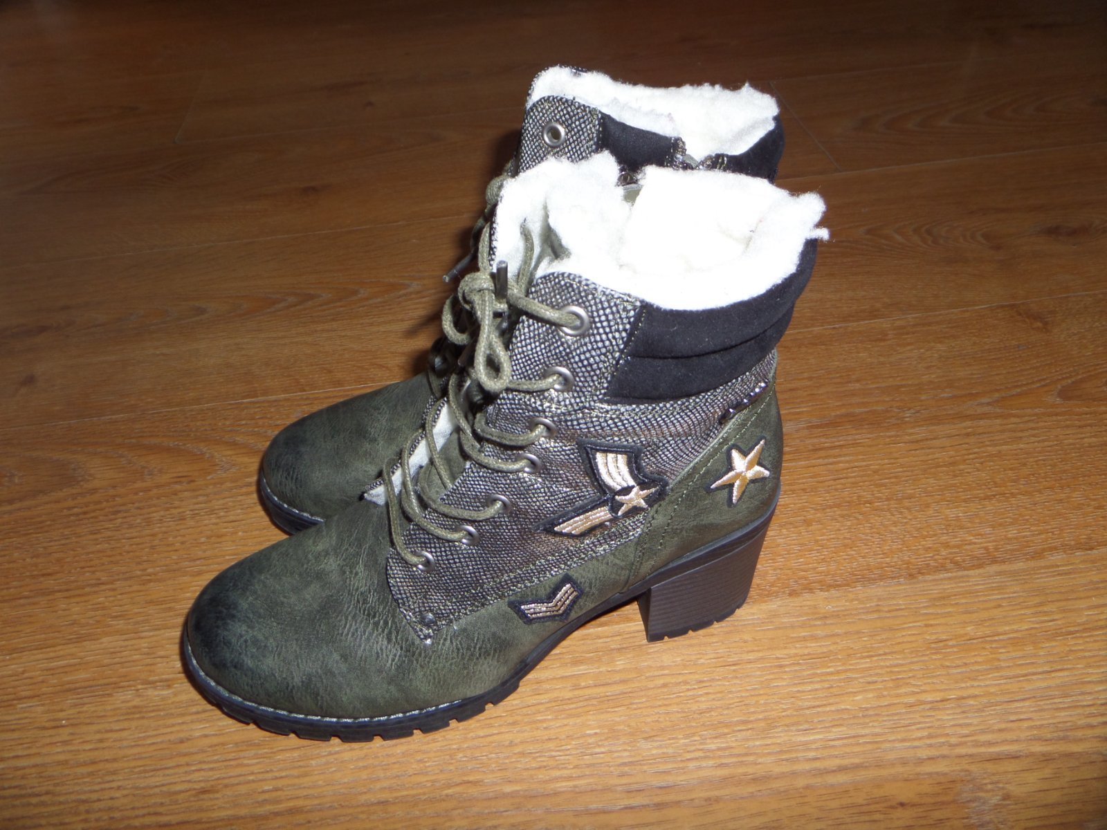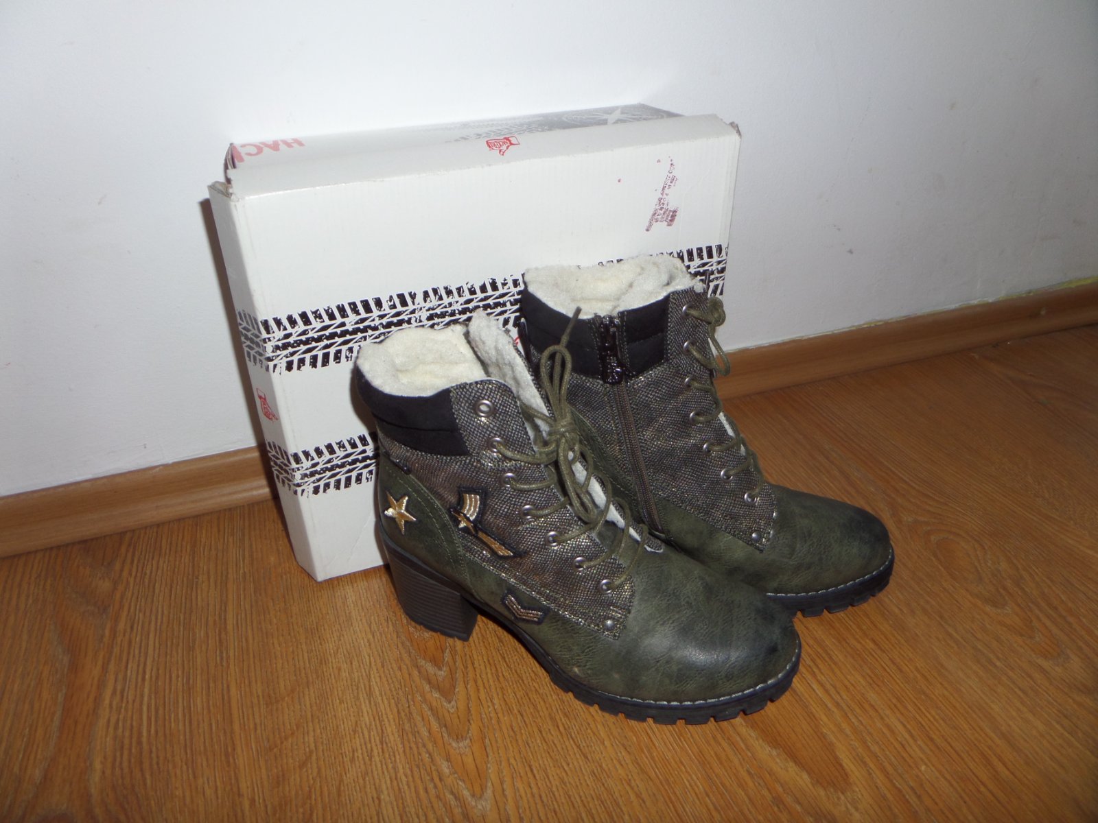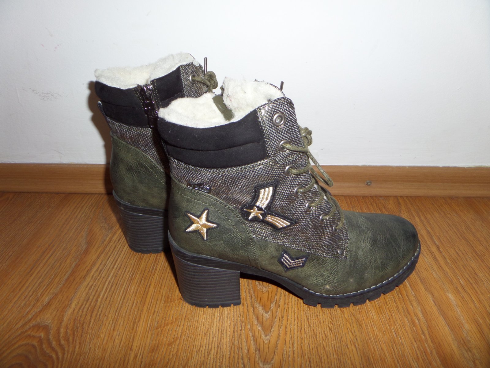 Čižmy sú v super stave, až na dve maličké asi milimetrove oskretia (niekde som zakopla). Nosené minimálne, zateplene, strapce okolo členkov sa dajú odopnut.