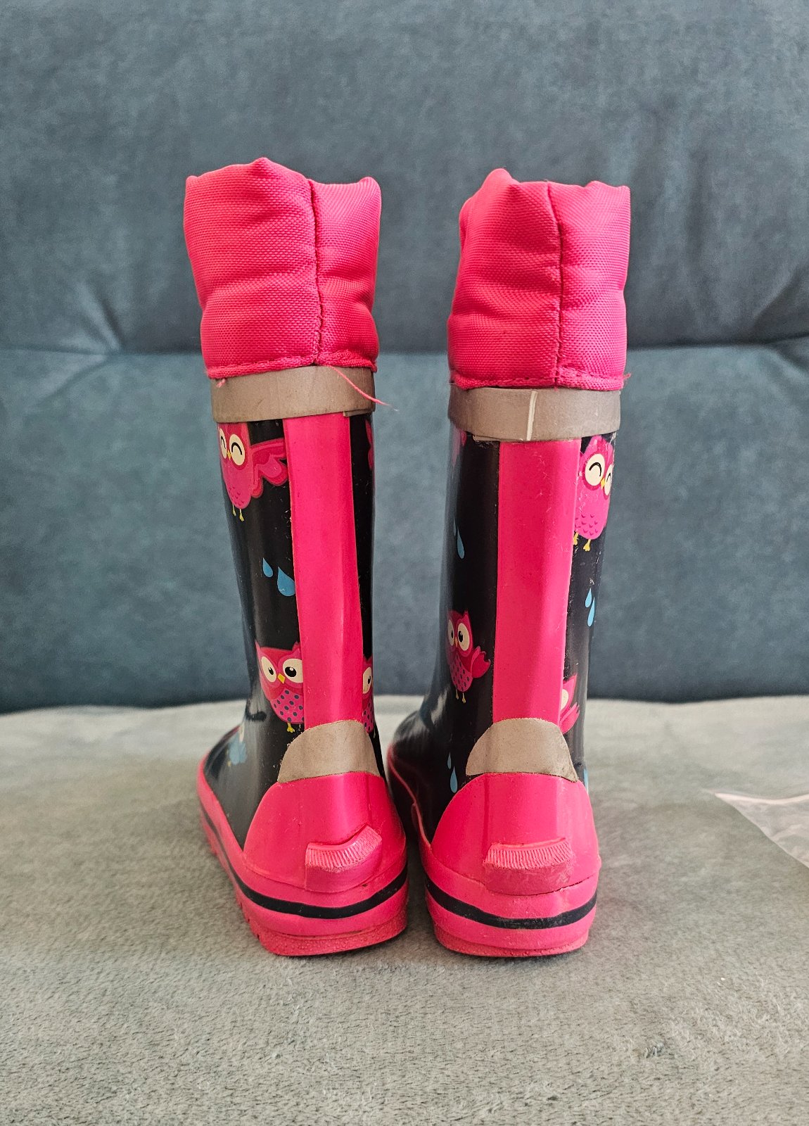 Gumáky do dažďa s hrejivou podšívkou z plyšu a vložkami do topánok navyše na vyrovnanie veľkosti (tie sú rozbalené), s reflexnými prvkami. Obuté najviac 5x, napriek tomu dcéra stihla urobiť fľaky n...