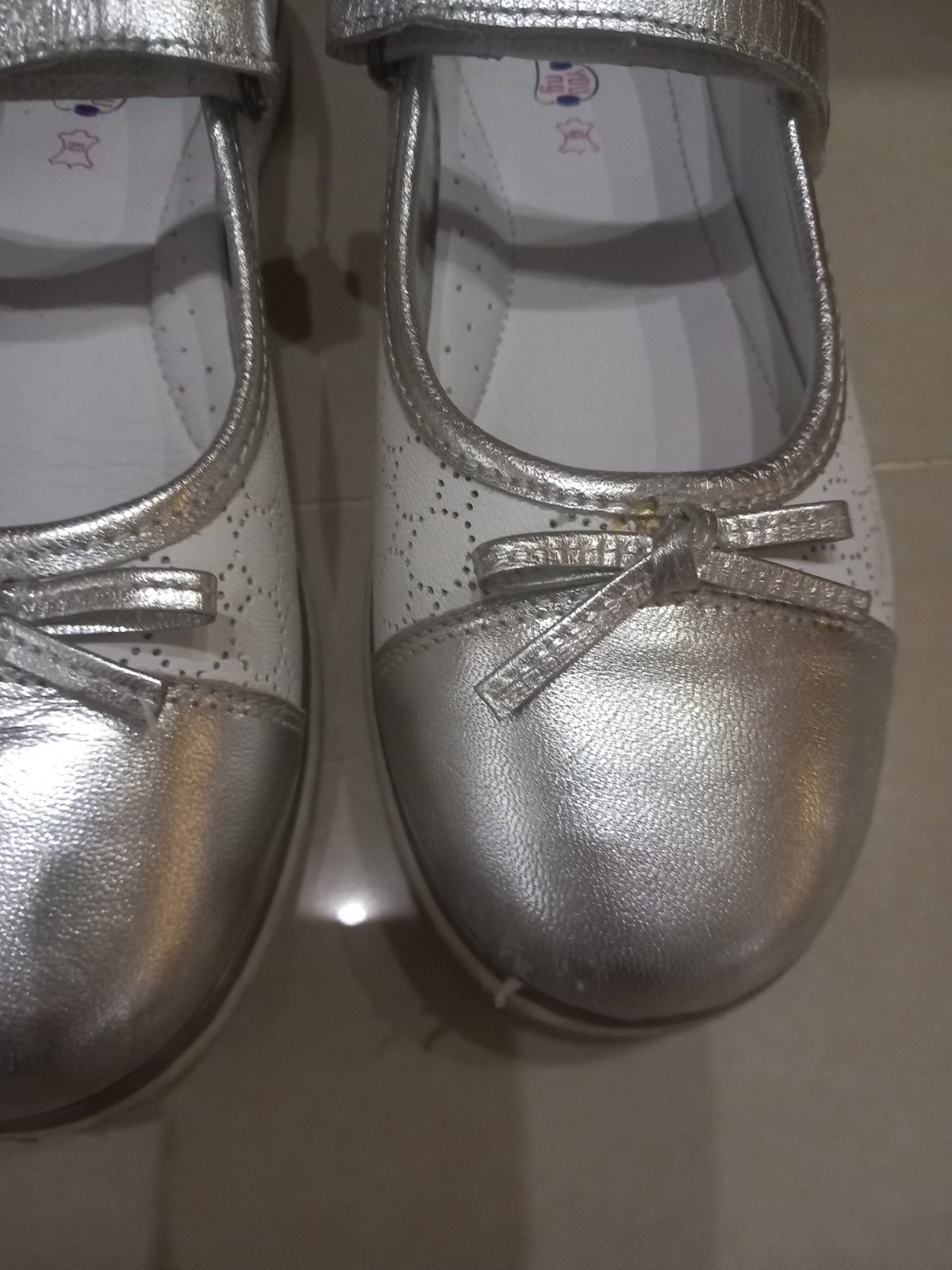 Krásne baleriny vo výbornom stave, uvedený materiál je ekologická koža, kožená tvarovaná stielka, zapínanie na suchý zips, vnútorná dĺžka je 23,5cm.