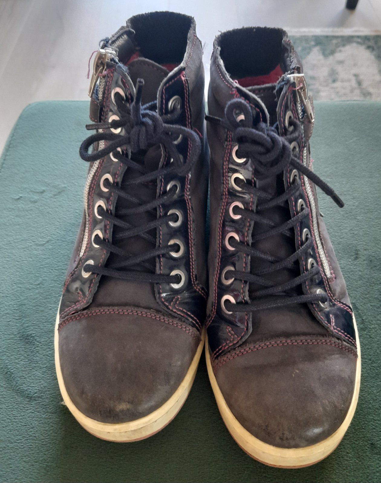 Predám zateplené kotníkove topánky, zapínanie na boku na zips, vpredu na šnúrky, bežné známky nosenia, ešte poslúžia, veľkosť 32, vnútorná dĺžka cc 20,5cm. Mierne zateplené.