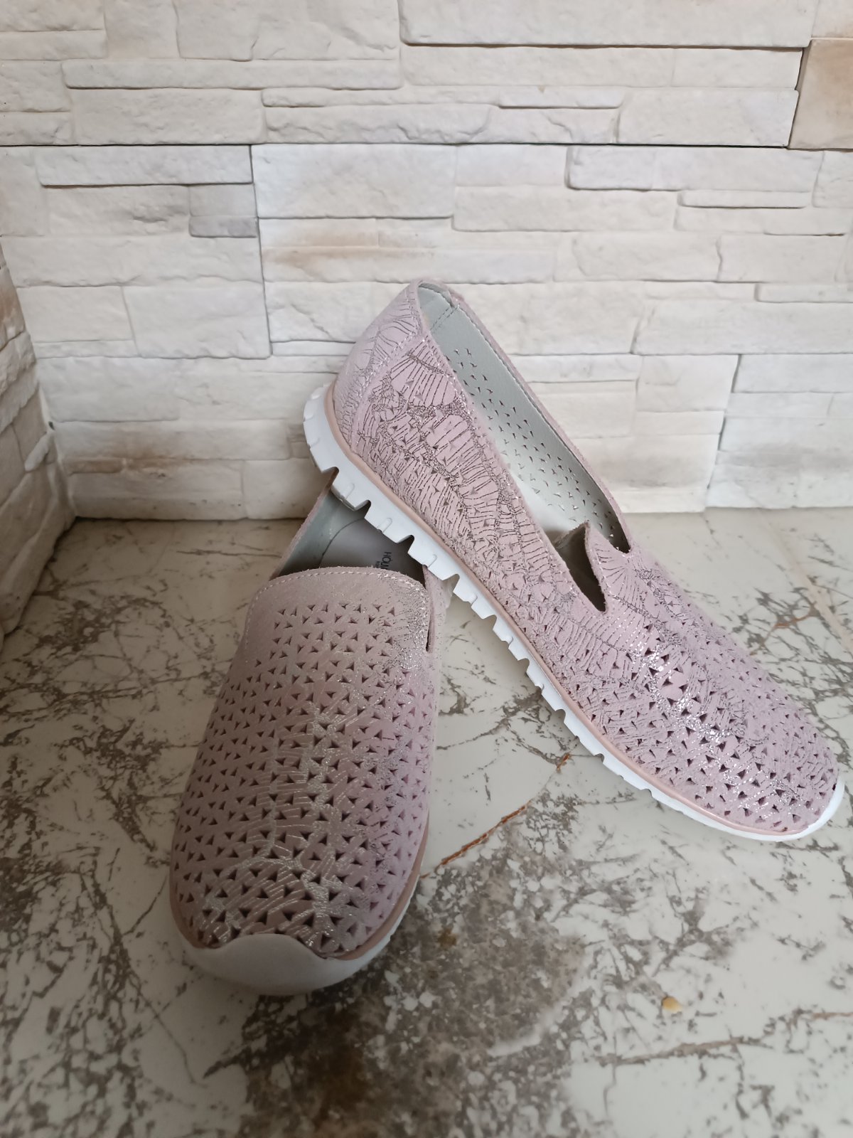 Farba je bledo ružová so strieborným. Bez poškodenia. Ako nové, pár krát použité. Pravá koža. Vnútorná dĺžka 24,5 cm.