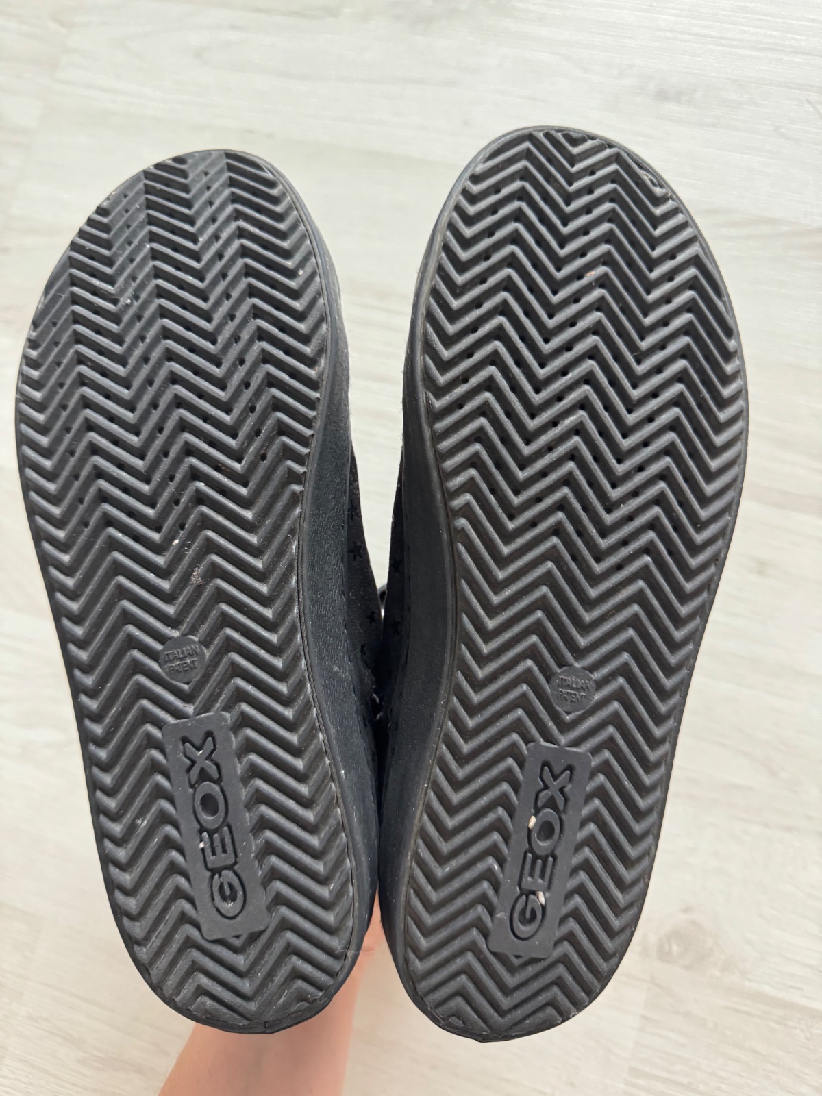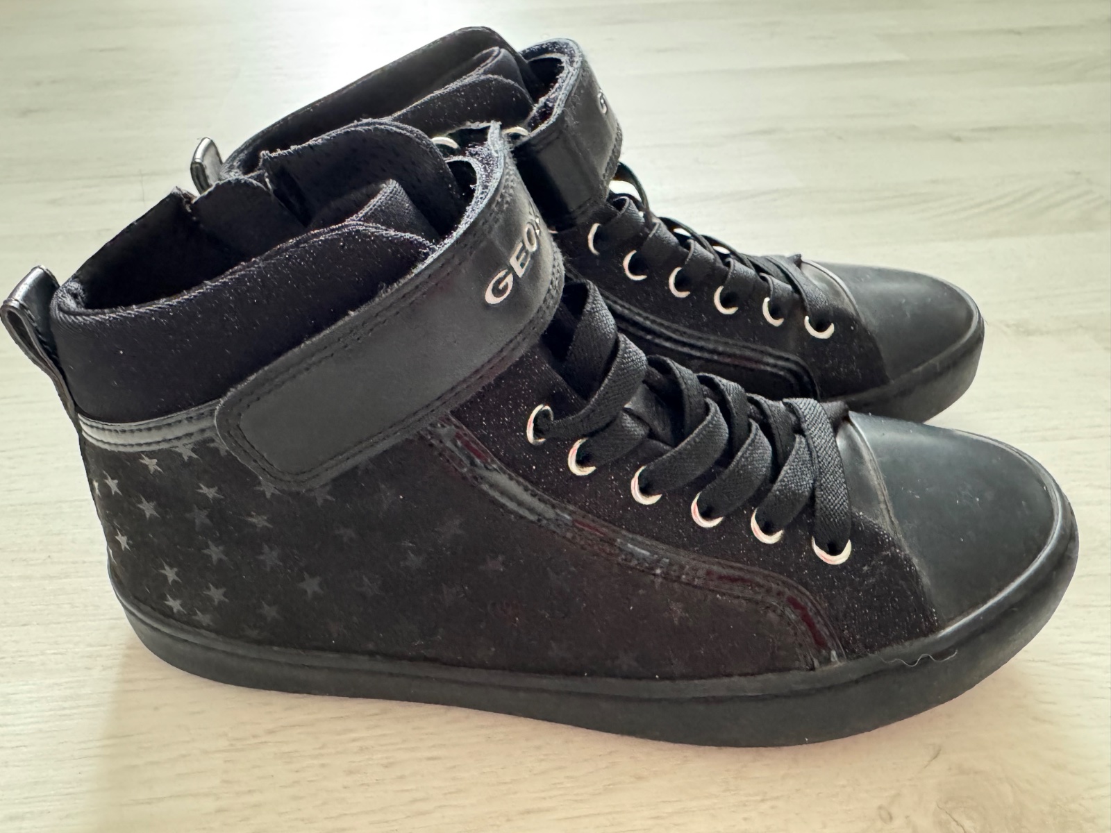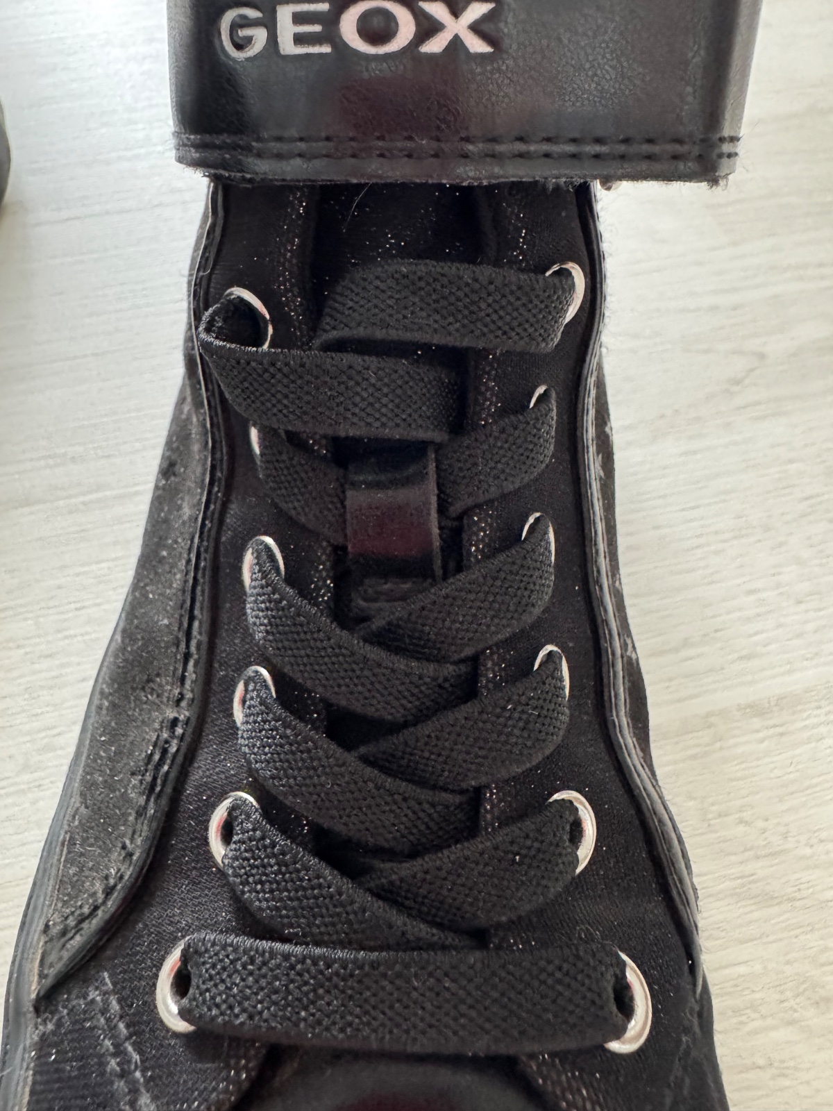 Tenisky v peknom stave po mojej dcére, kombinácia čiernej s lesklou látkou, maju zvnútra jemne oskretie(vid foto),nic hrozne.