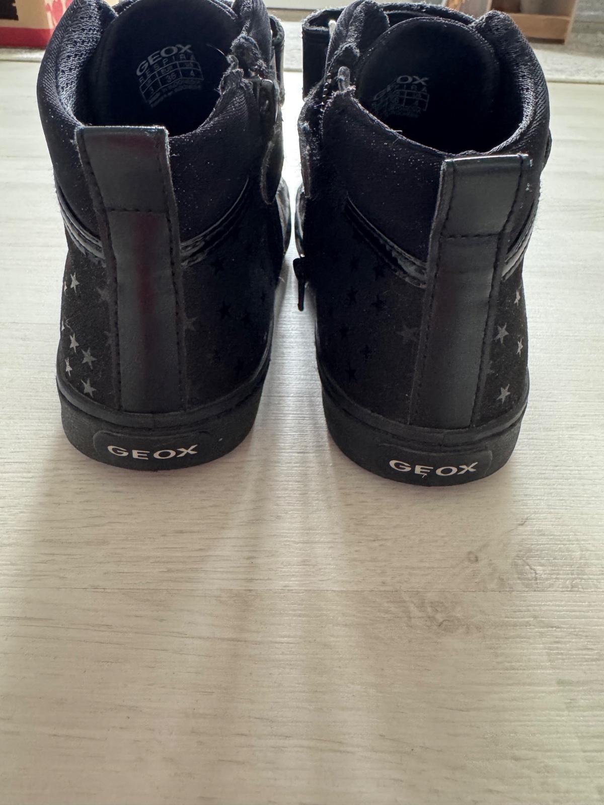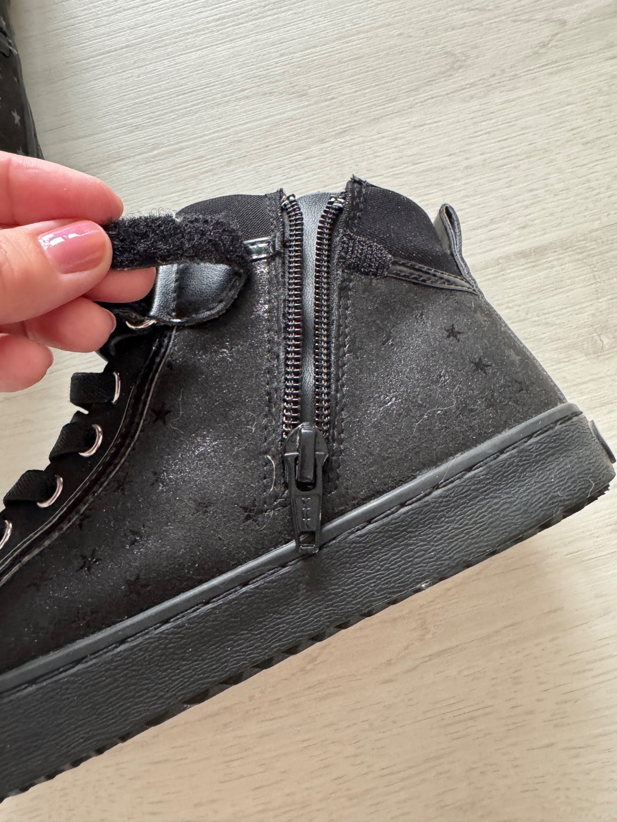 Predam malo nosene tenisky nad clenky-cierne s hviezdickami. Snurky su z gumy, cize sa nesnuruju, su na suchy zips a zboku je klasicky zips.