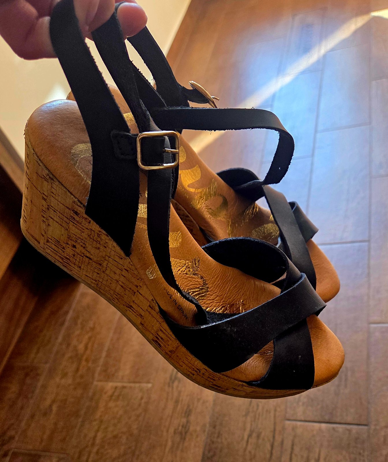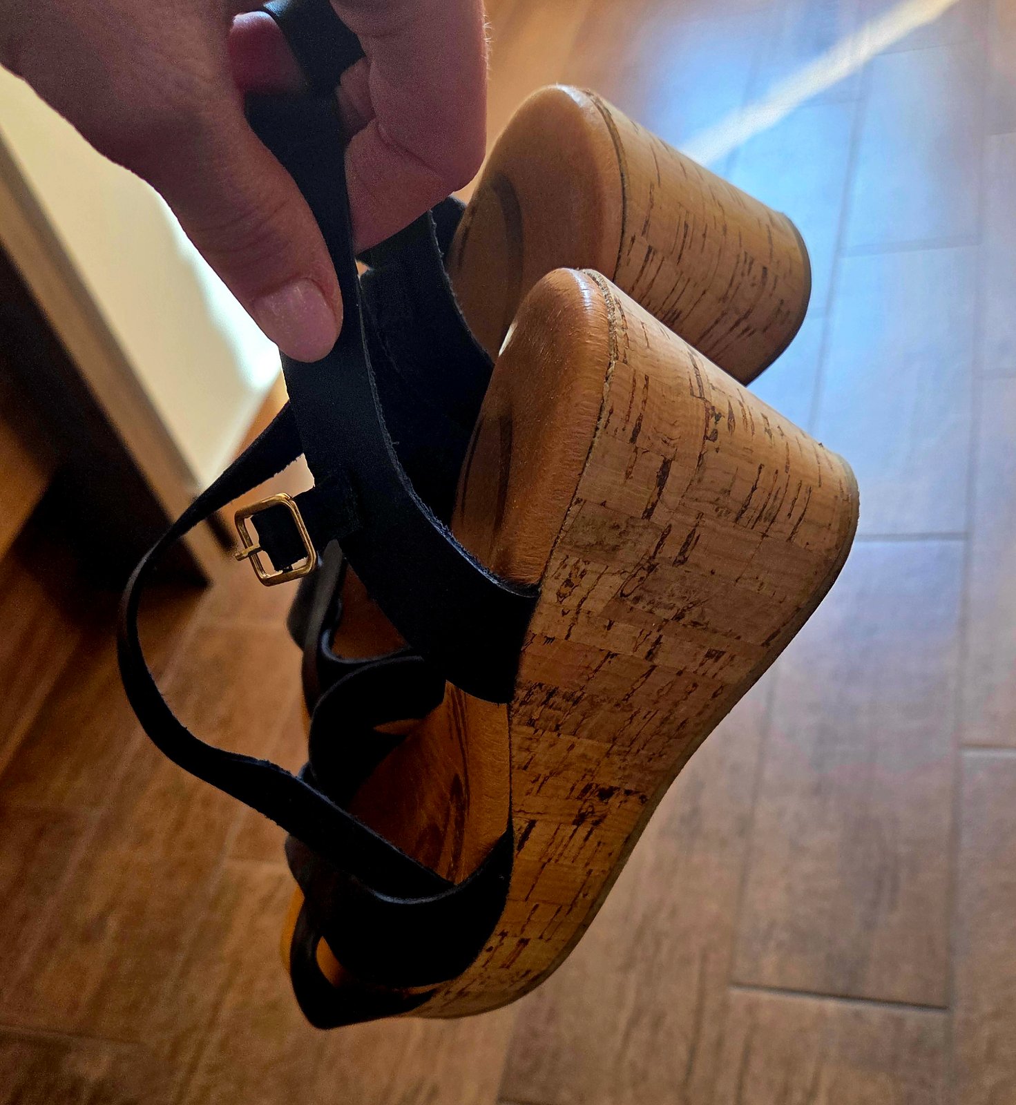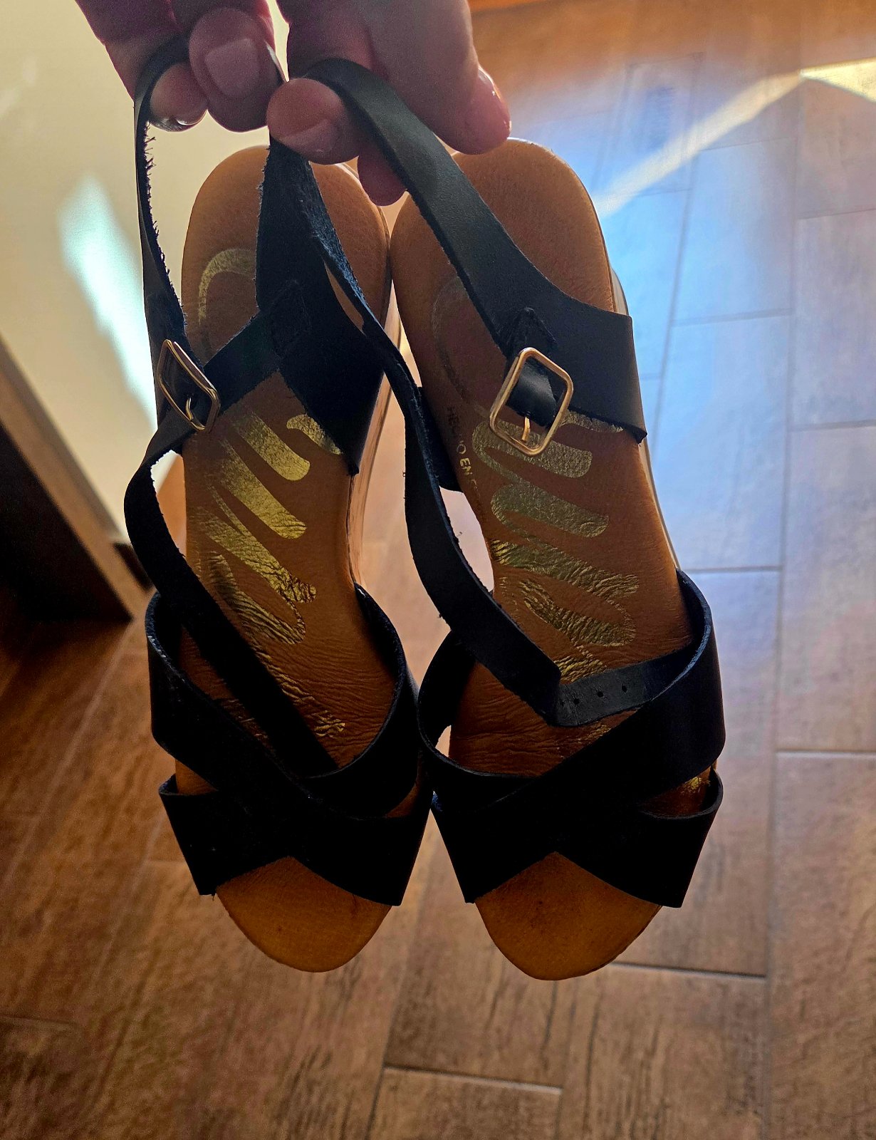 Pekne sandale guess.mne veľké. Oskretia boli opravené ale nevidno. Výška opátka 8cm.