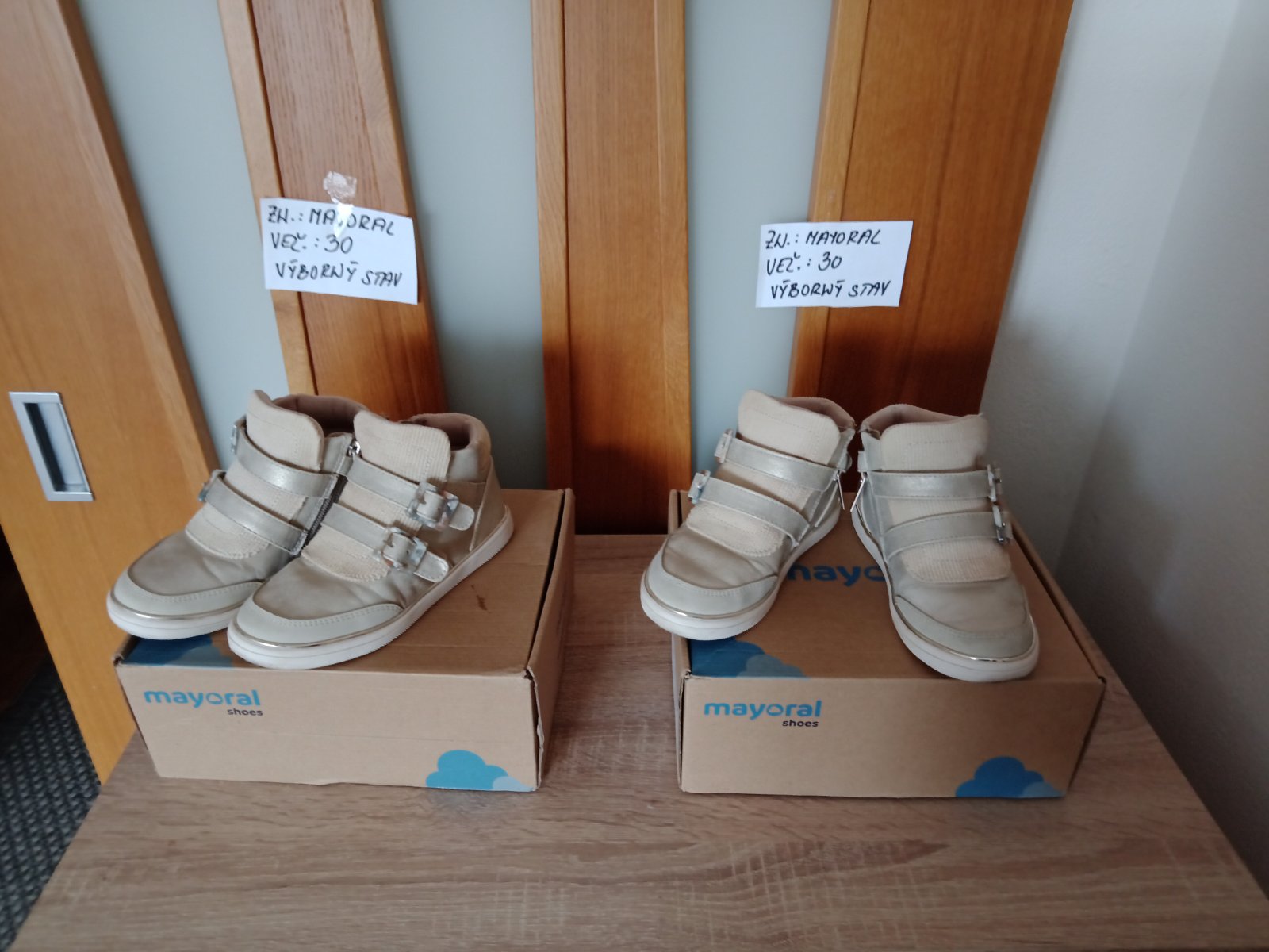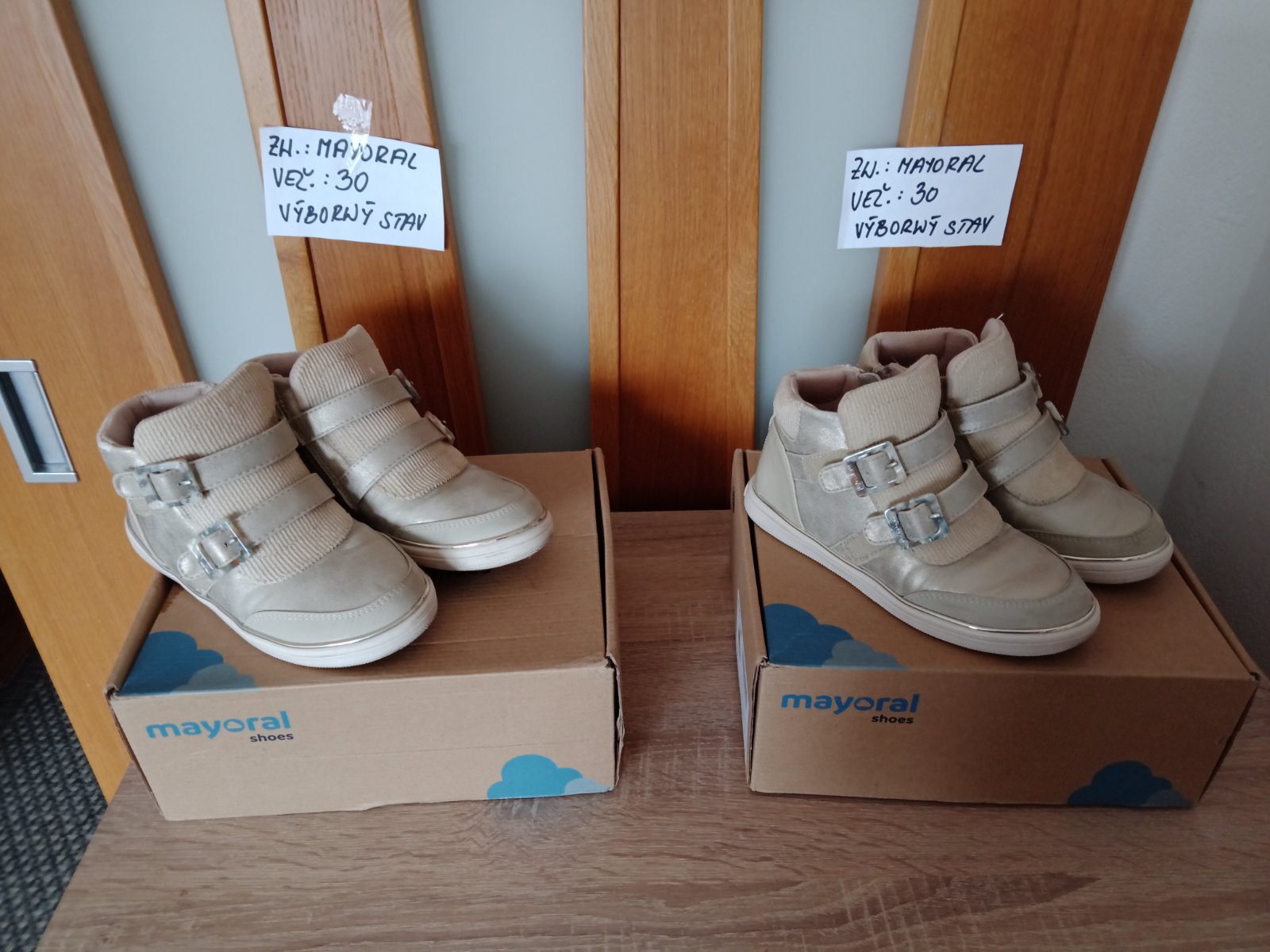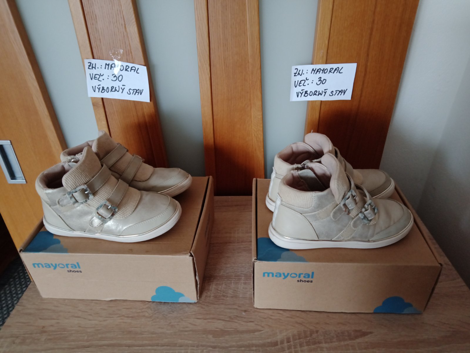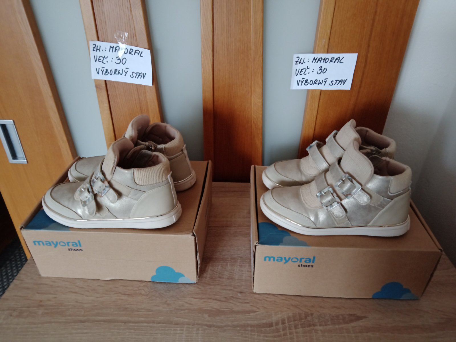 Prechodné topánky zn.Mayoral veľ.30,vo výbornom stave,farba je zlatá,cena za pár je 14eur.