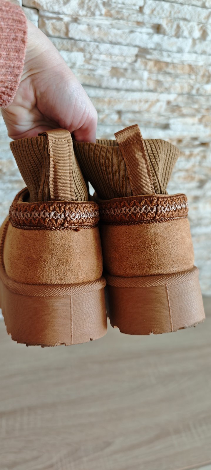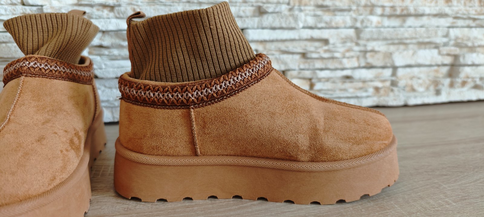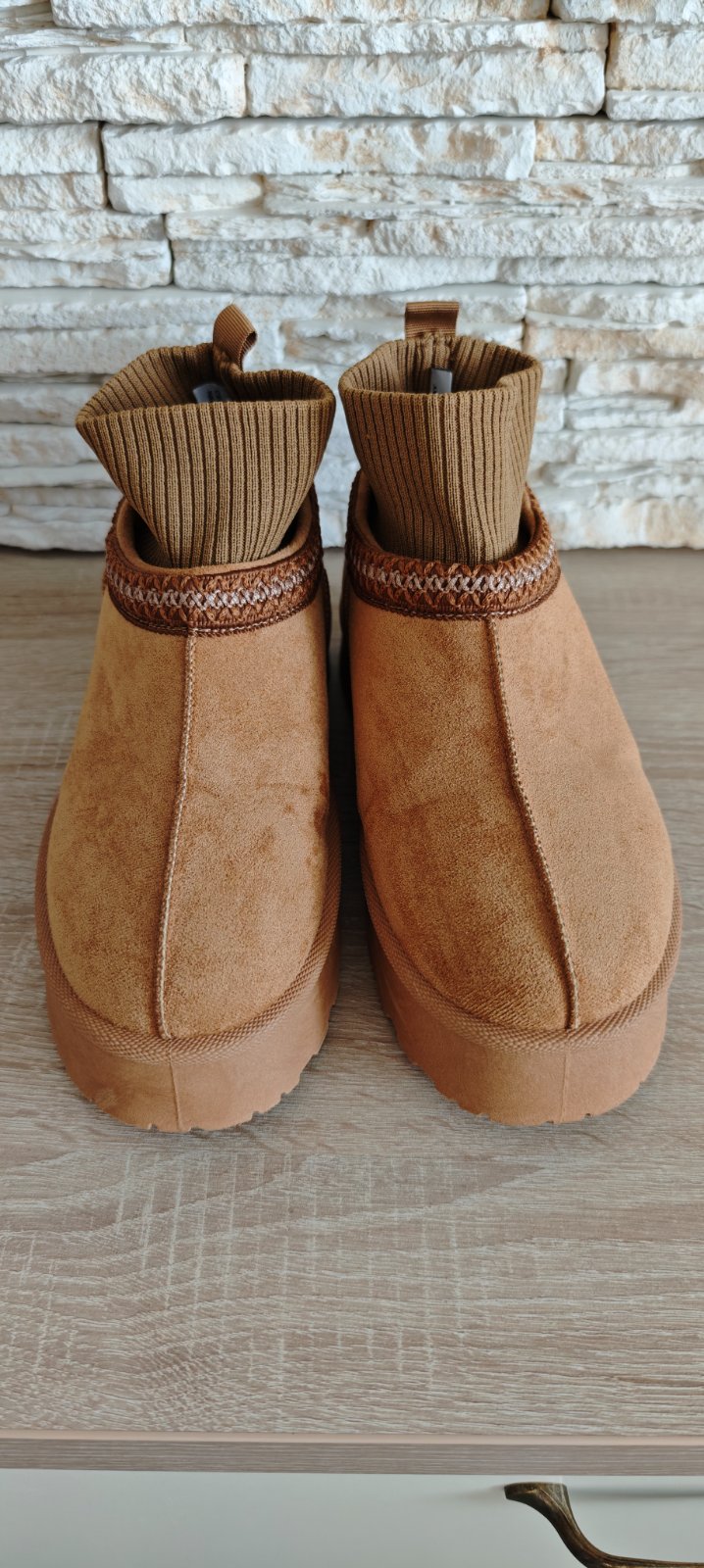 Predám tieto raz použité dámske semišové členkové topánky/našuchovačky v ťavej farbe. Štýl "UGG", ale nie sú samozrejme pravé. Veľkosť písaná 40, ale sú vhodné na veľkosti 39, vnútorná dĺžka cca a25,3-25,5 CM (sedia na nohu 39). Mám veľa obuvi, nevyužijem. Osobný odber v Petržalke. Poštou alebo cez Packetu pošlem po pripísaní platby na účet.