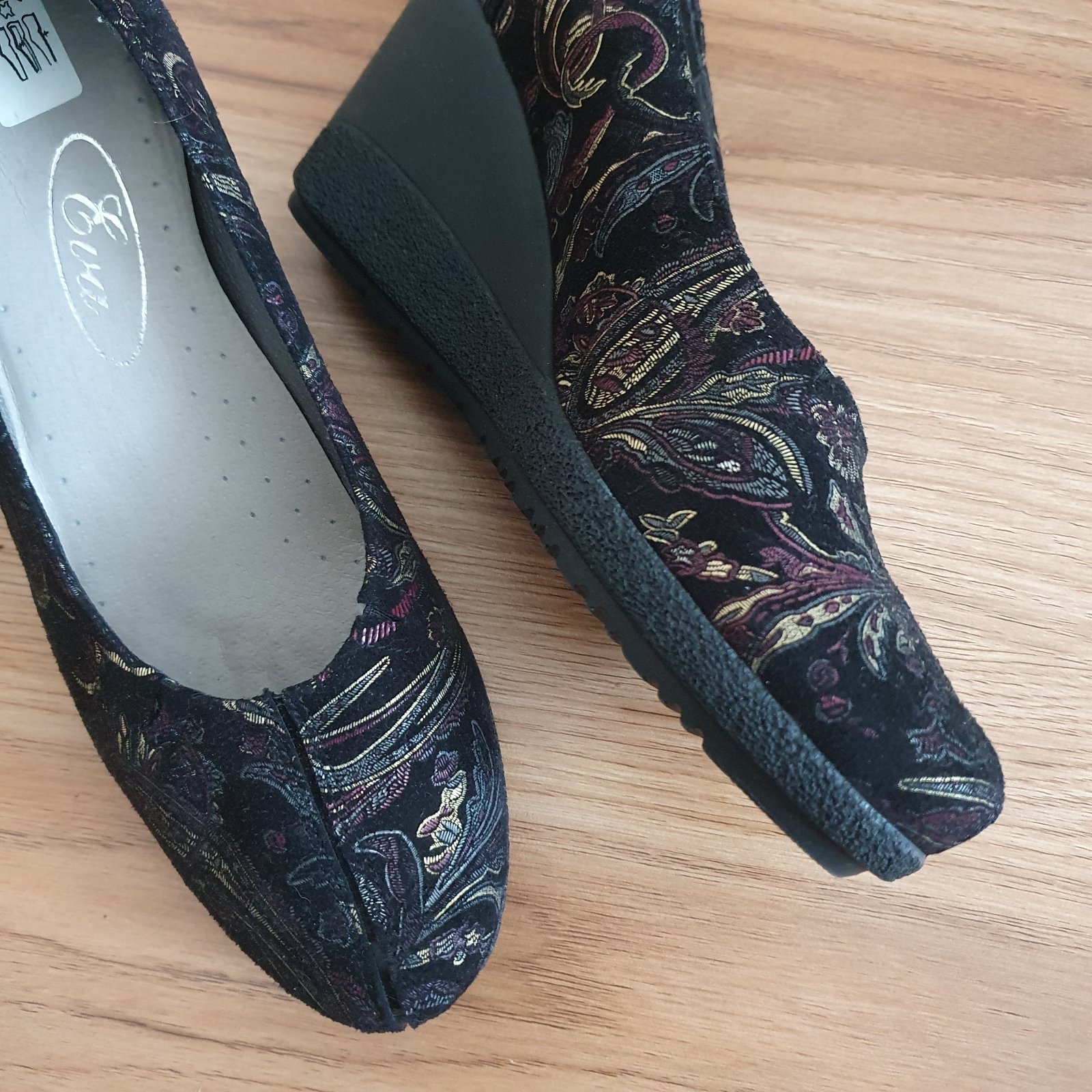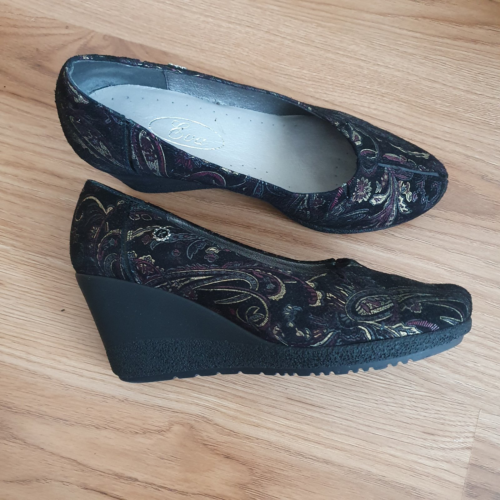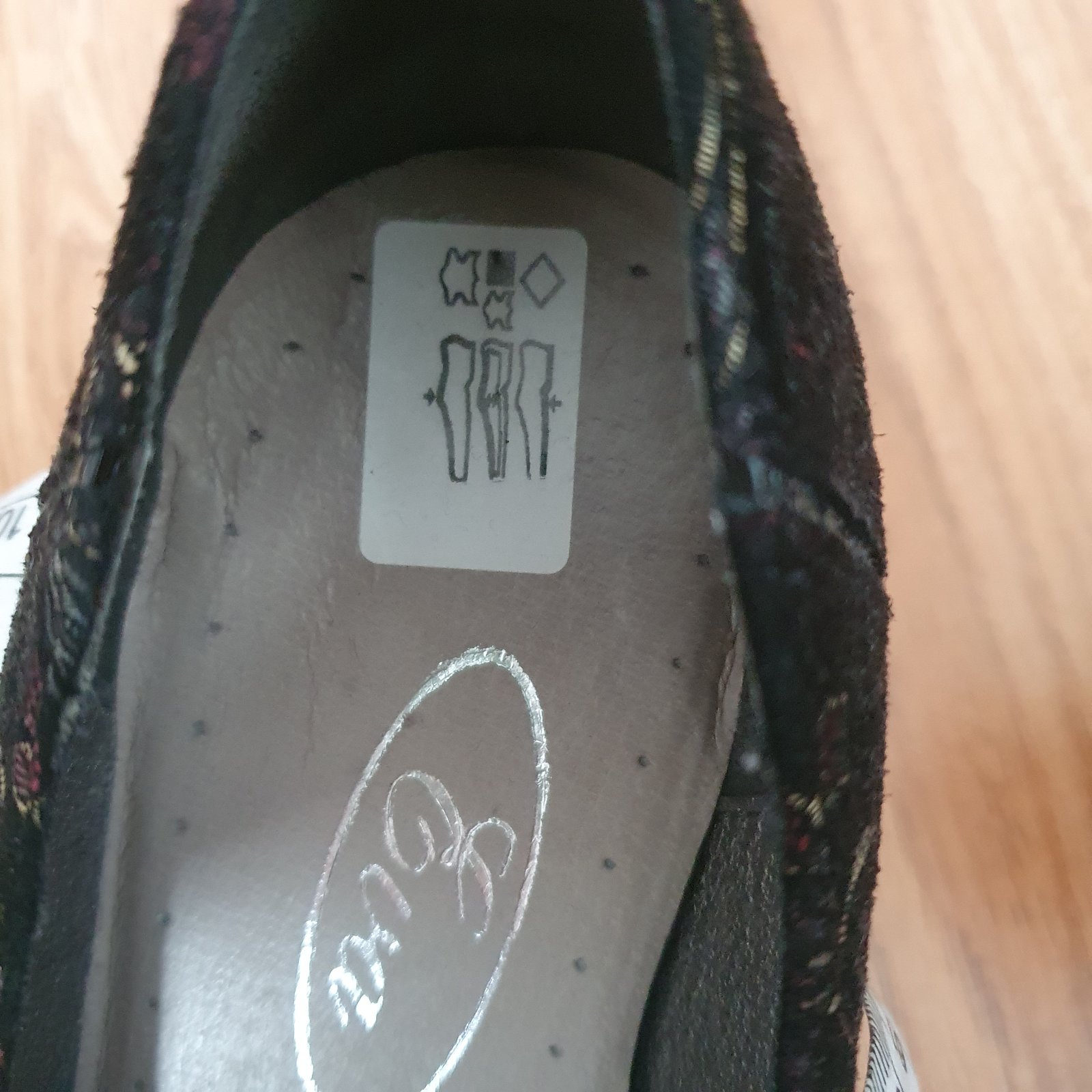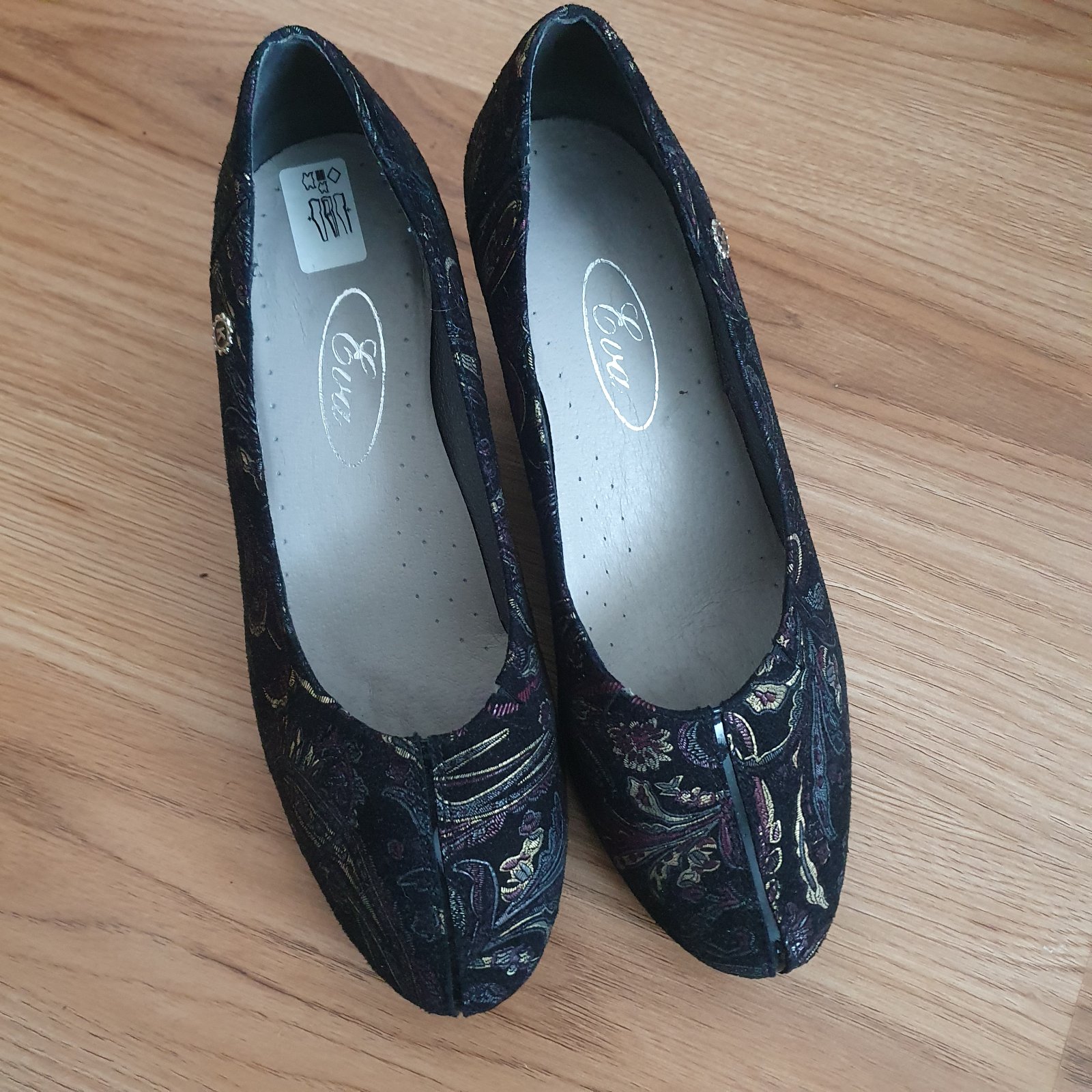 Výborný stav, ako nové. Predaj zo zdravotných dôvodov. Vnútorná dĺžka 25 cm, opätok 7 cm. Základná farba je čierna s výšivkou. Cena je bez pošty.