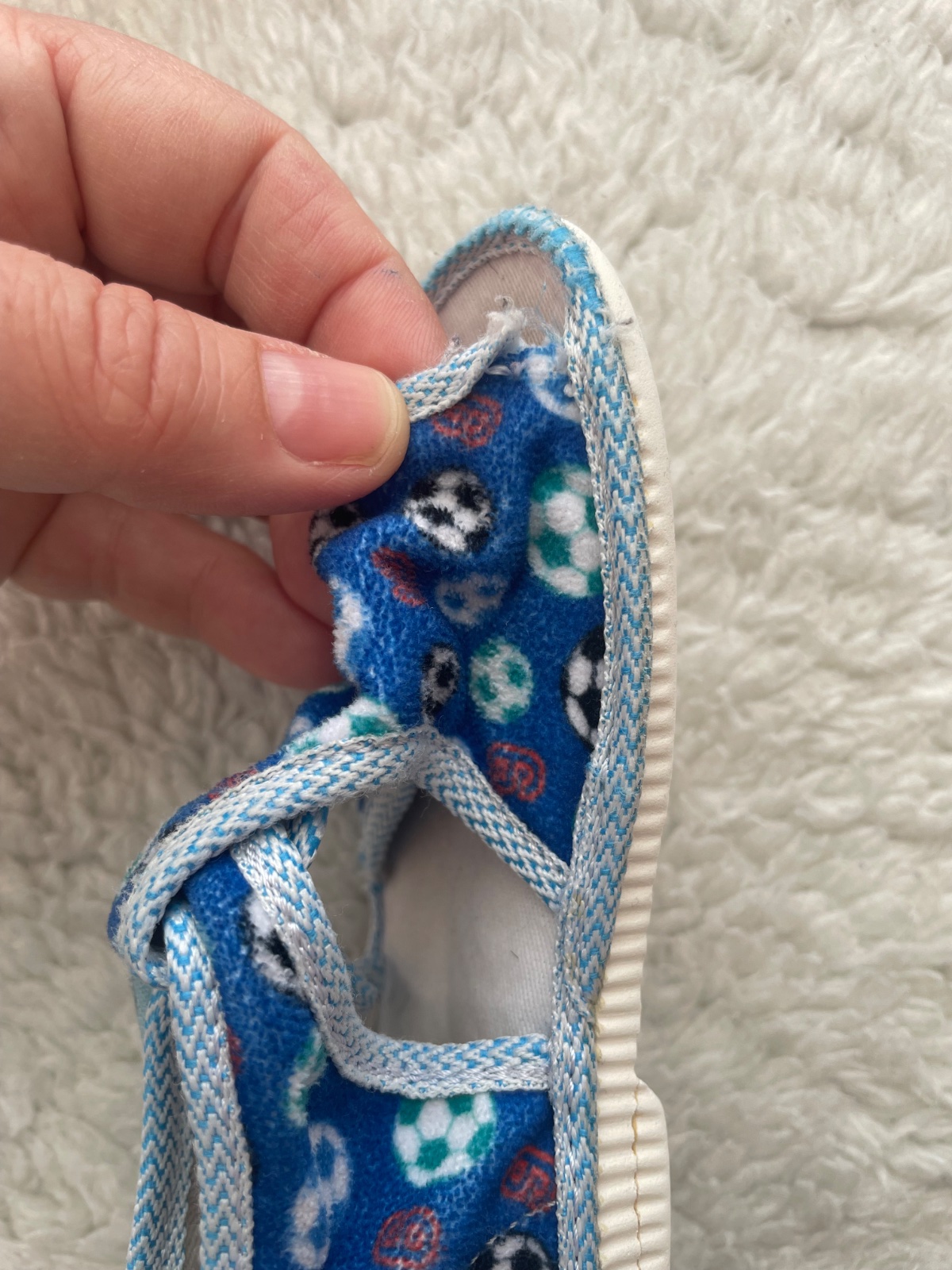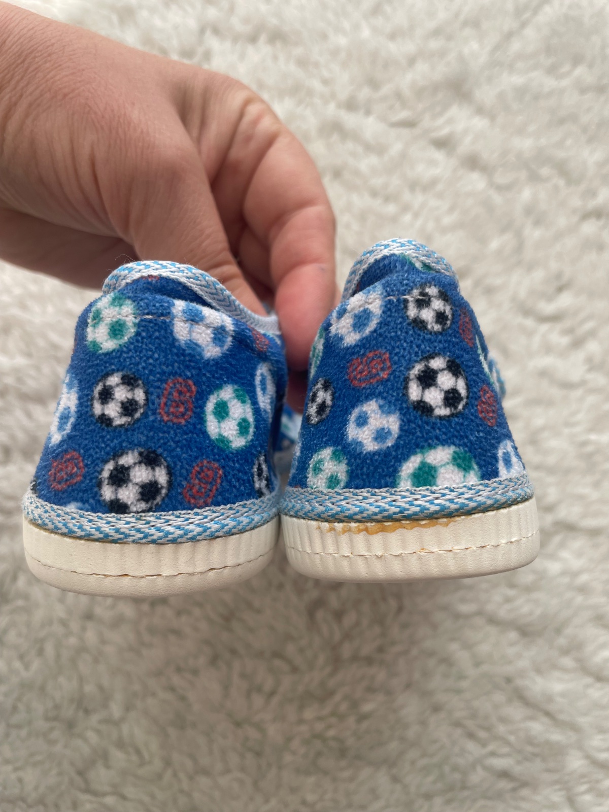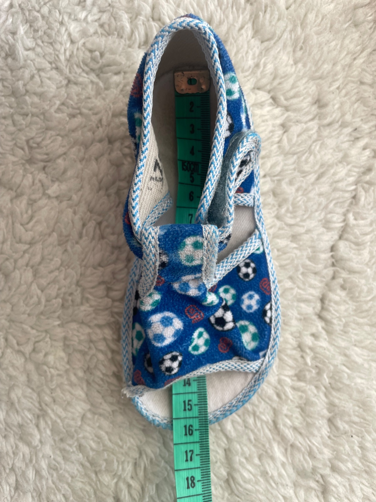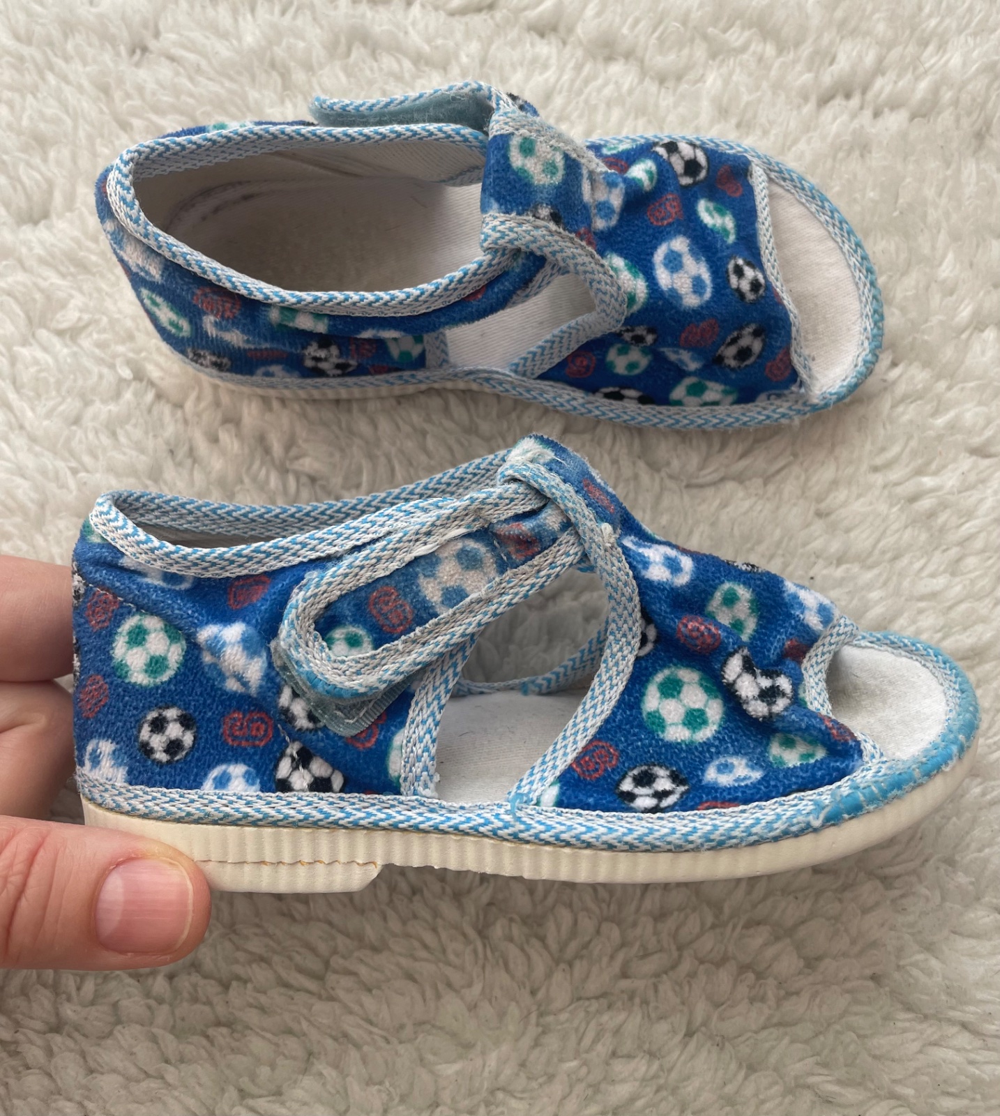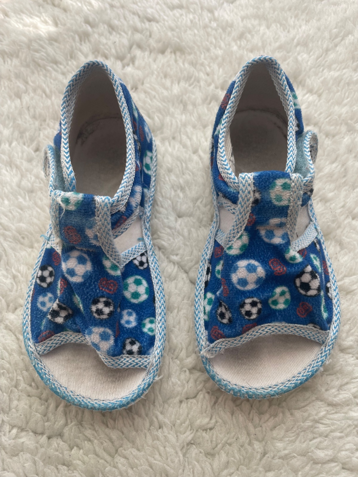 Semisove papucky v modrej farbe s farebnymi futbalovymi loptami zn.Manik vo velkosti 23, ortopedicka stielka, lepaky su funkcne, neschodene, na latke vidiet nosenie, napredu rozparane, da sa prisit, nosili sme v skolke, su podpisane, papucky su oprate. Vnutorna dlzka 15 cm