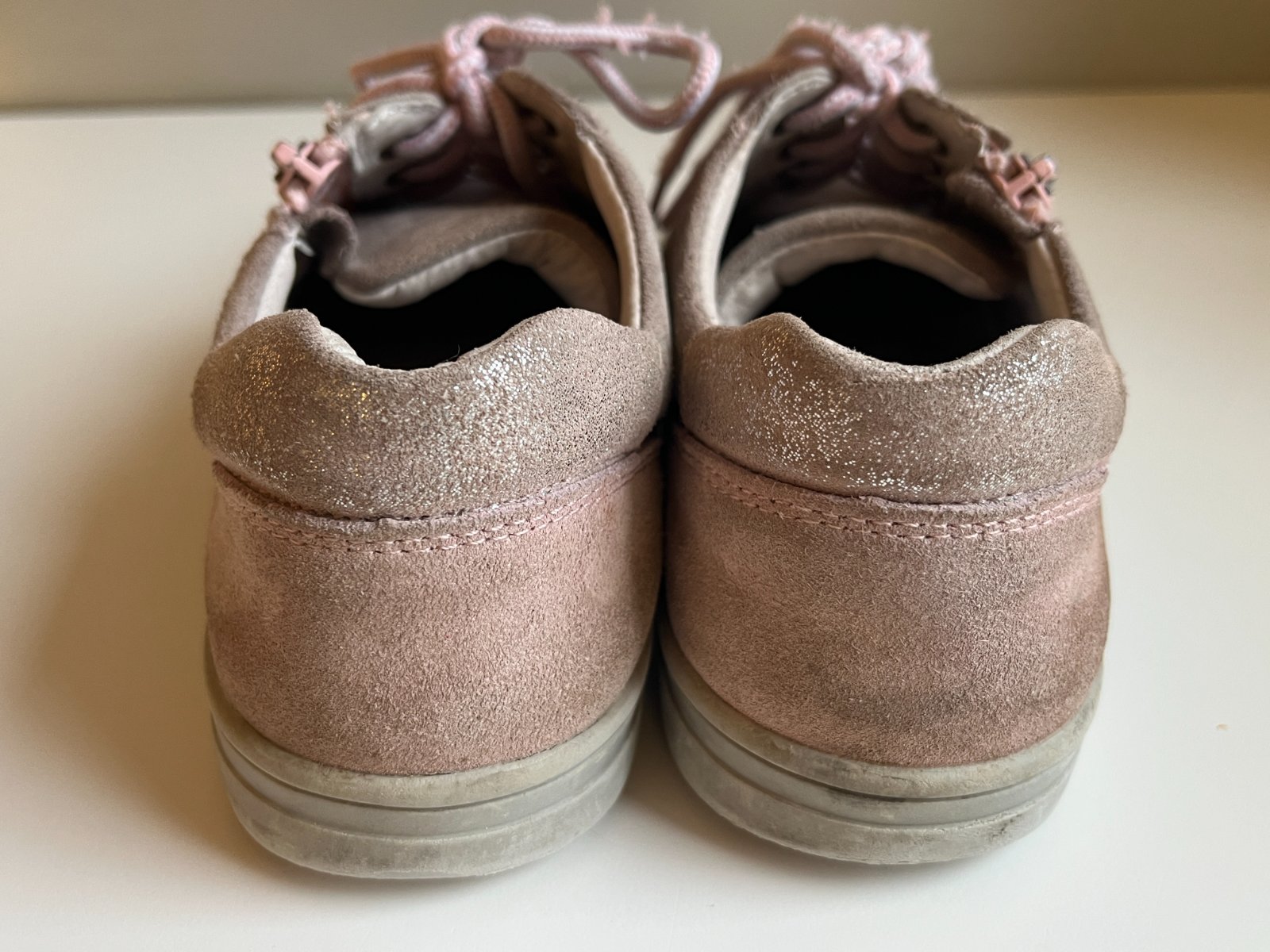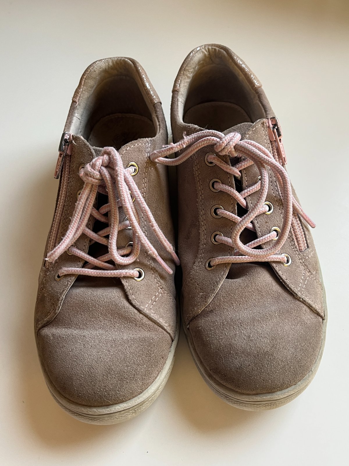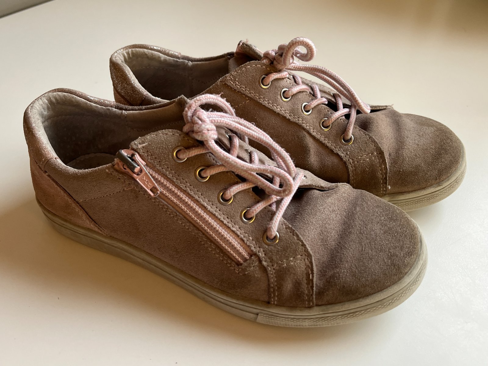 Krásne tenisky Protetika z brúsenej kože s ortopedickou vložkou. Majú šnurovanie, ale obúvať sa dajú ľahko pomocou zipsu na boku. Nosené pol roka, kým dcére nevyrástla noha. Na fotke vyzerajú akoby zašednuté, ale naživo sú v poriadku. Brúsená koža takto reaguje, nie je to chyba. Dĺžka vnútornej vložky 21,5 cm. Možný aj osobný odber Bratislava-Petržalka.