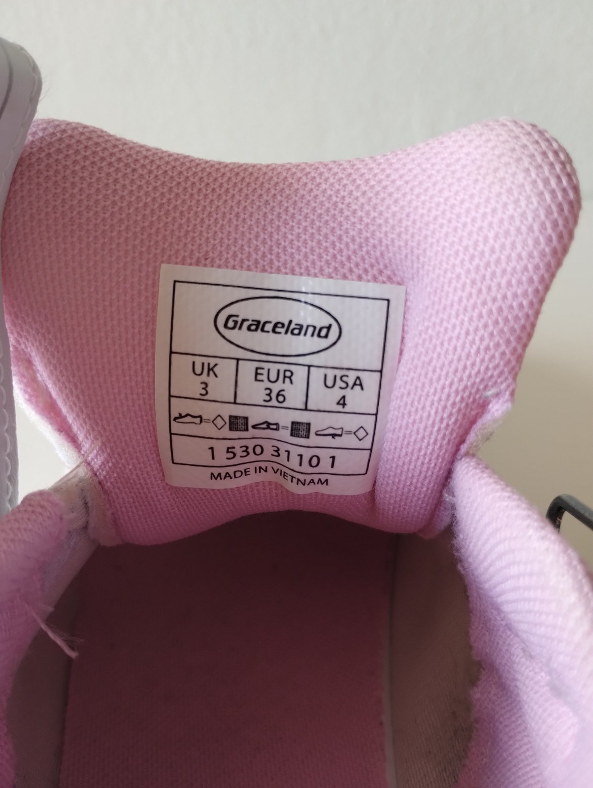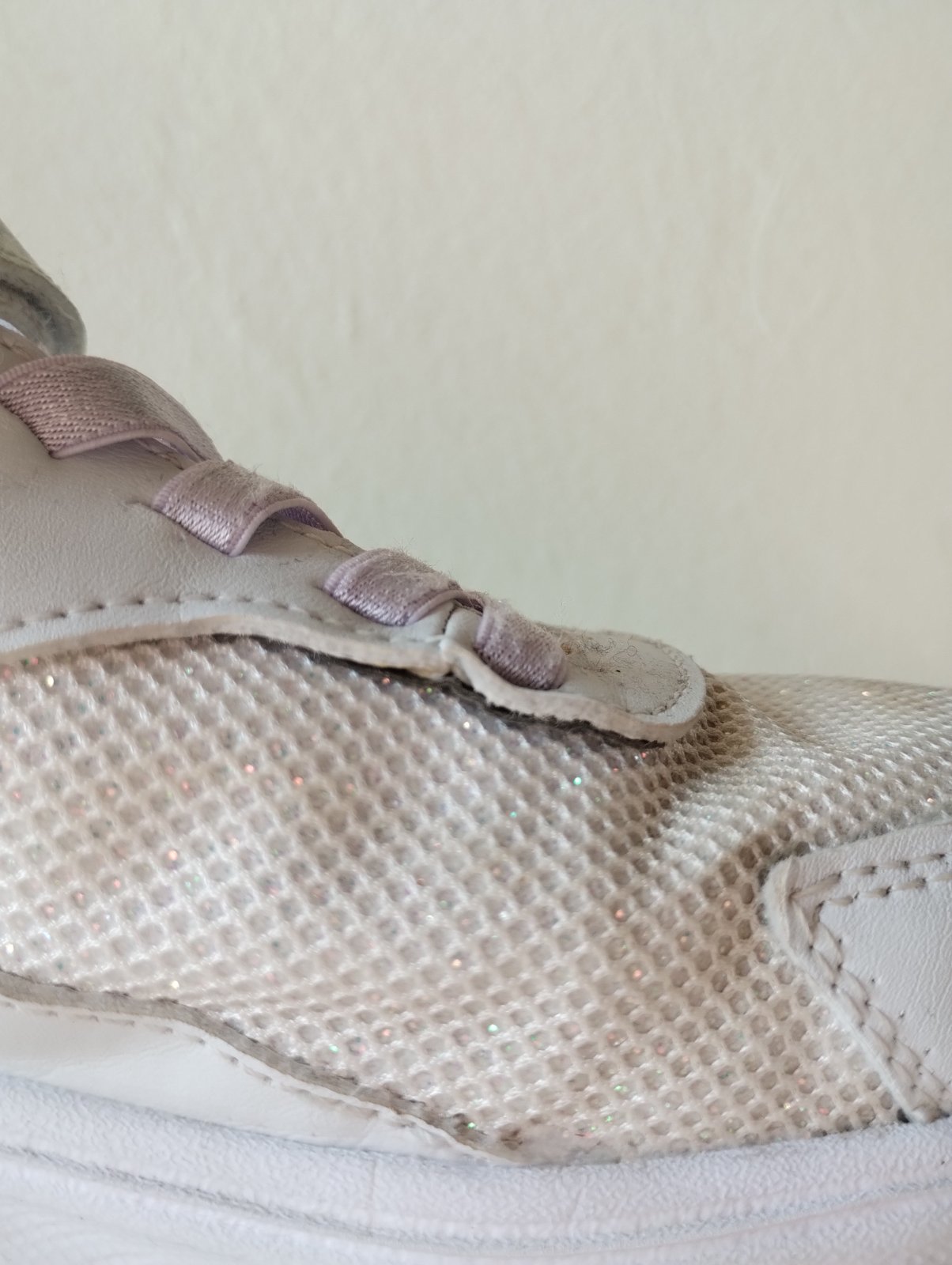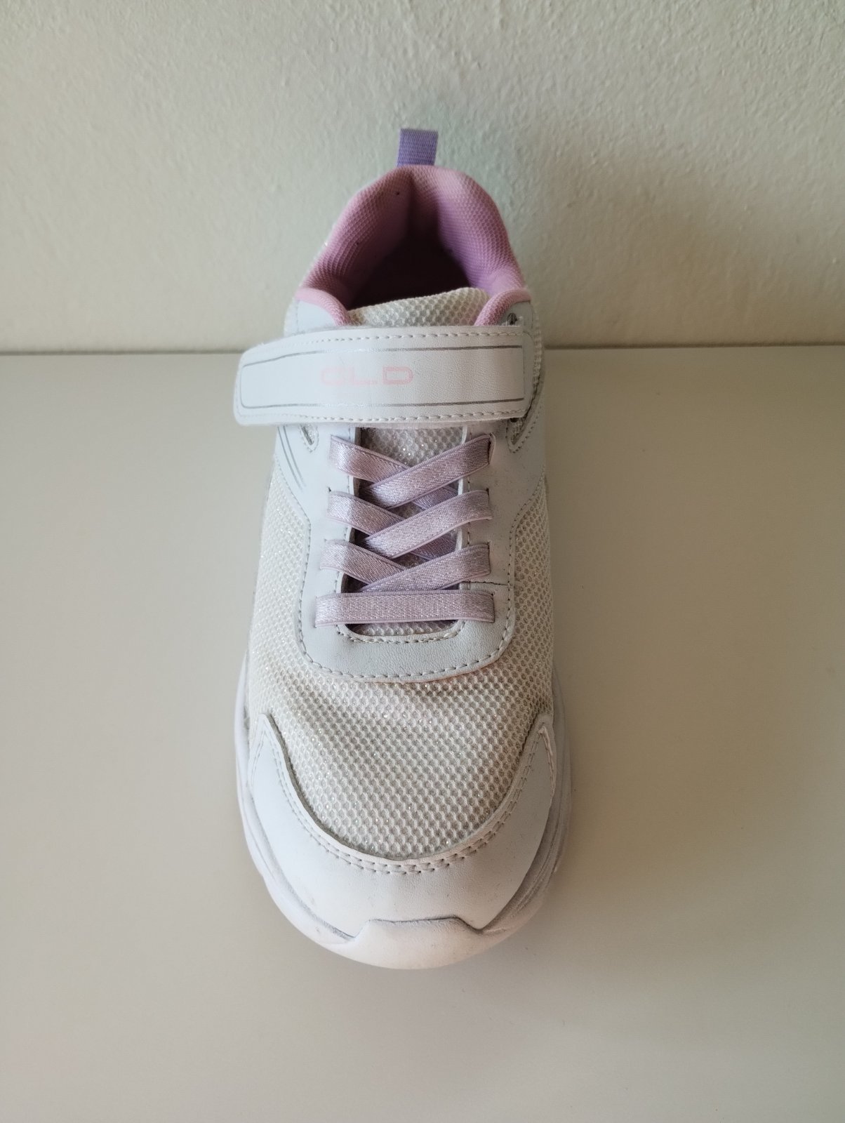 Biele tenisky pre dievčatá na suchý zips veľkosti 36 (vnútorná dĺžka 23,5 cm), vo veľmi dobrom stave bez poškodení, aj podrážka je iba minimálne zošúchaná, jediná chybička je že jedna topanočka je trošku zvláštne prilepená (viď posledné dve fotky) ale nikdy to nebol problém, neodlepuje sa ani to nie je vidno (všimla som si to až pri fotení)