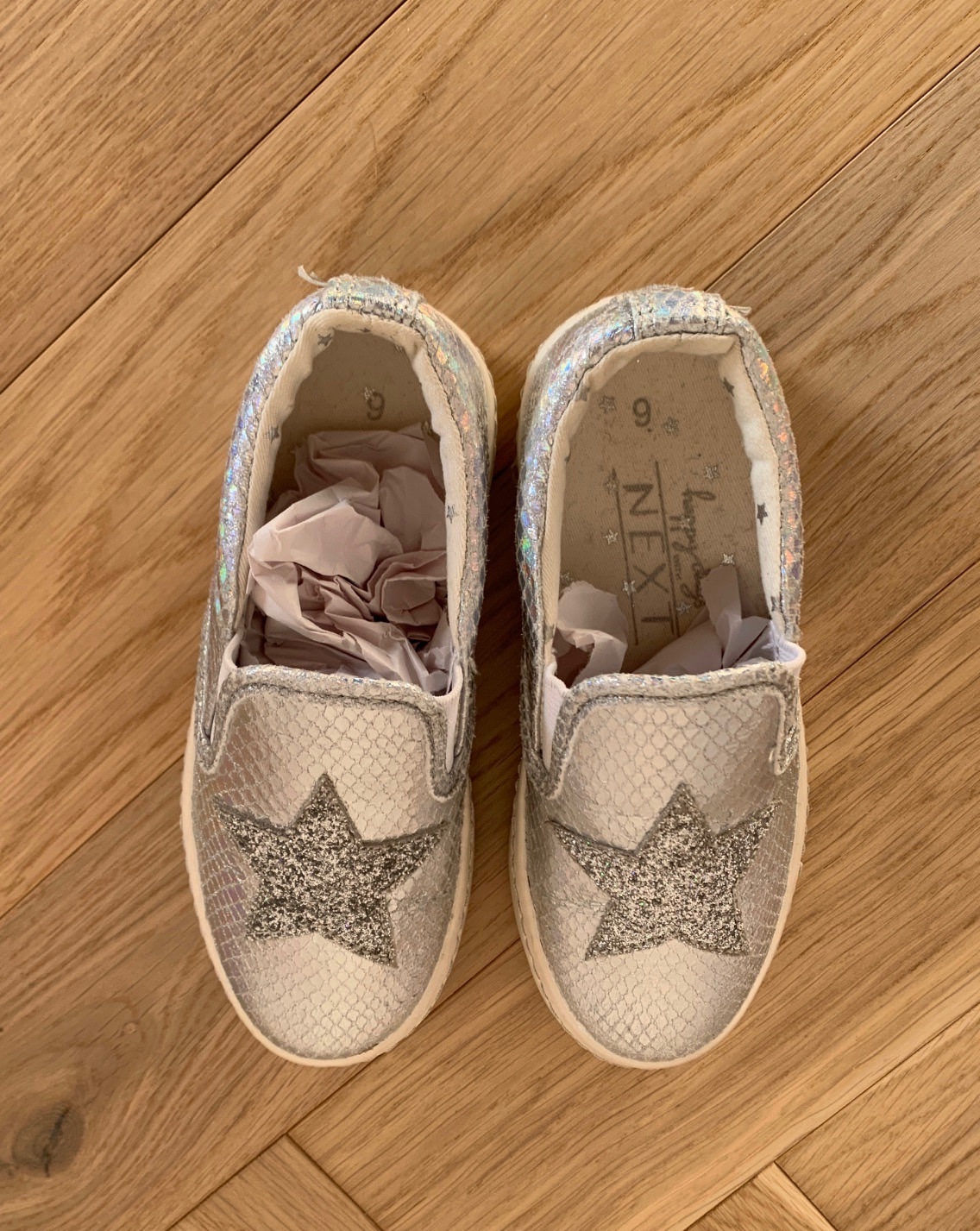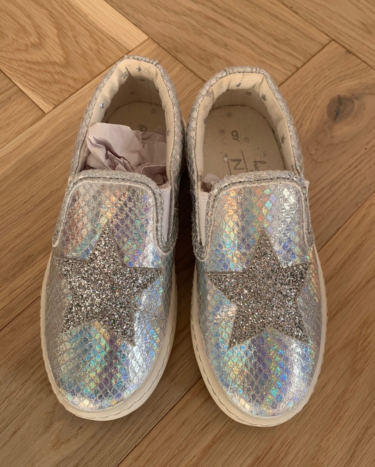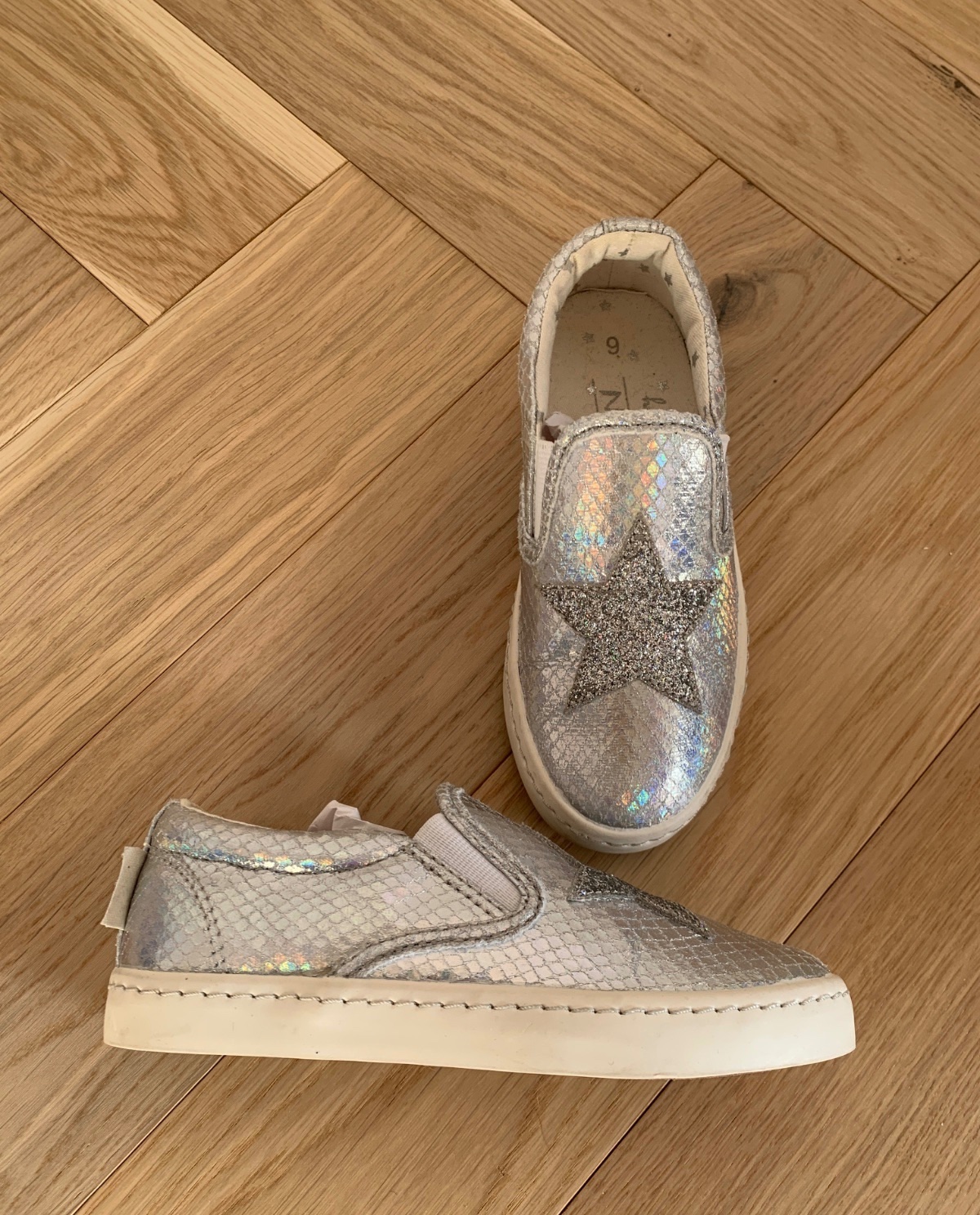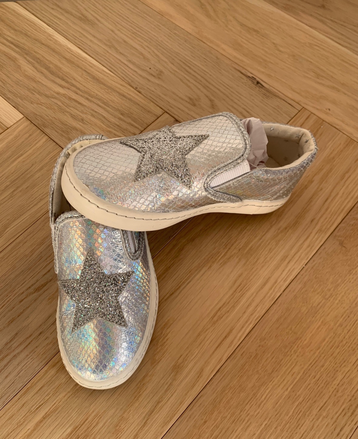 Predám krásne dievčenské topánky v lesklej striebornej farbe s holografickým efektom. Na vrchnej časti je veľká trblietavá hviezda. Vďaka gumičke po bokoch sa ľahko obúvajú aj vyzúvajú. Vnútorná dlžka je:17,5cm.