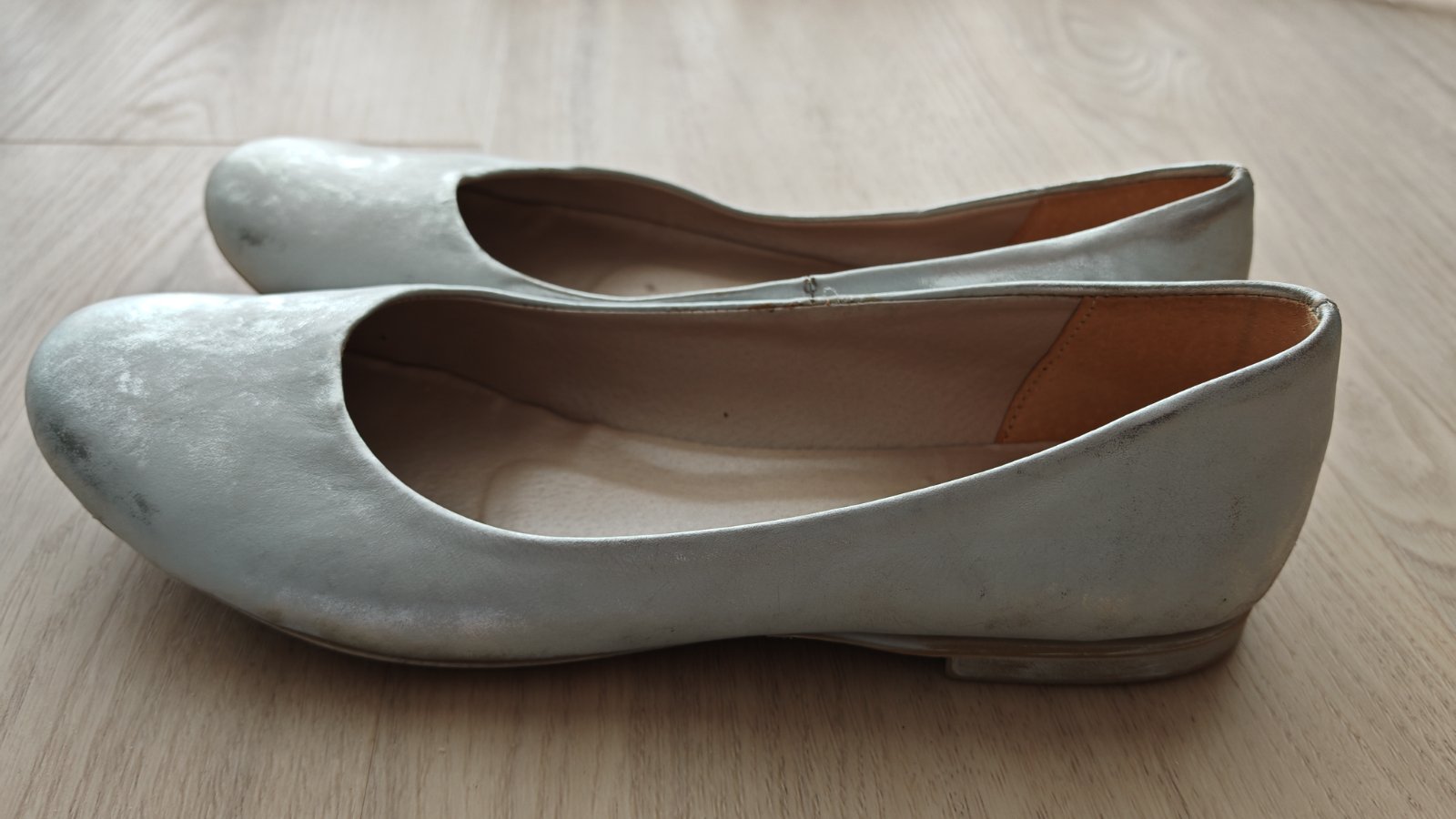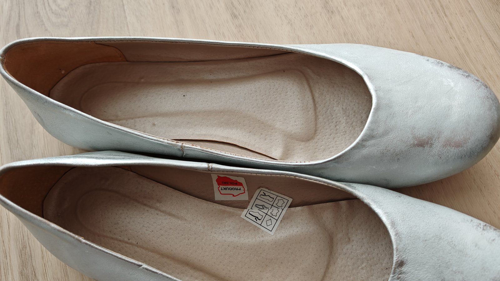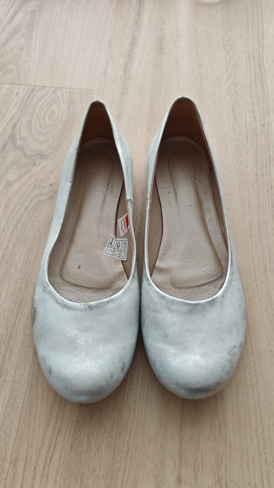 Uplne nove balerinky kupovane v polsku, polska vyroba, kozene, len doma vyskusane, farba je biela miesana so striebornou. Bohuzial po porode su mi uz male.