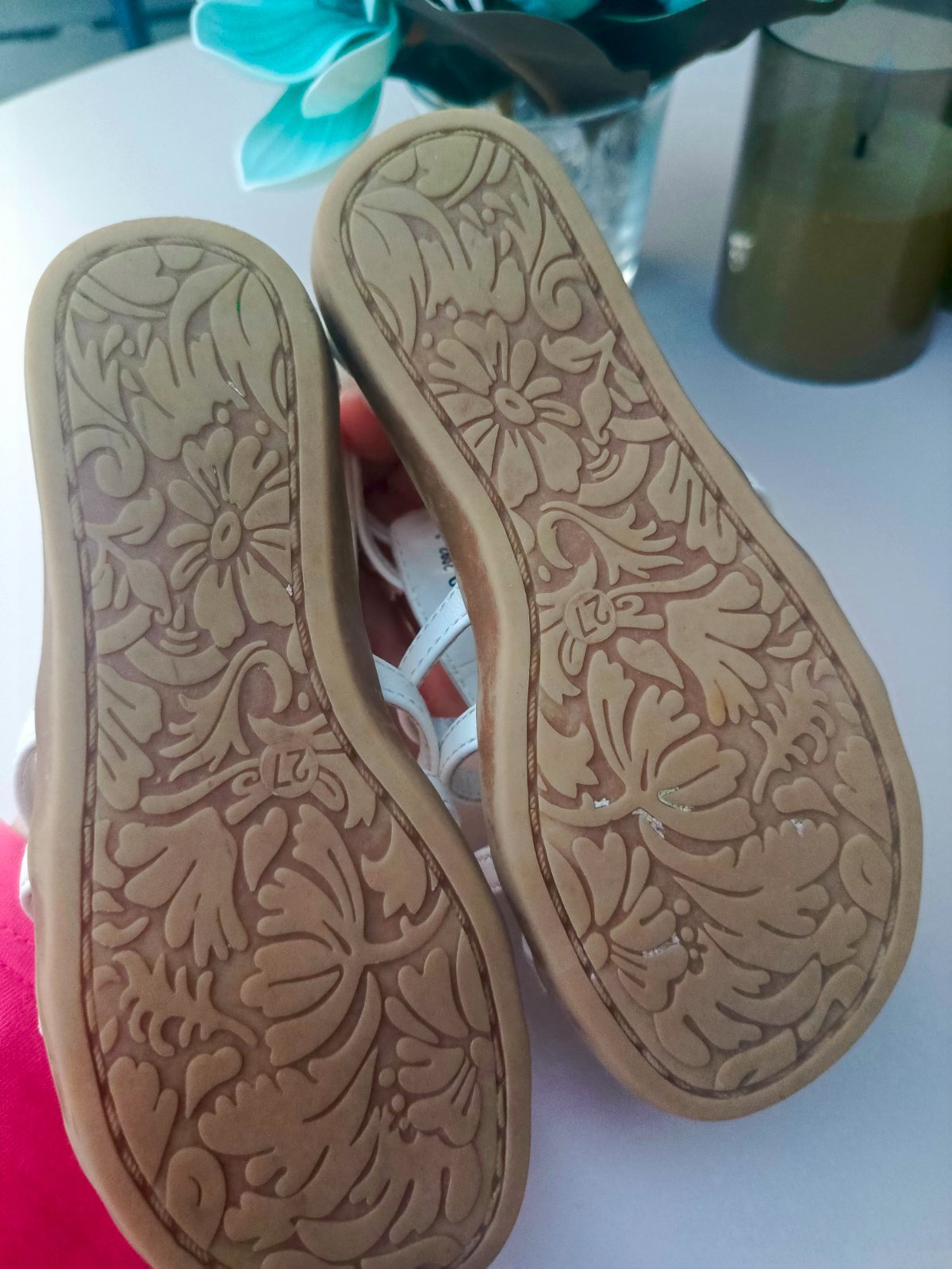 Krásne sandálky. Bez poškodenia. Vnútro vyzerá špinavé. Ale je to iba z bežného nosenia. Ešte som to neskúšala vyčistiť