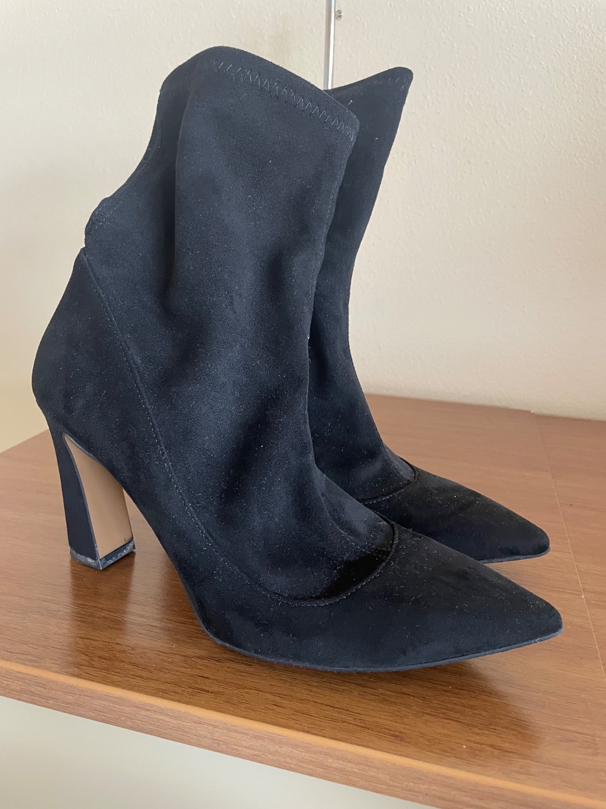 Čierne semišové čižmy na zapínanie zipsom vo veľmi dobrom stave. vn.dl. 26,5cm. Veľkosť písaná 39, ale sú väčšie.