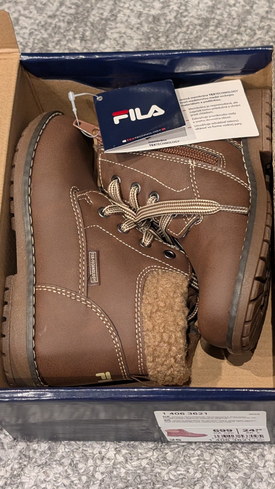 Posúvam zimné topánky zn. Fila veľkosť 25 v dobrom stave. Na druhej foto je vidieť osuchanu prednú časť časť, vhodné na donosenie.