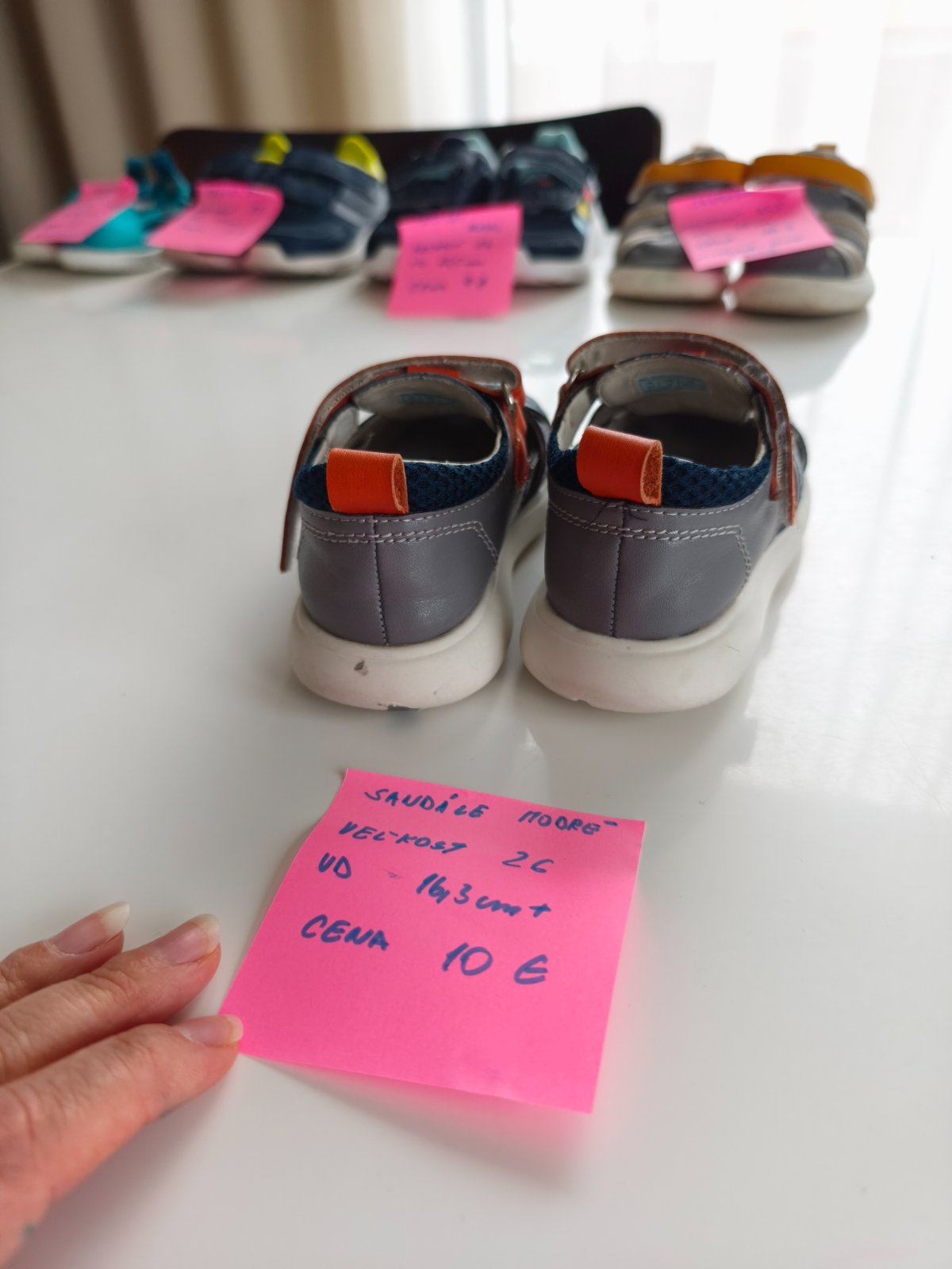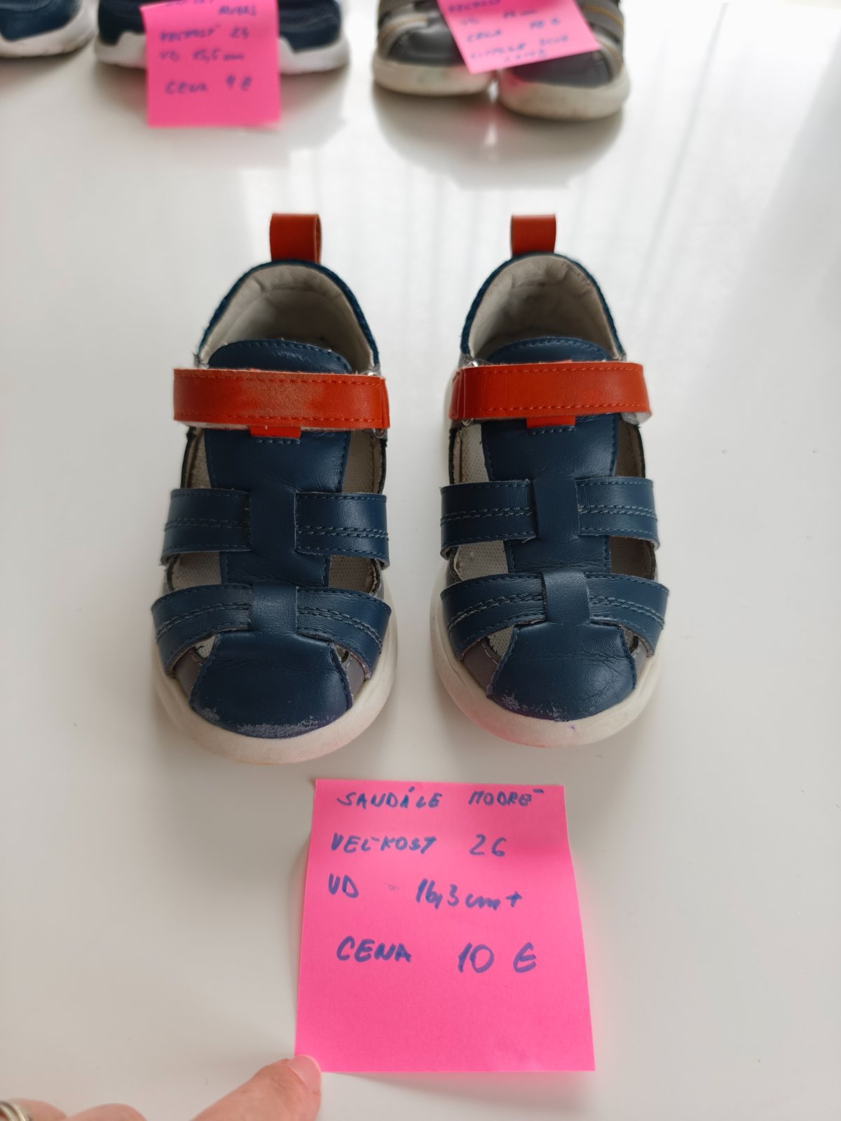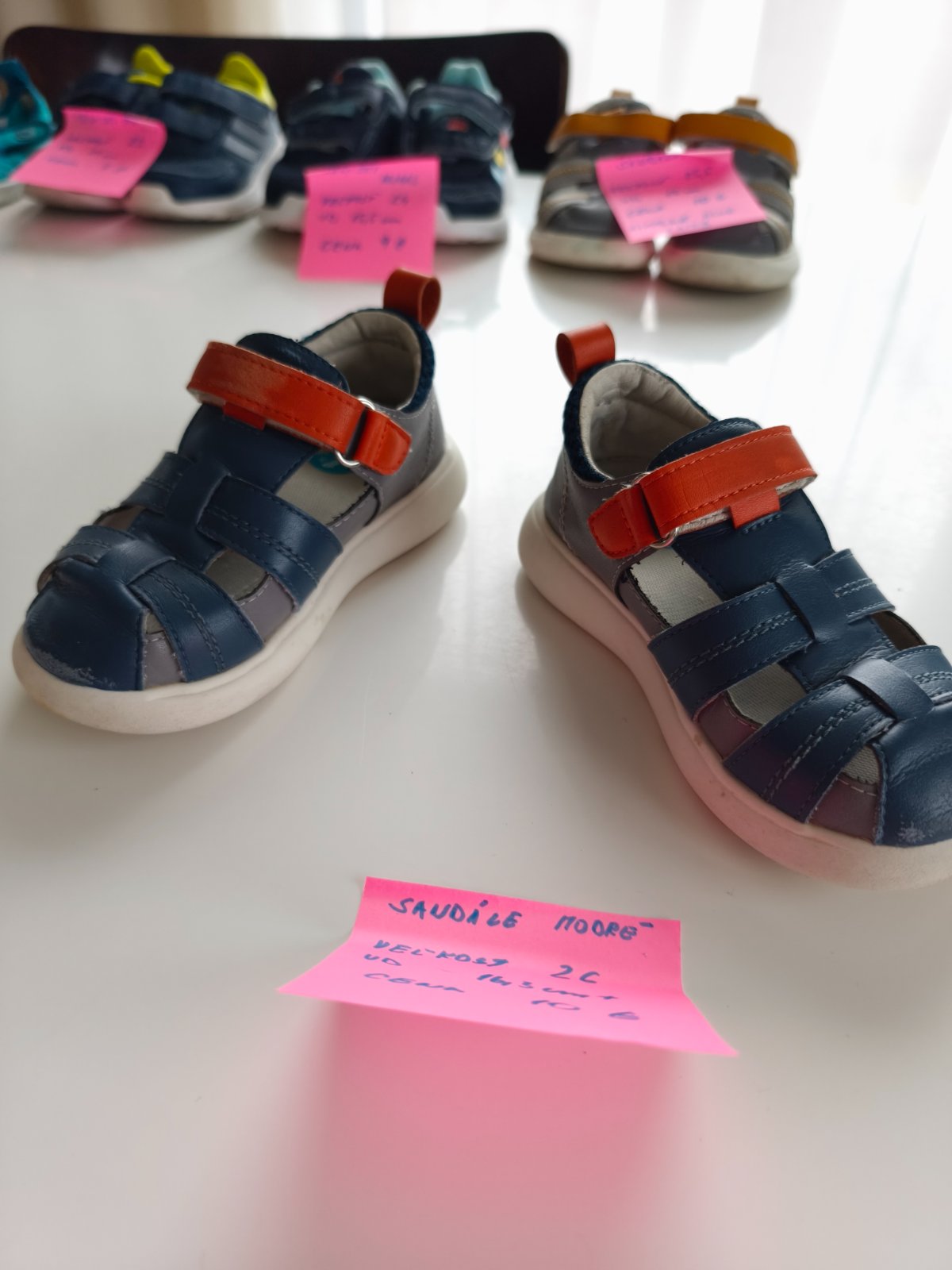 Dobrý stav, trošku ošúchané. Nosené ako prezývky v škôlke. Ten fľak na podrážke neviem odstrániť.