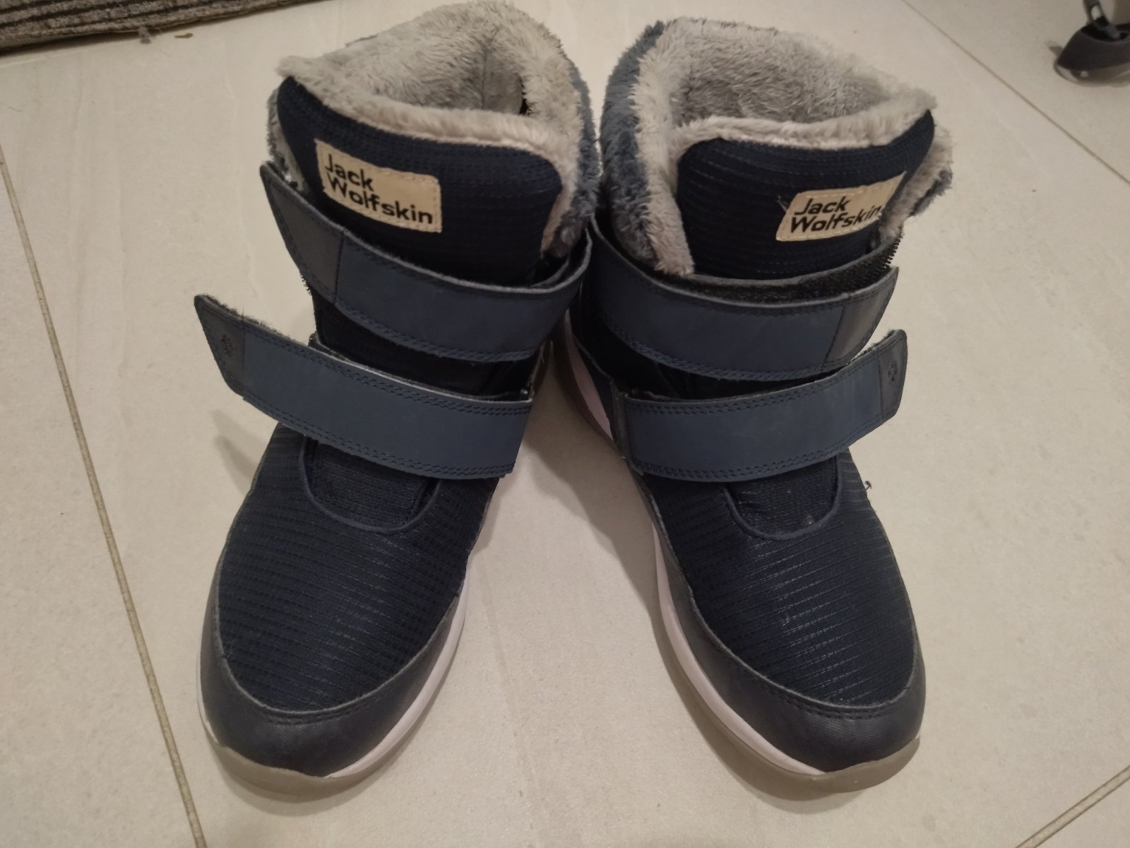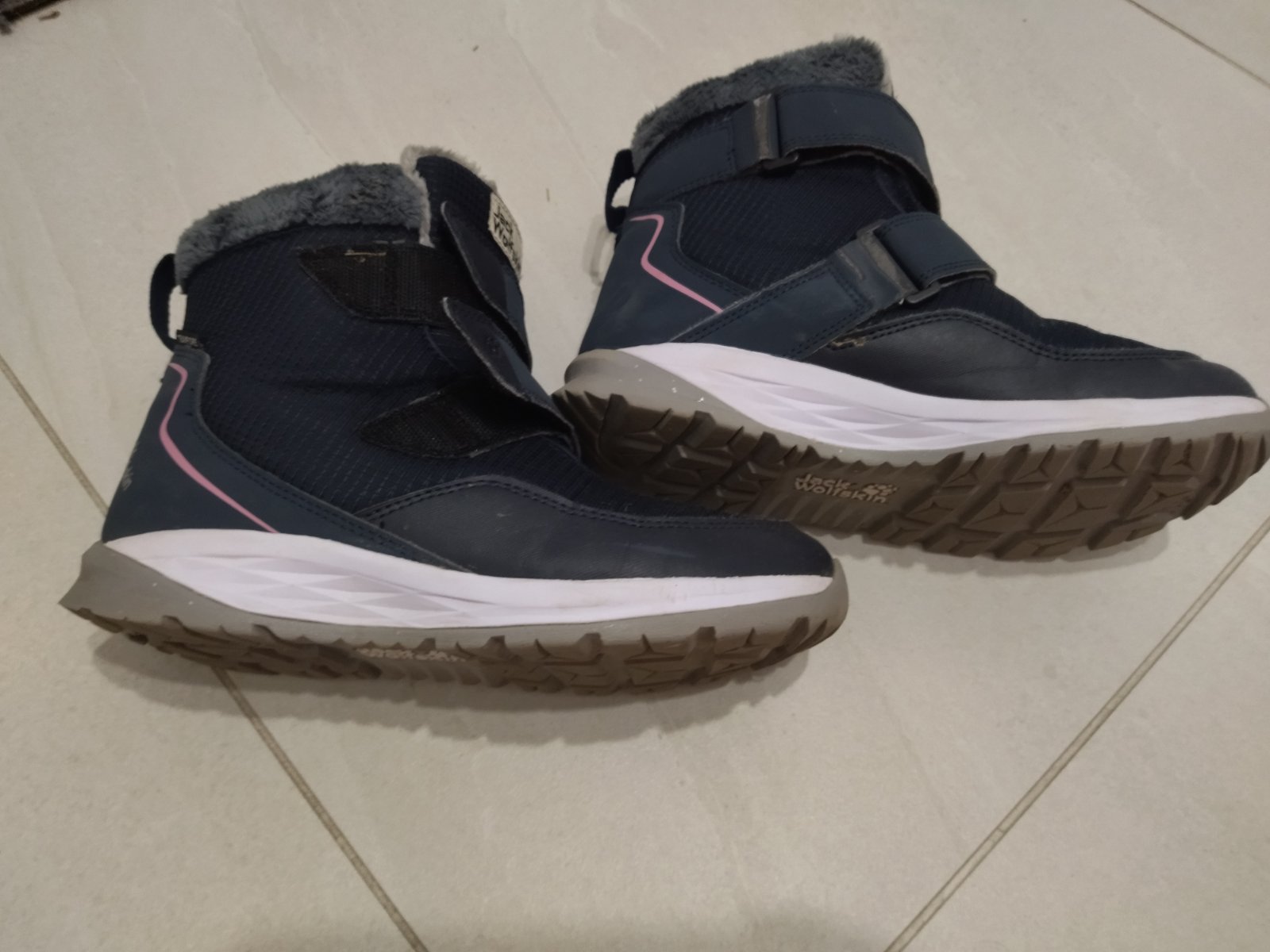 Predám máličko nosené zimné čižmy zn. Jack Wolfskin. Vo výbornom stave. Jedinou známkou nosenia sú mierne ošúchané pracky (je to z vnútornej strany a na tmavom podklade to ozaj nie je viditeľné - viď detailné foto). Inak sú neschodené, neokopane. Príjemné, teplučké a nepremokavé. Praktické zapínanie na 2x pevný suchý zips. Veľkosť 36. Napis vzdu na pate je reflexny.