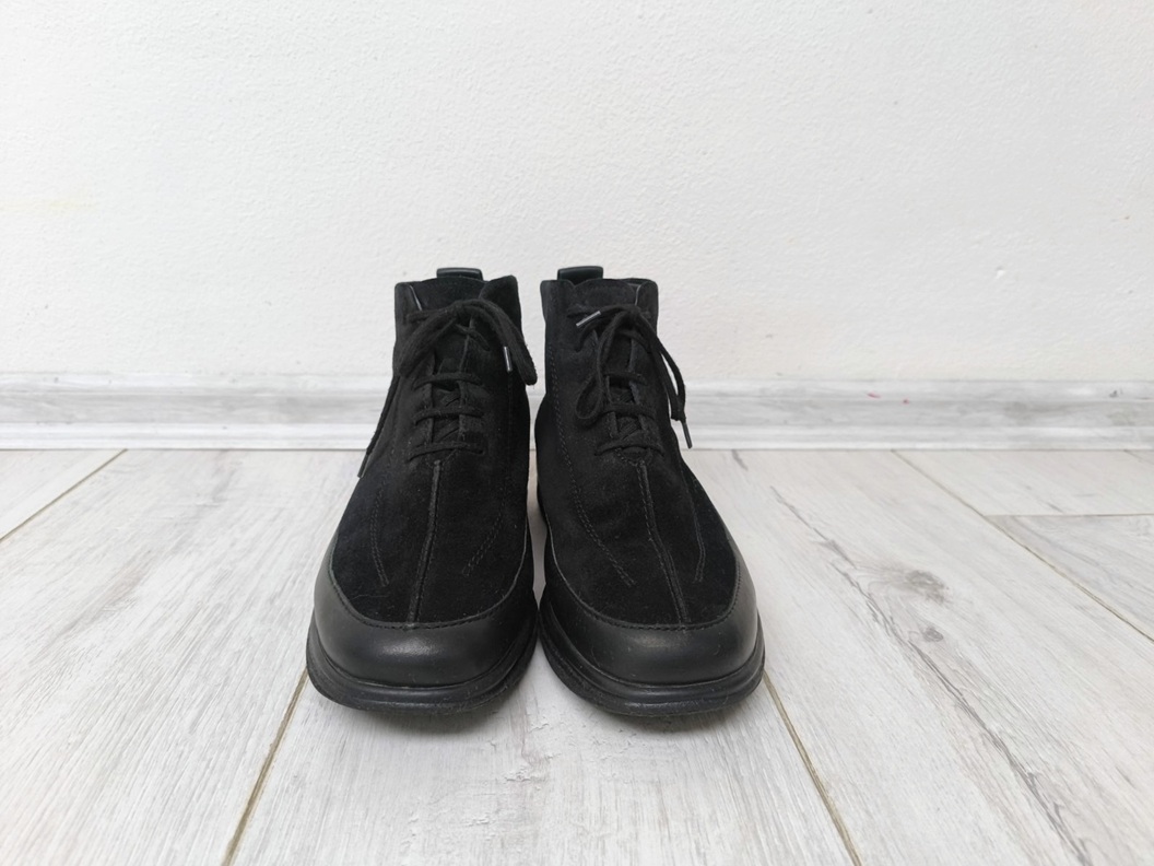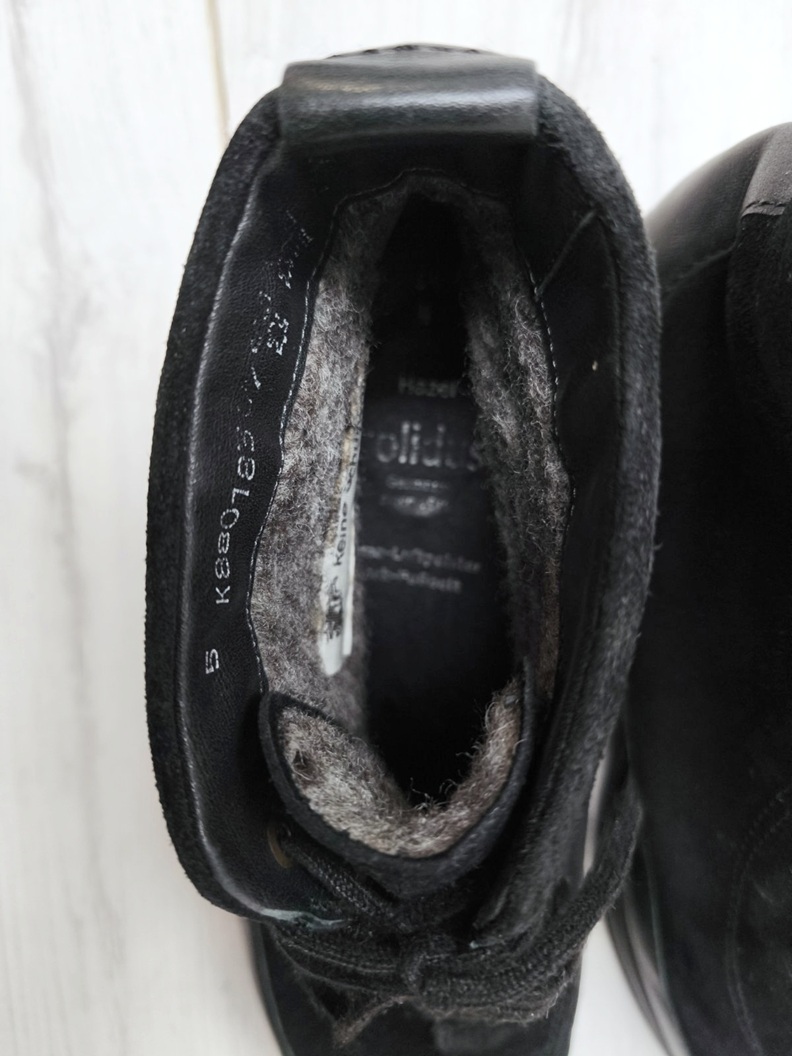 Ponúkam tieto celokožené kotníkové topánky zn. SOLIDUS, čiernej farby, kombinácia brúsenej a klasickej kože, vnútro pravá vlna, čiže teplučké a pohodlné. Obsahujú dve vnútorné vložky - koženú a vlnenu, dajú sa nosiť samostatne ale aj spolu (obidve sú vo vnútri). Sú v perfektnom stave, veľkosť 4 1/2, sedia na 37,5-38, pri hrubšej ponožke aj 37.