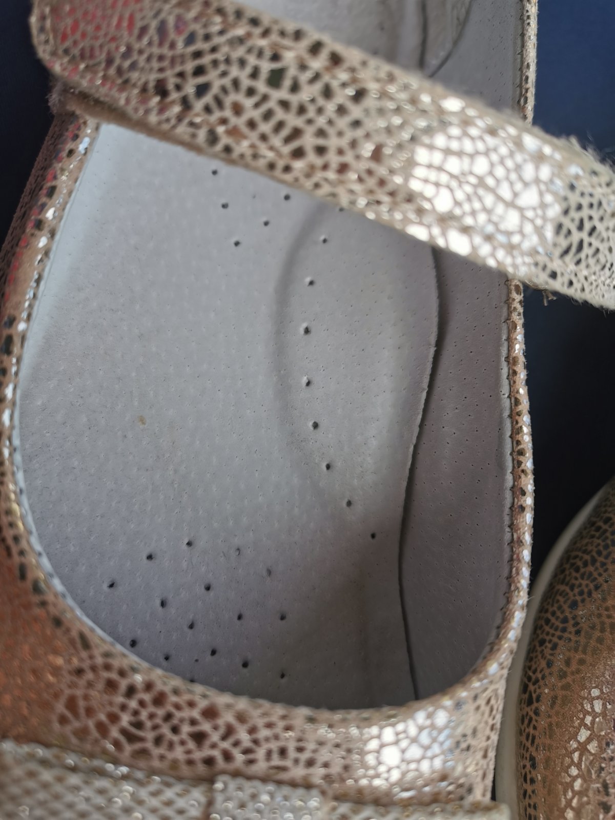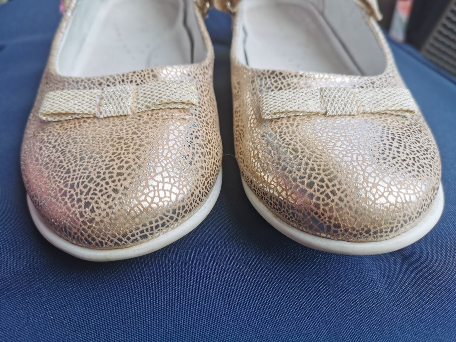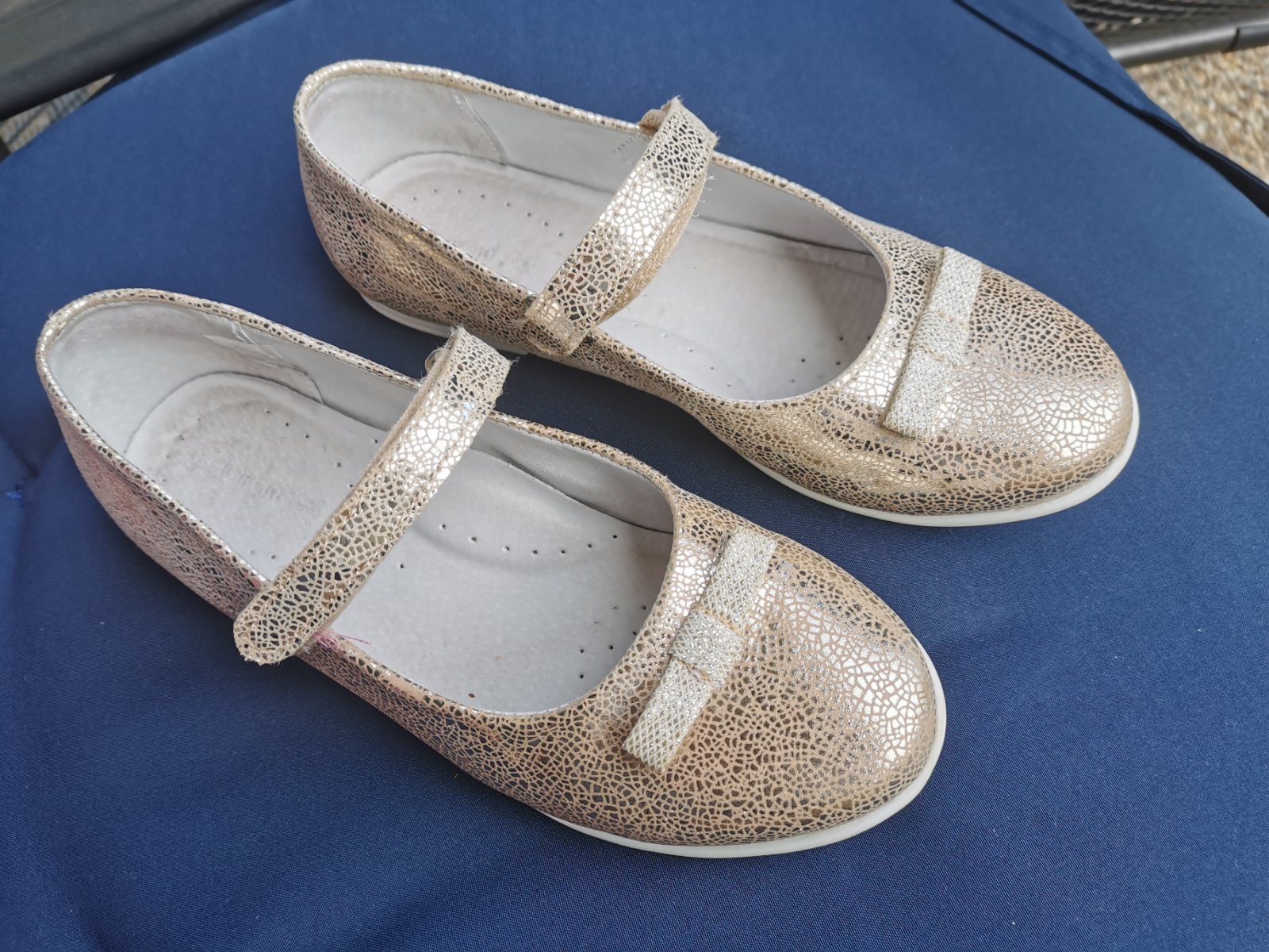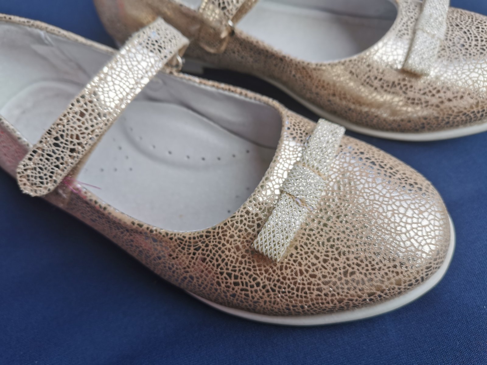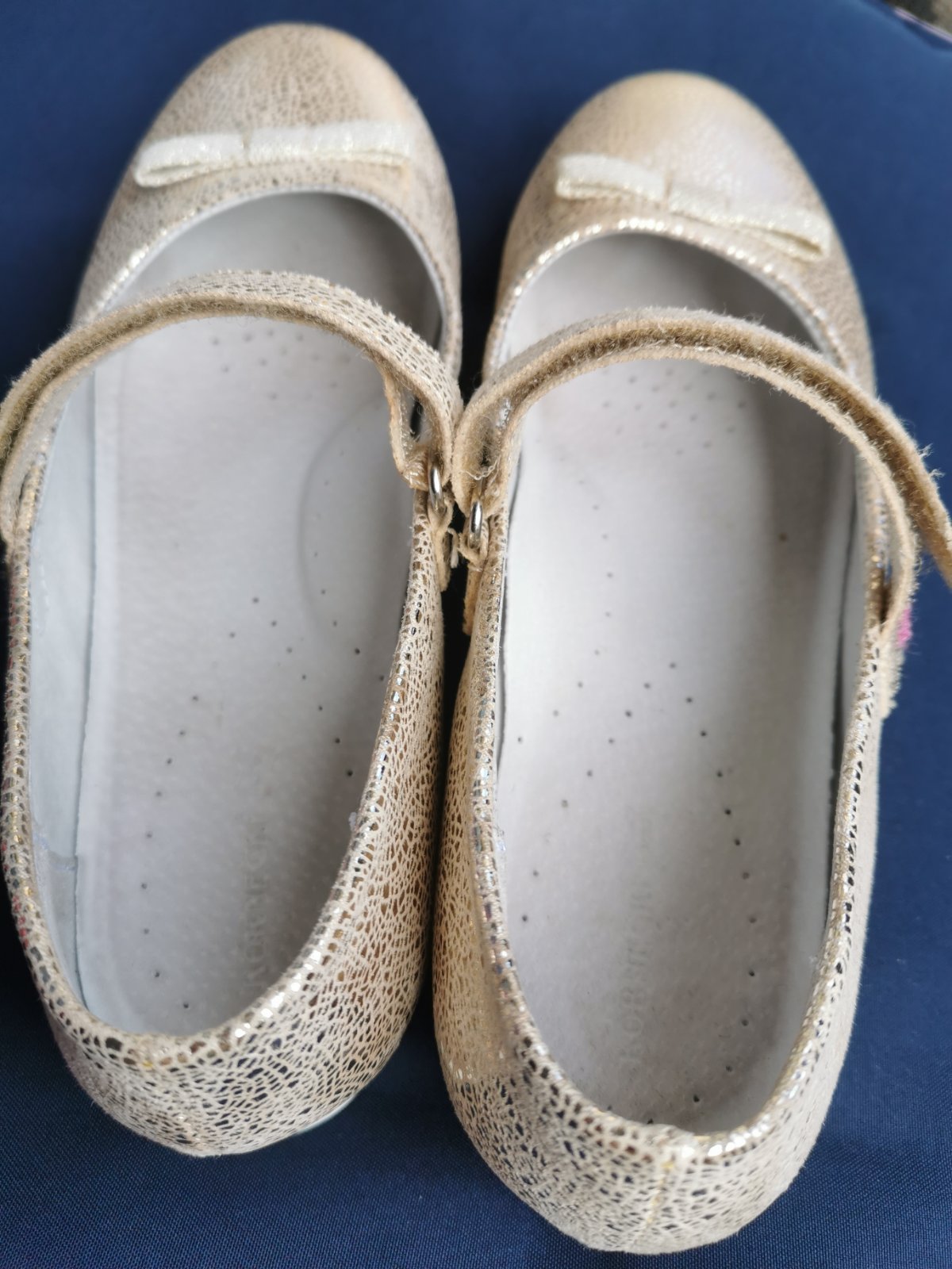 Krásne baleriny vo výbornom stave, uvedený materiál je ekologická koža, kožená tvarovaná stielka, zapínanie na suchý zips, vnútorná dĺžka je 23,5cm.