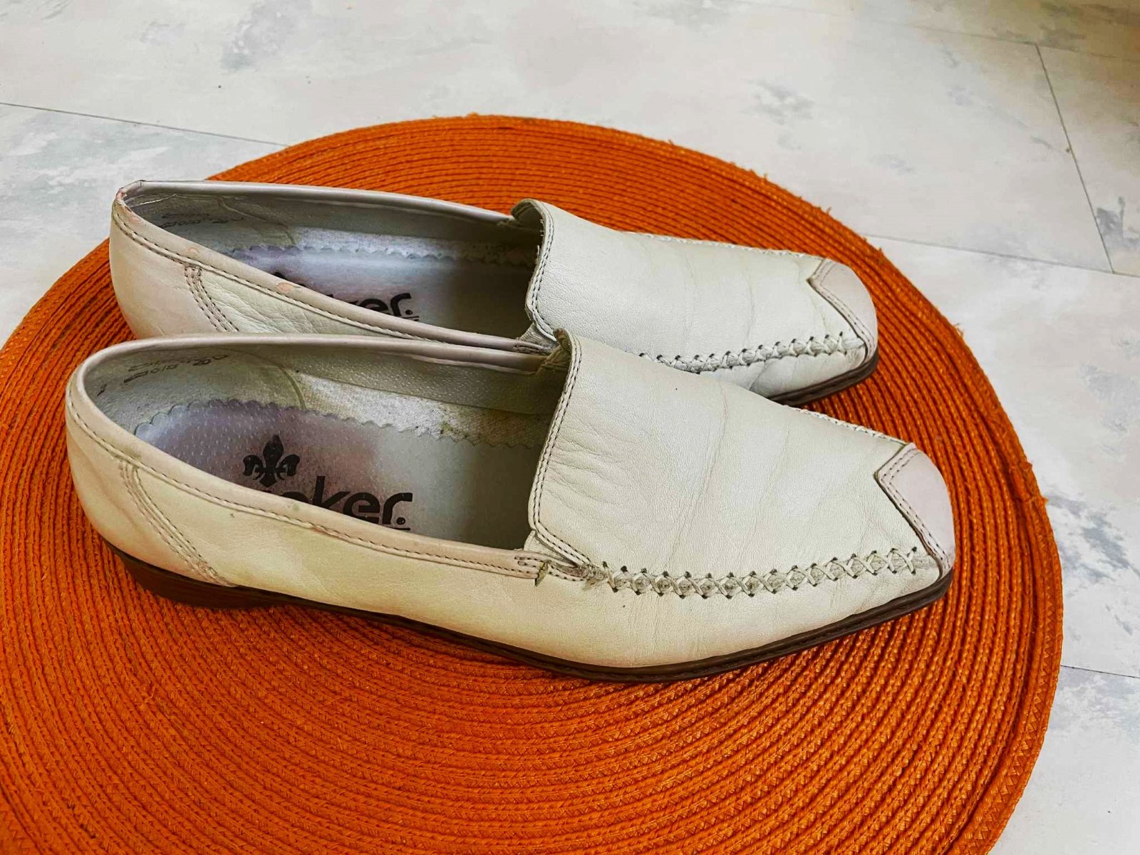 kožené mokasíny,vpredu a vzadu kombinované jemnou púdrovo ružovou farbou,ľahúčke a mäkké,farba lomená biela s jemnučkým nádychom do bledošedej ( slonia kosť,vn. dlžka = 24 cm,PC = 80 eur,na 1 topánke je jemne oškretý okraj,nie je to veľmi vidieť,ale je to nafotené