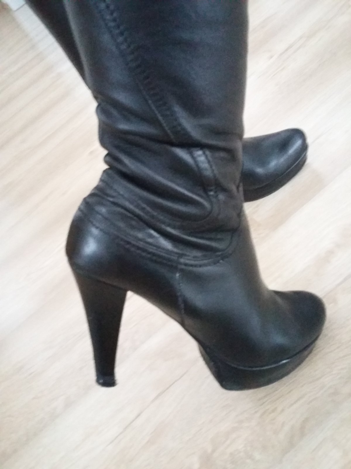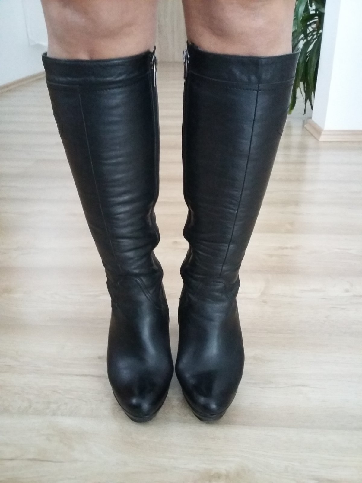 Predám krásne kožené čižmy vo veľkosti č.37 na platforme, mäkučké kvalitné s miernym flísovým zateplením kupované v kamennom obchode v zahraničí minimálne použité. Výška podpätku je 10 cm, platforma je 2 cm, celková výška čižiem s podpätkom je 47cm bez poškodenia a všetko je nafotené i s mierami. Predaj len z dôvodu, že nemôžem už nosiť podpätky.