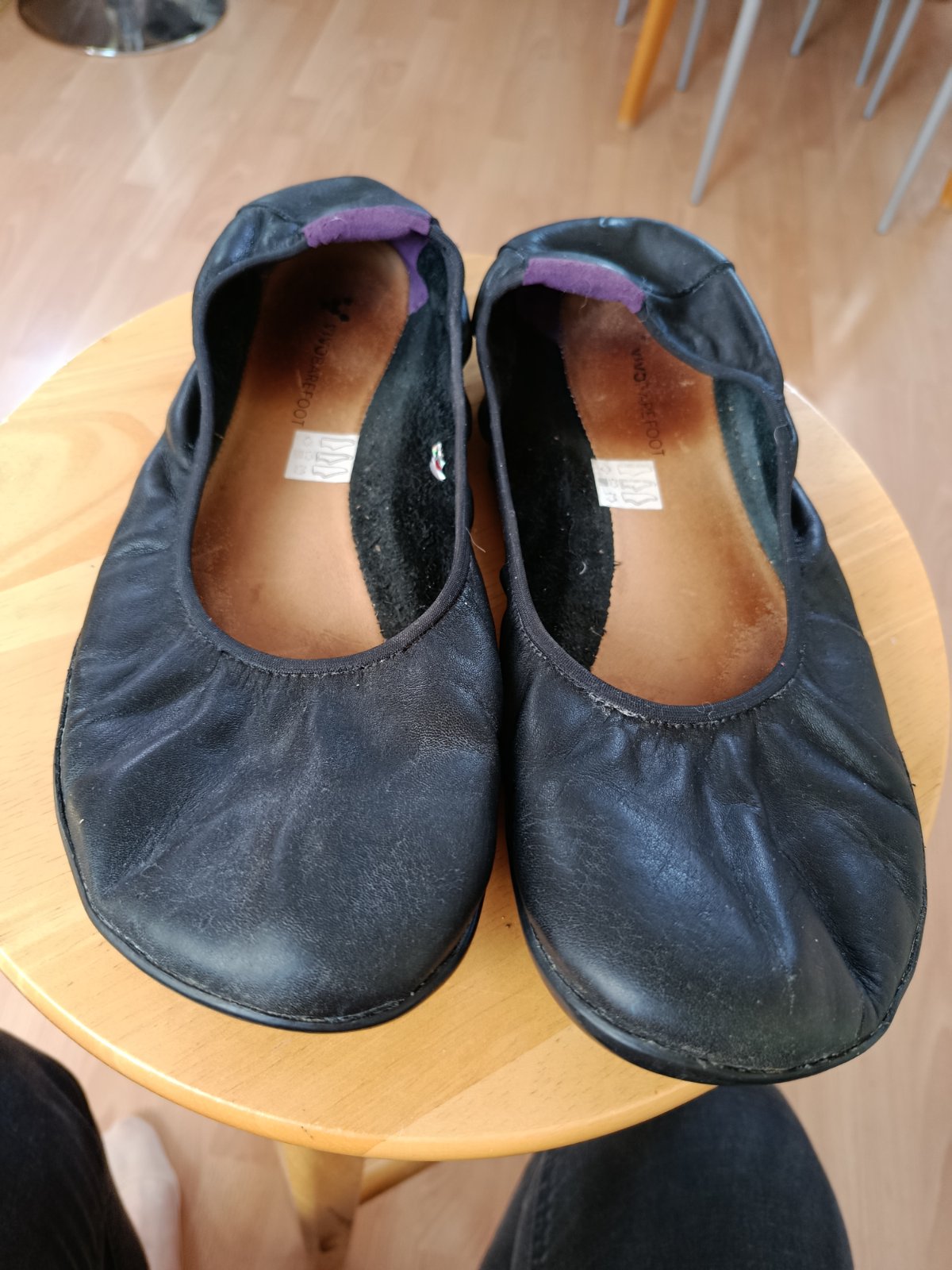 Vivobarefoot Jing Jing. Nosené príležitostne niekoľko rokov, pravidelne čistené a ošetrované. Vnútorná stielka je trochu zodraná, na nohe to však necítiť. Stále sú mäkké a veľmi pohodlné. Podrážka má 3 mm, takže ja ako BF začiatočník som ich nosila s polstrovanými ponožkami.