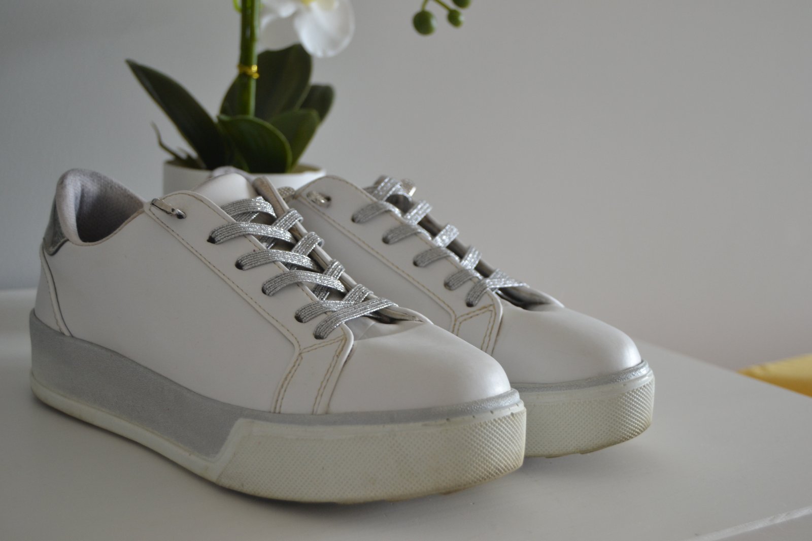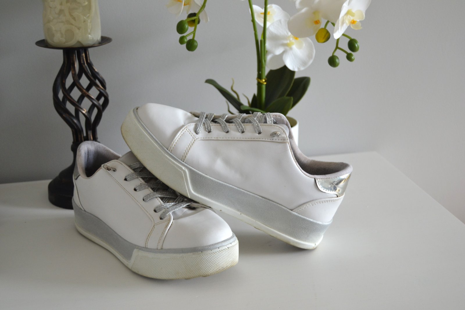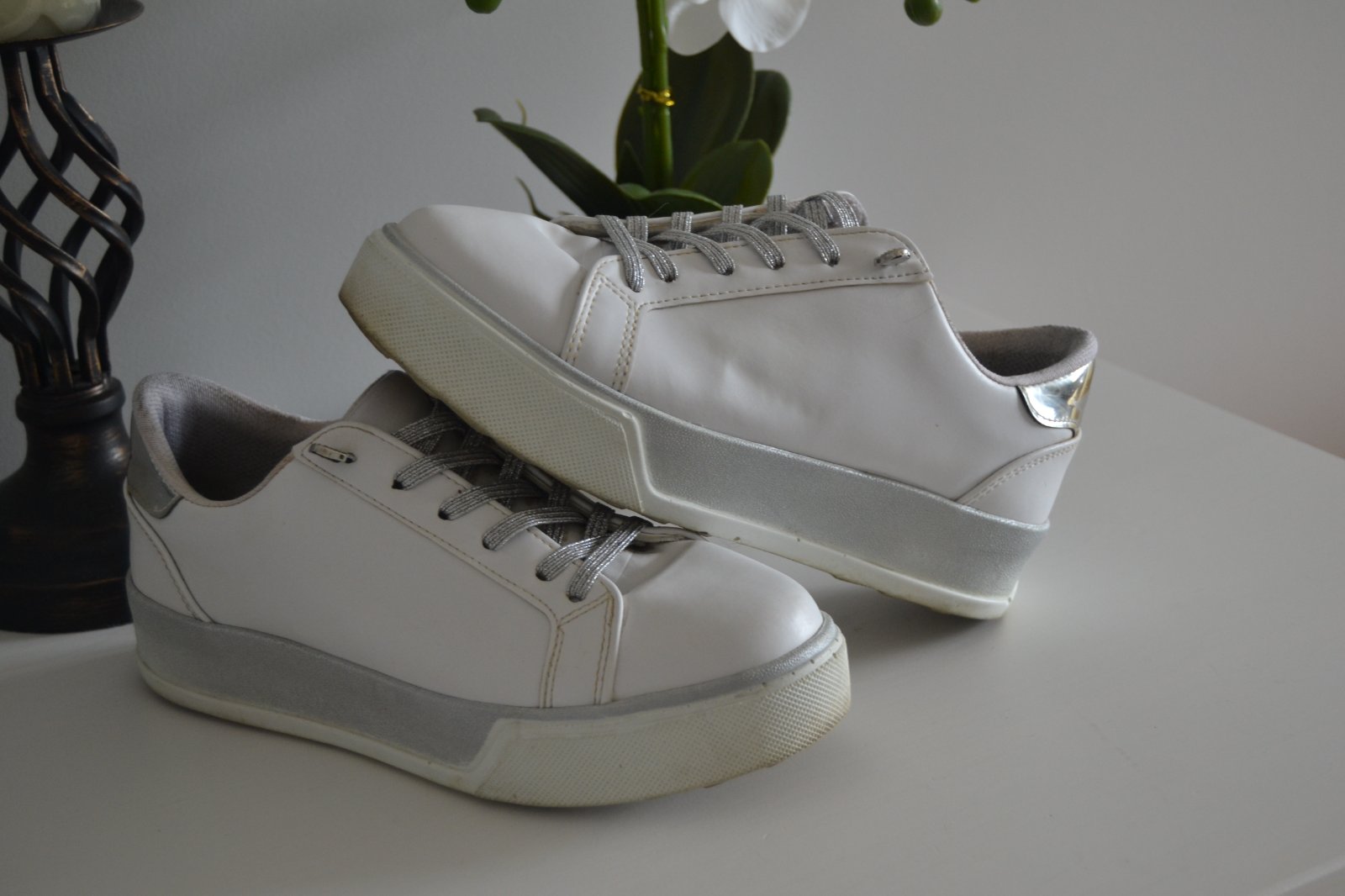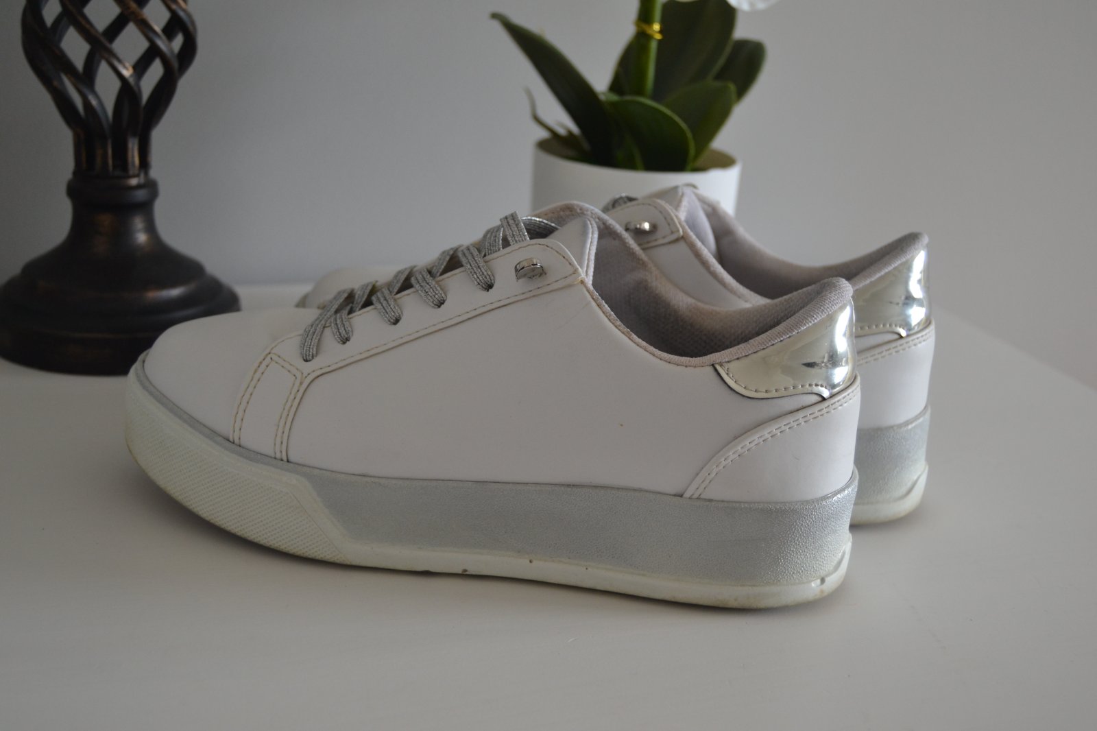 Kožené tenisky bielej farby na hrubej striebornej podrážke, veľkosť 38. Tenisky sú nazúvacie, majú gumičkové strieborné šnúrky. Topánky majú hrubú podrážku (hrúbka podrážky 3 cm).