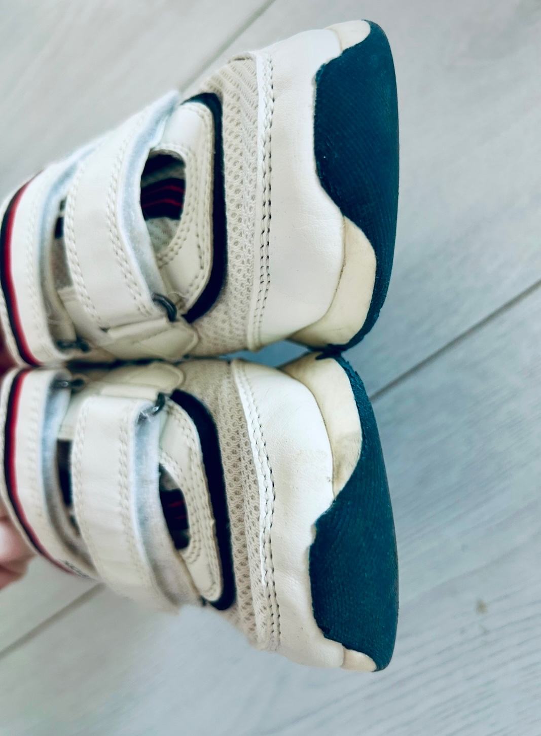Velmi malo nosene frkane tenisky so snurovnim, vnutorna kozena vyberatelna vlozka je priedusna a antibakterialna, podrazka neznicena, top stav. Vnutorna dlzka odfotena, cca 17,5cm. Hmotnost: 325g