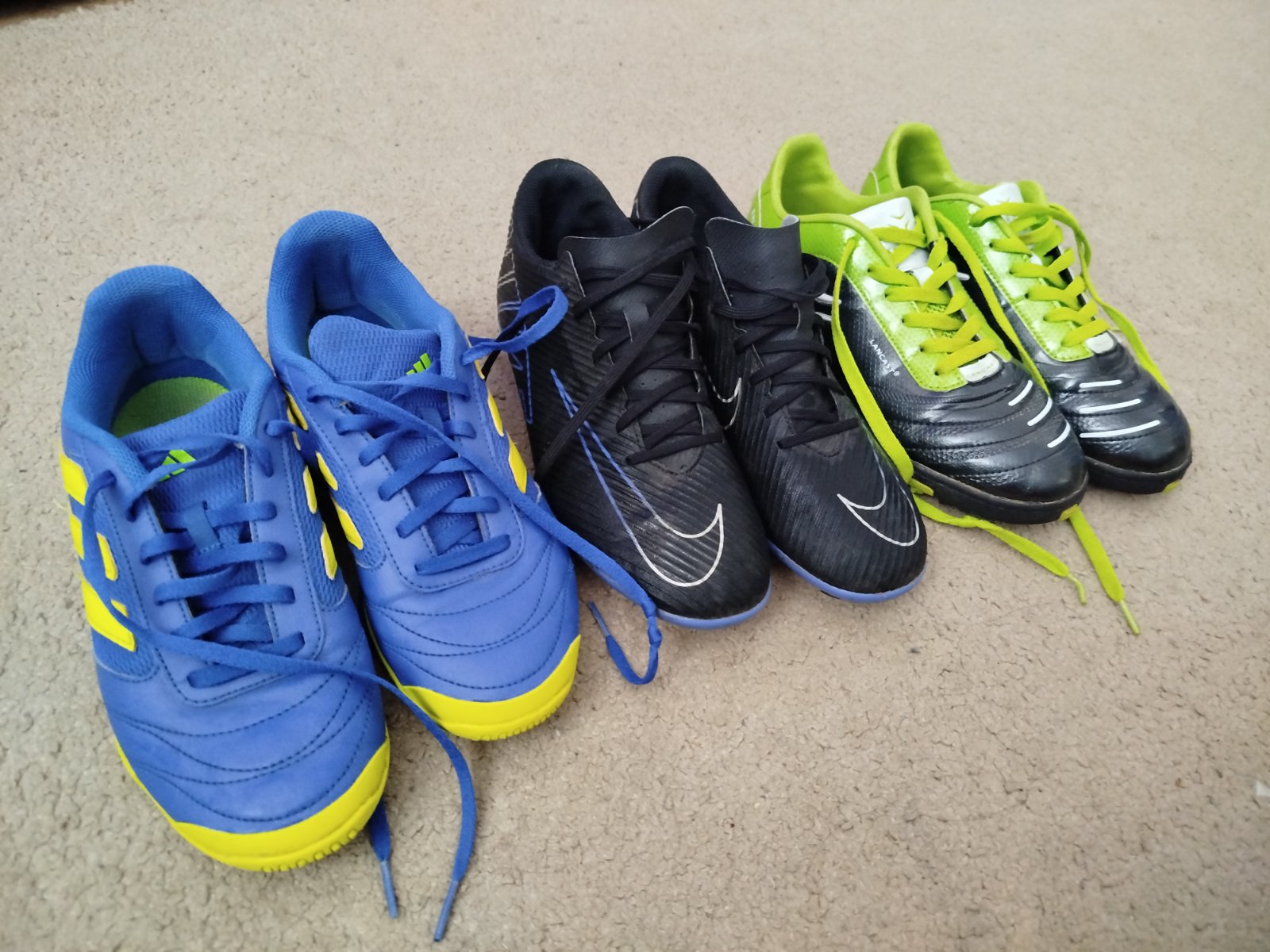 Predám tenisky (halovky) Adidas, kopačky NIKE a tenisky na umelú trávu LANCAST. Všetky sú v super stave, neokopané, len párkrát obuté. Sedia na nohu 38-39. Cena Adidas 18€, Nike 14€, LANCAST 9€. Pri kúpe spolu, darujem aj tričko alebo nohavice, podľa Vášho výberu