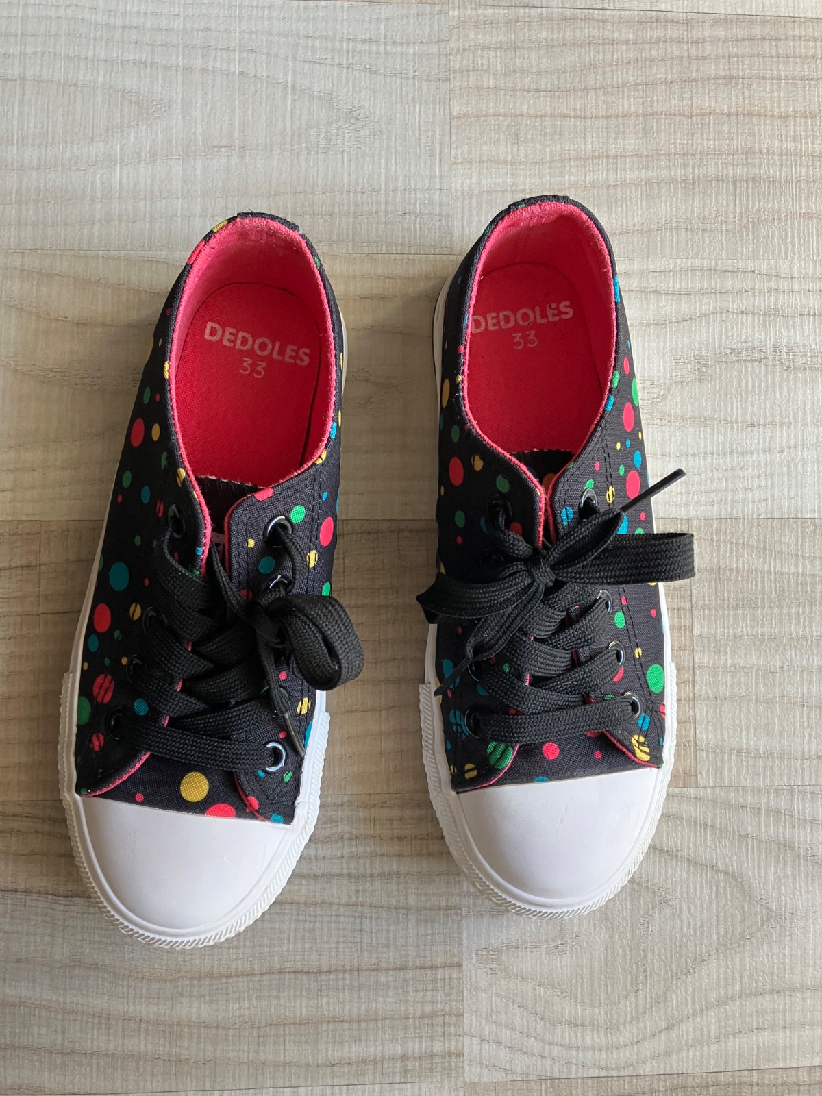 Pekne, iba parkrat obute platenky v bezchybmom stave, maju aj nahradne bodkove farebne snurky, vnutorna dlzka 21cm..