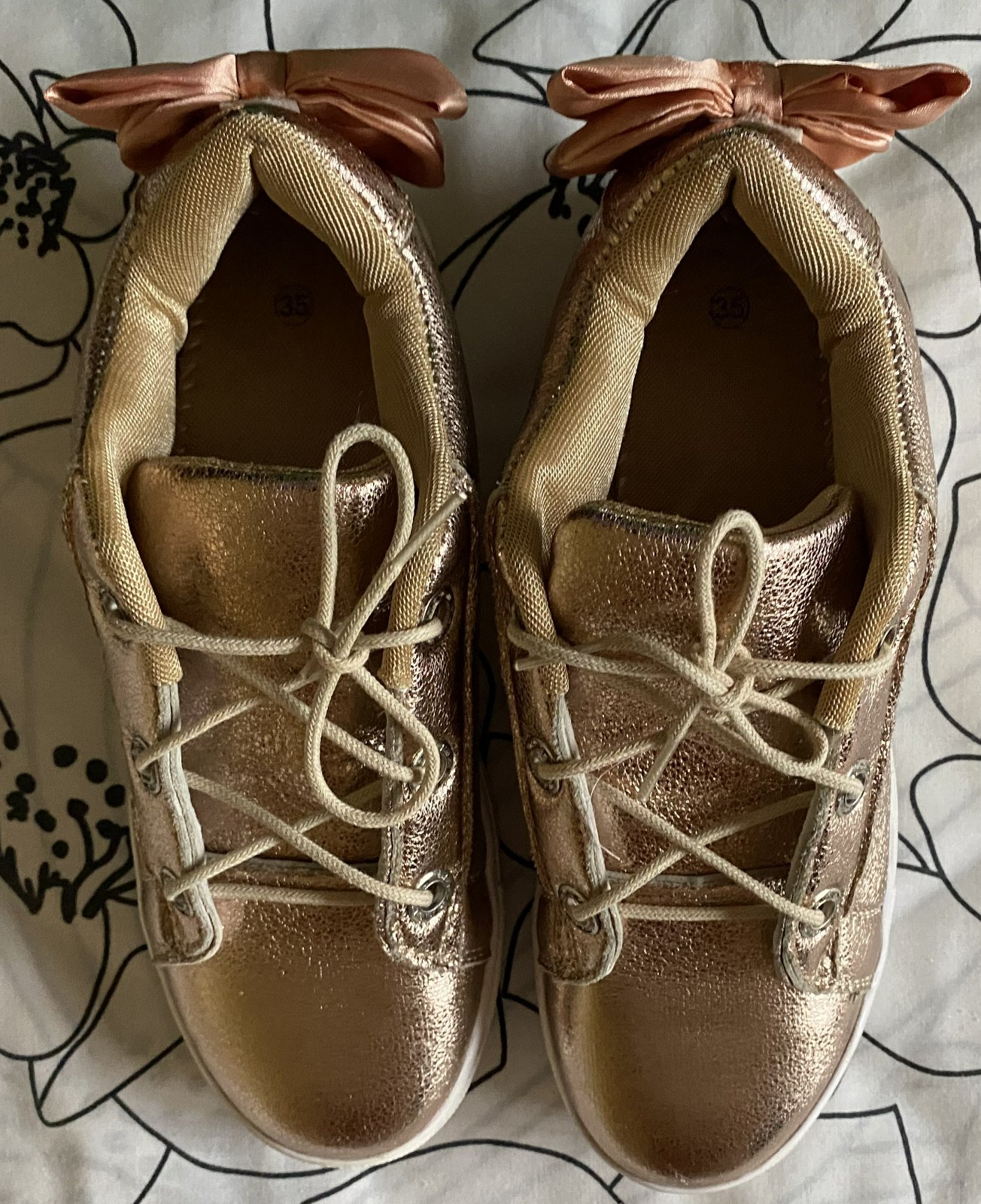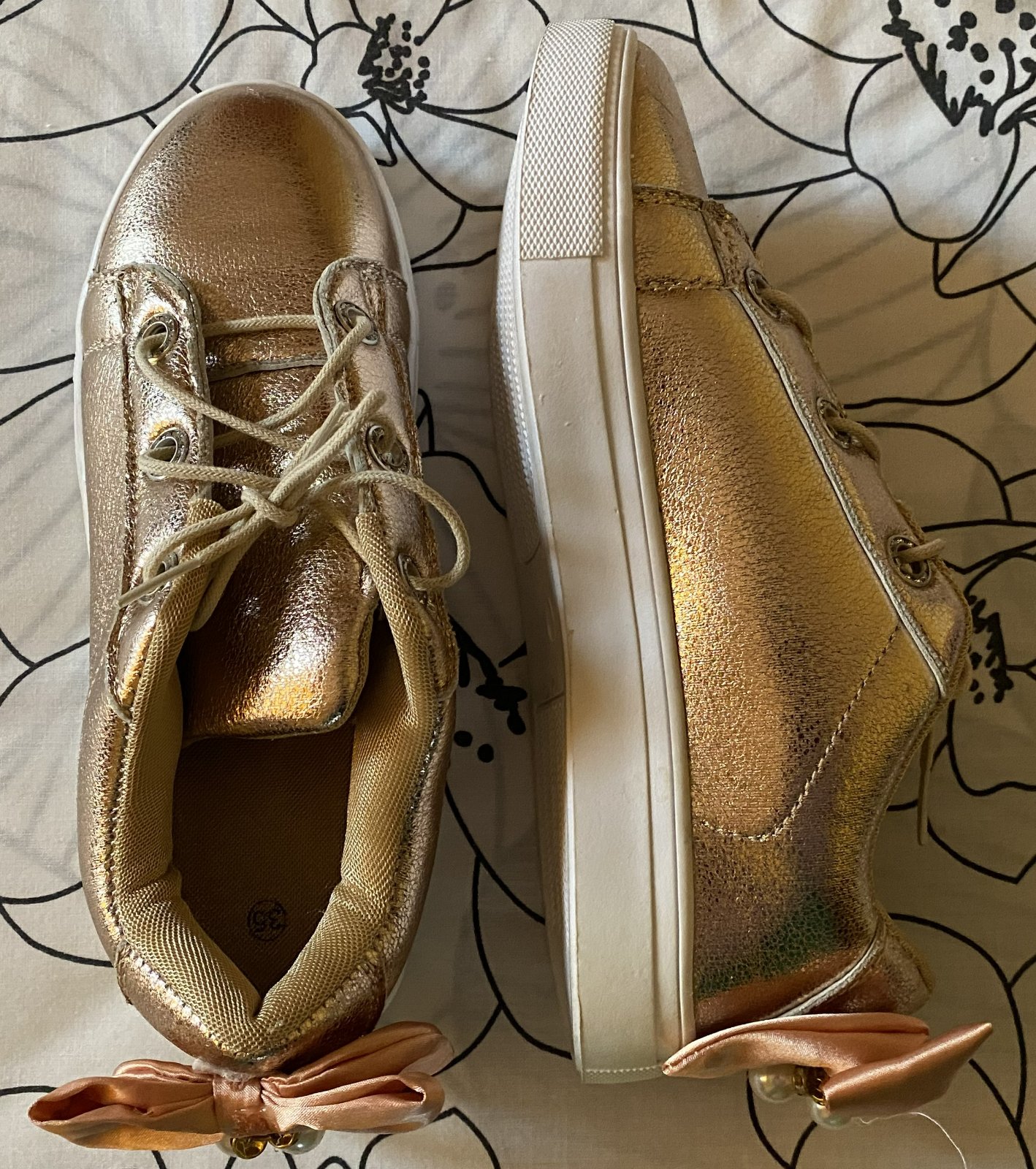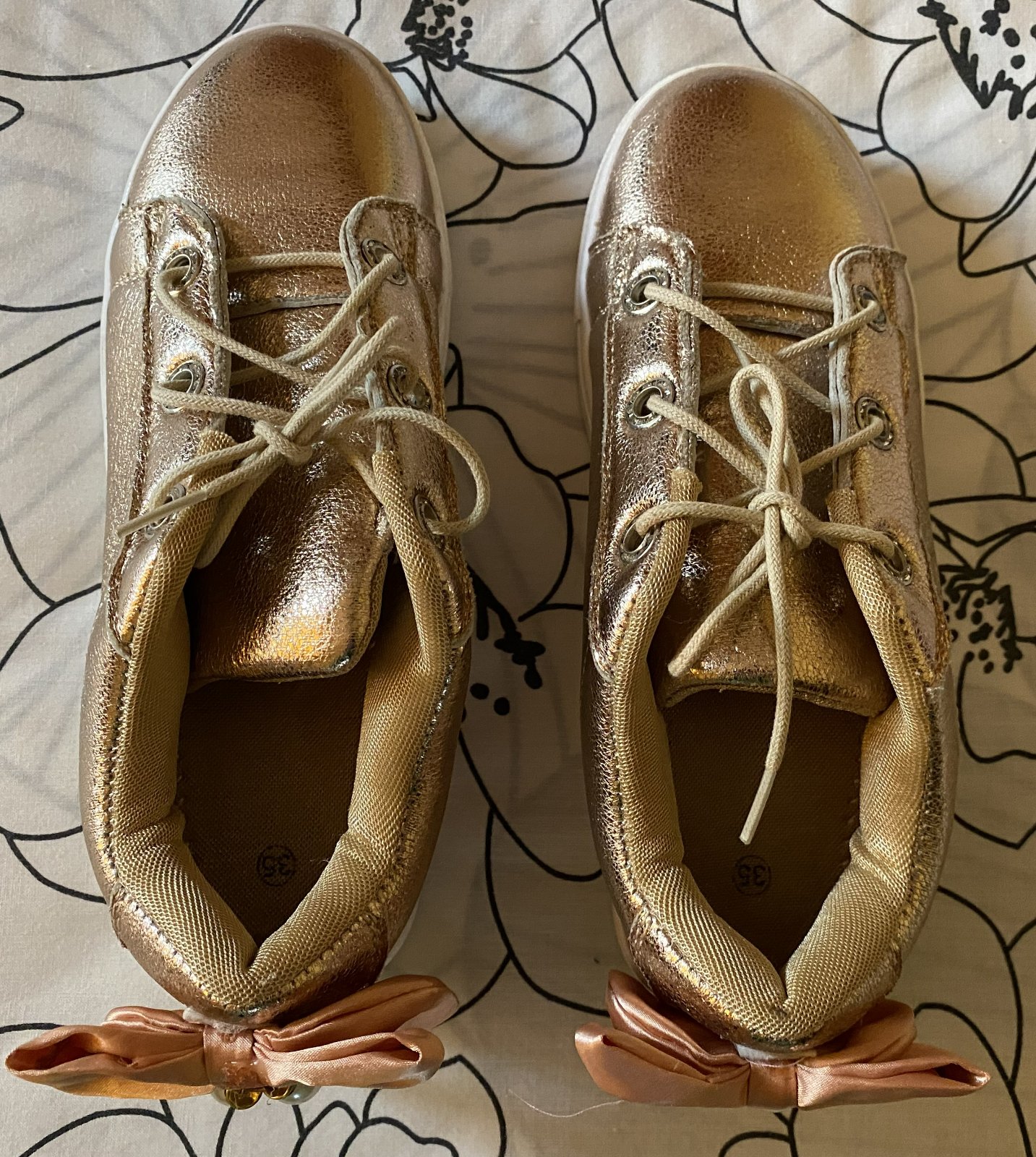 Zlaté topánky - tenisky v. 35, málo nosené na striedačku s inými. Vnútorná dĺžka - stielka cez stred: 21.5cm.