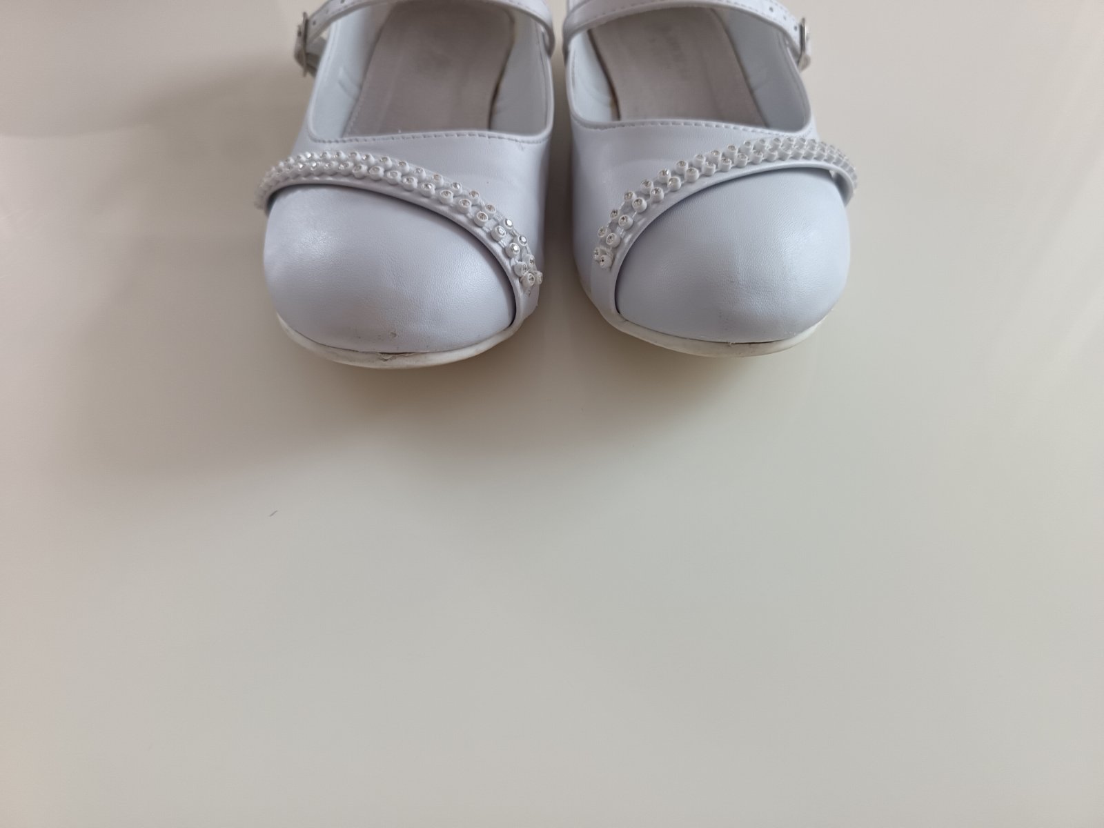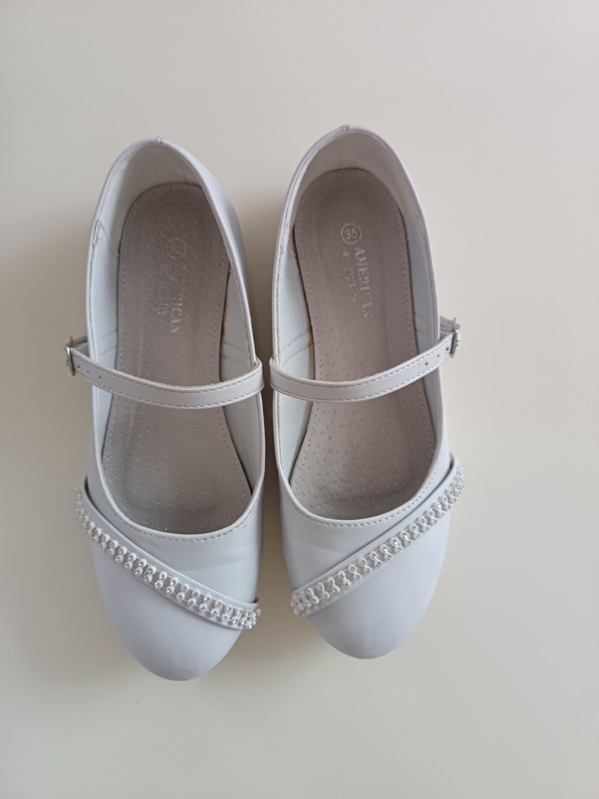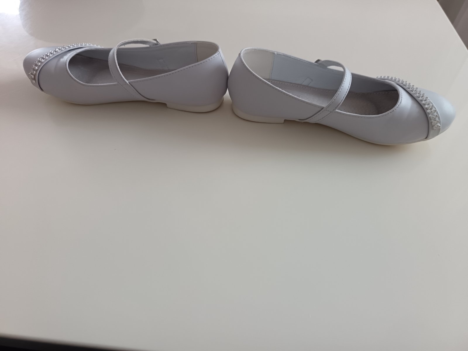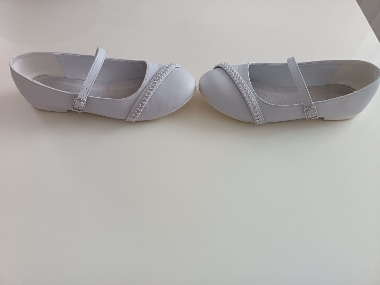 Biele balerinky s prackou na zapínanie okolo priehlavku, v prednej časti ozdobné kamienky, ktoré sa mierne ligocu, špičky minimálne oškreté (viď foto), mali sme ich na prvom sv prijímaní, inak bez poškodenia, ortopedická, kožená tielka,vn.dĺžka stielky je 21.9cm