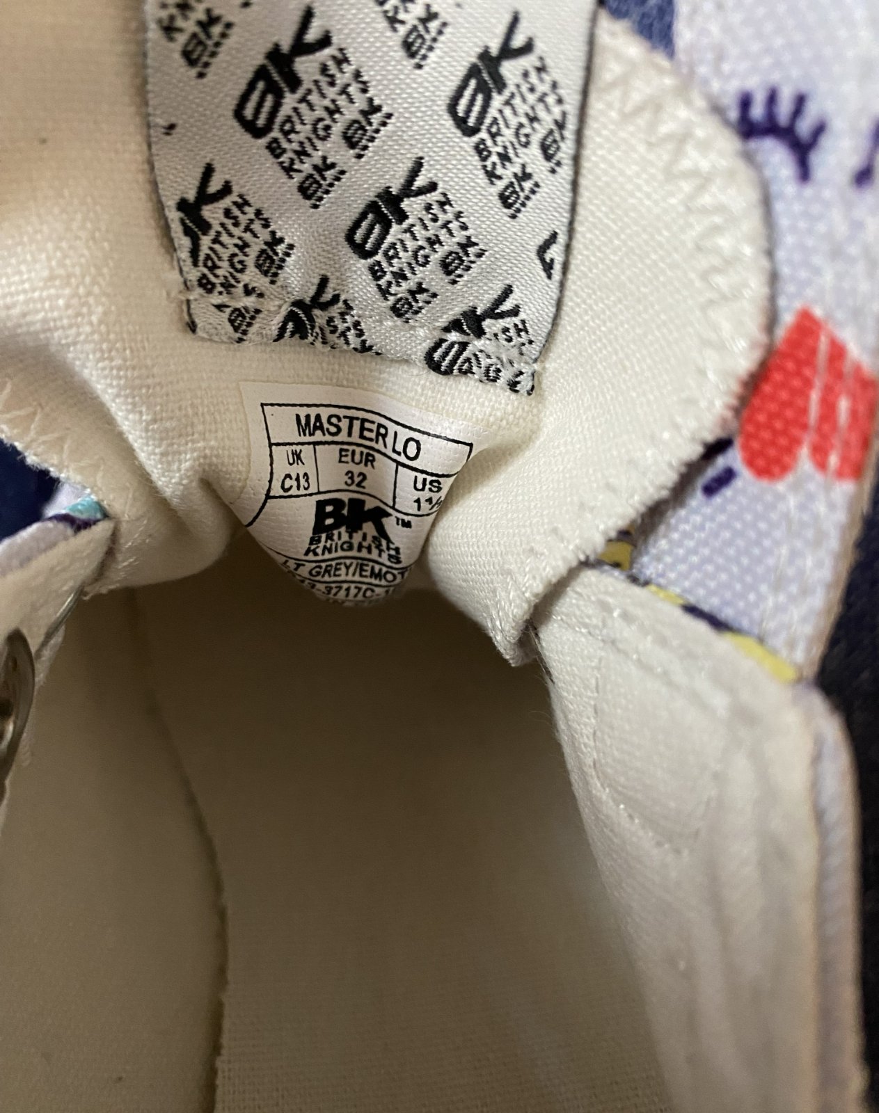 Detské tenisky s potlačou BK British Knights v. 32, základná farba bledučko-modrá, farebná potlač, s krabicou - viď detail. foto, vnútorná dĺžka 20cm. Pôvodná cena dosť vysoká: 59.90, po zlacnení 39.95. Kupovali sme bez skúšania cez internet, pre nás nevhodná veľkosť.