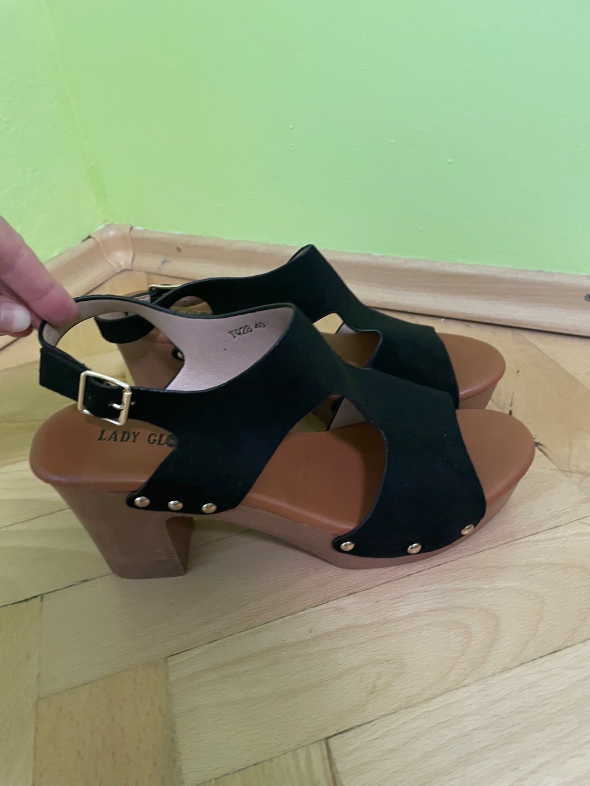 Elegantné lesklé sandále, nosené len príležitostne. Na jednom opätku je zadreté, prejdené čiernou farbou, nie je to veľmi vidieť. Na druhom je malá šmuha, ani to nie je vidieť. Všetko nafotené.