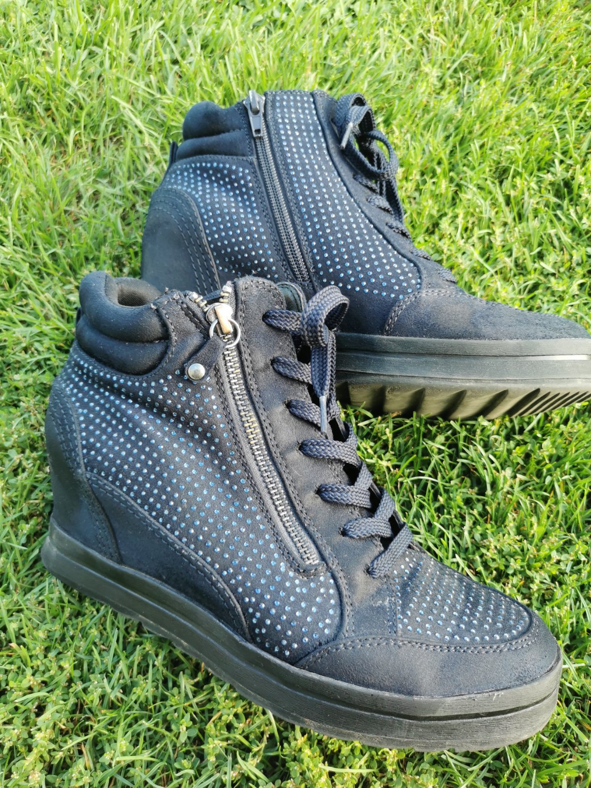 1 x obuté, ako nové, bez akýchkoľvek poškodení. Krásna tmavomodrá farba, na členkoch efektná perforácia. Vn. d. 25 cm