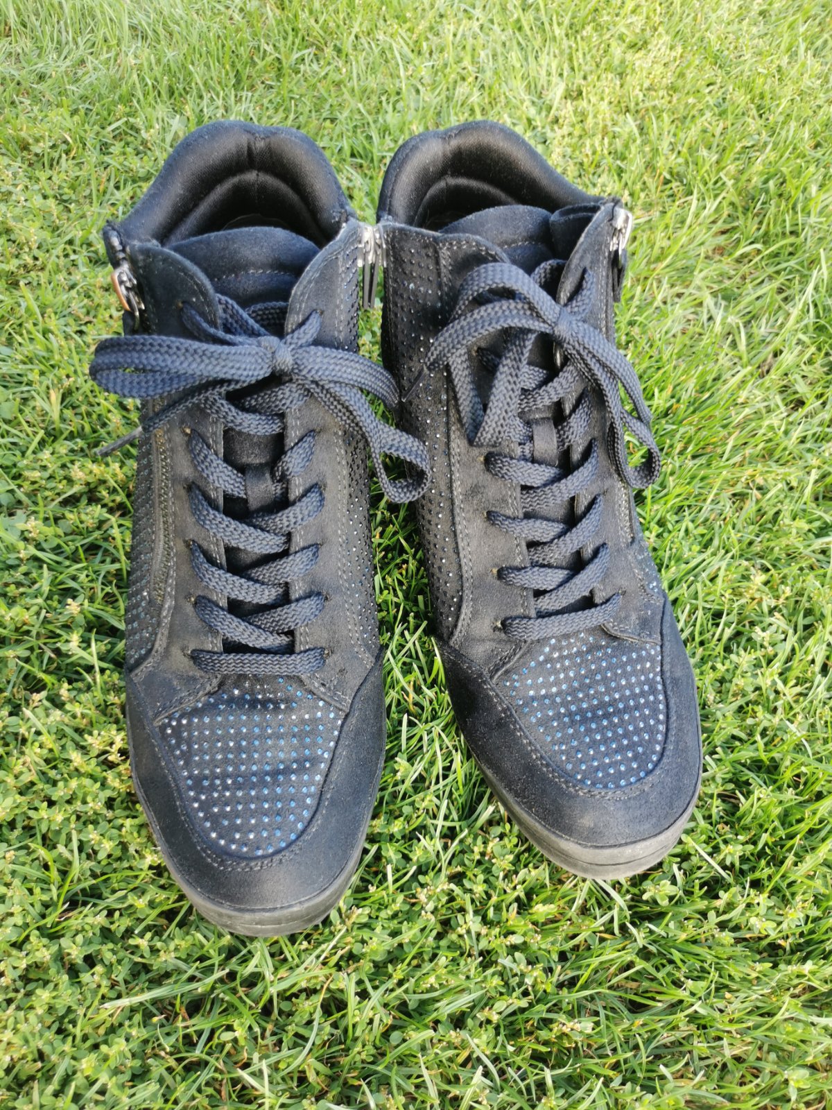 Predám topánky na klinovom podpätku, podpätok trošku šuchnutý viď foto. Inak bez poškodenia či škrabancov.