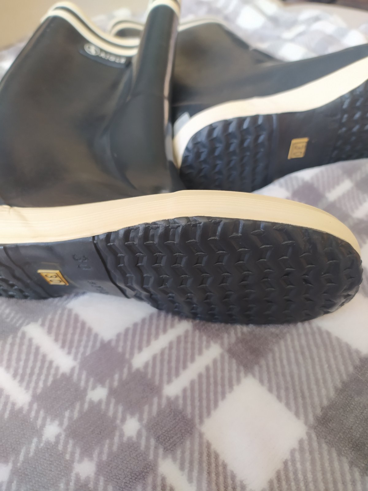 Nové, nenosené gumáky. Odstáli 1/2 roka v skrini, farebný rozdiel na bielej časti je už od výroby, resp. zo skladu také prišli.