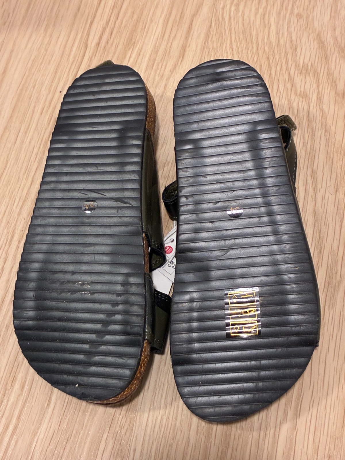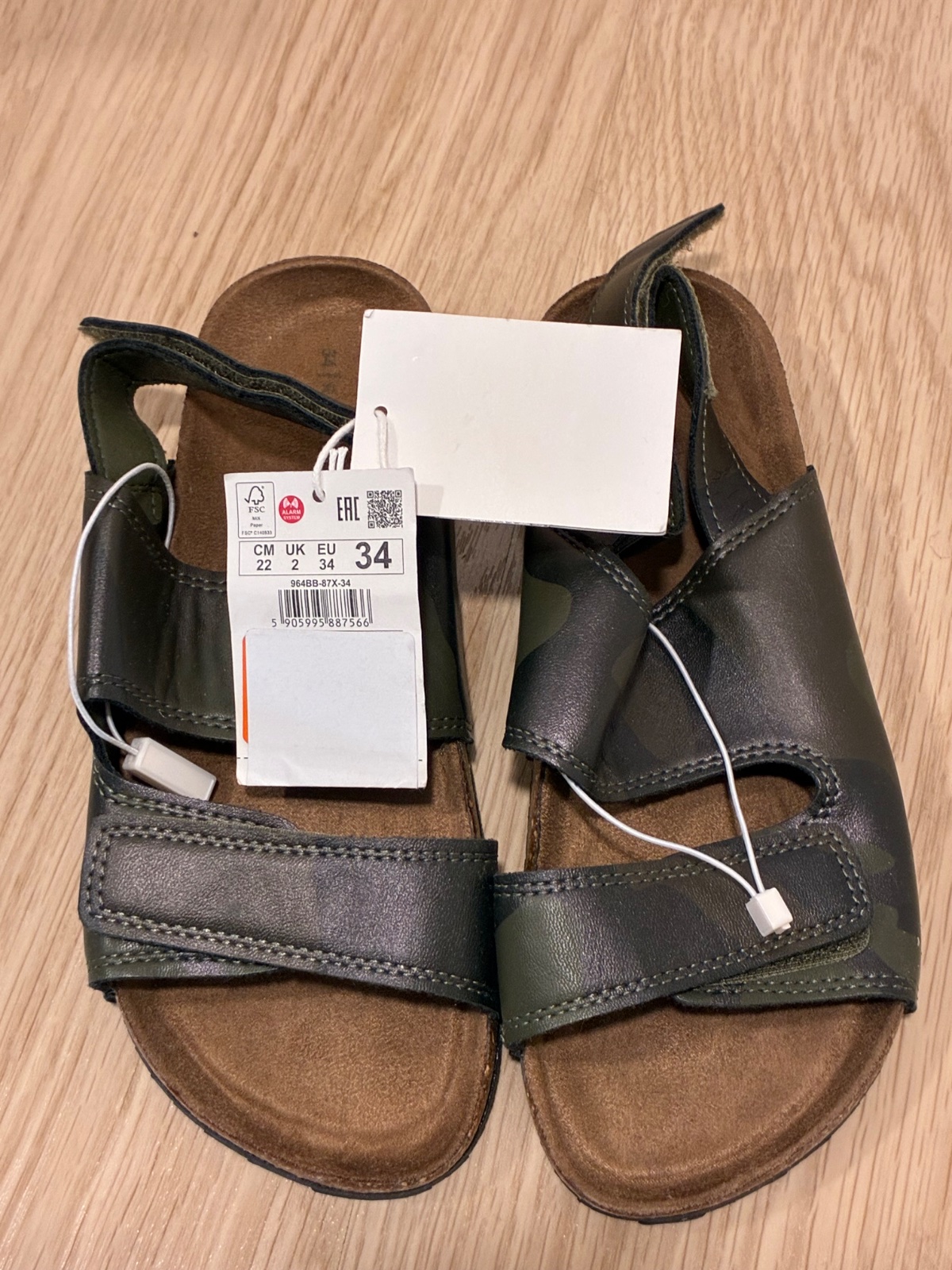 Úplne nové sandálky reserved. Kupovali sme ako papuče do školy, synovi vyrástla noha cez leto a nakoniec sme nepoužili. Su veľkosť 34, s visačkou. Zapínanie na suchý zips. Farba tmavozelená maskacova.