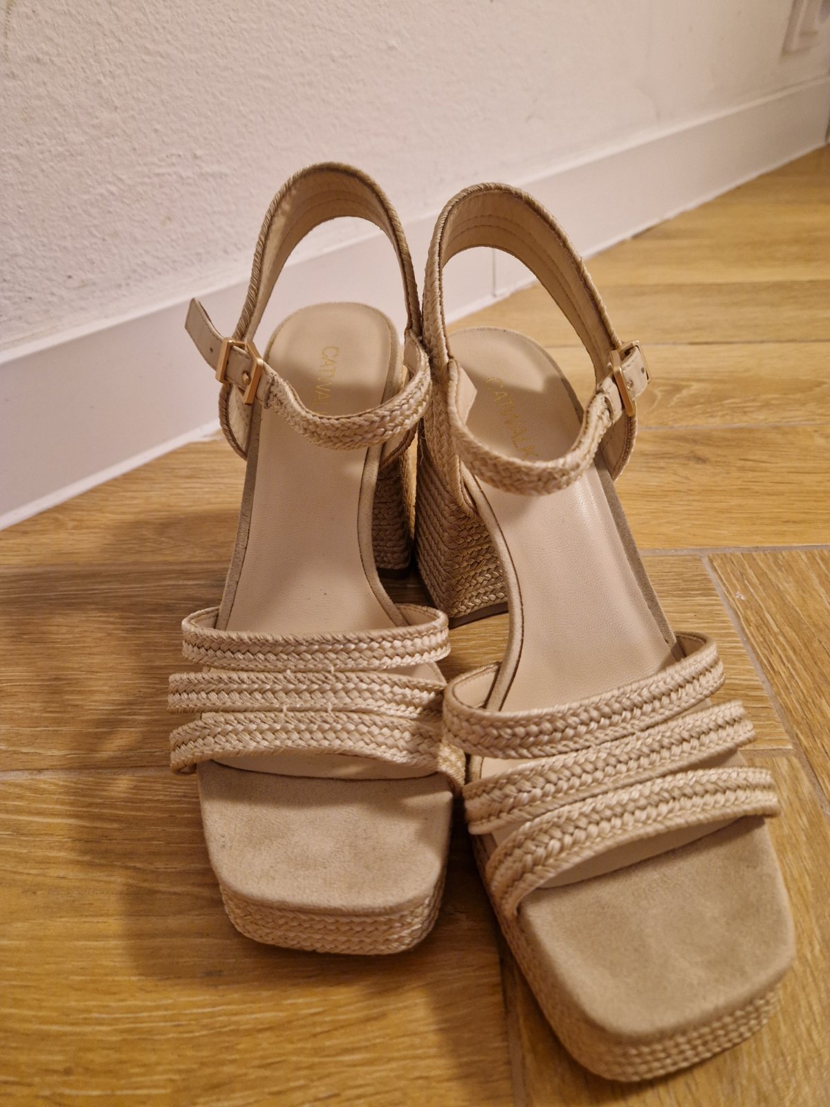 raz obuté,bez fľakov či iných poškodení,podrážky neschodené s otvorenou špičkou celková dĺžka je 24,8cm,ale odporúčam pre úzke nohy dlhé tak max 24.3 cm farba je krémová popretkávaná zlatou