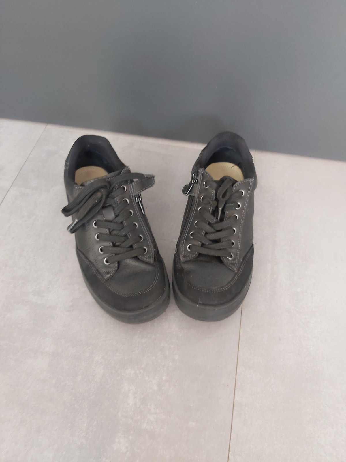 Predam cierne kozene tenisky, pre lahsie a rychlejsie obuvanie maju funkcny zips. Vlozka kozena, makksia. Osuchnute spice mozno vyriesit kremom na topanky.
