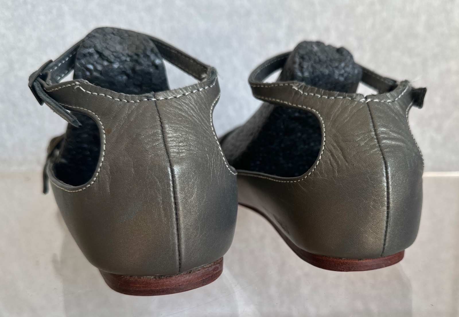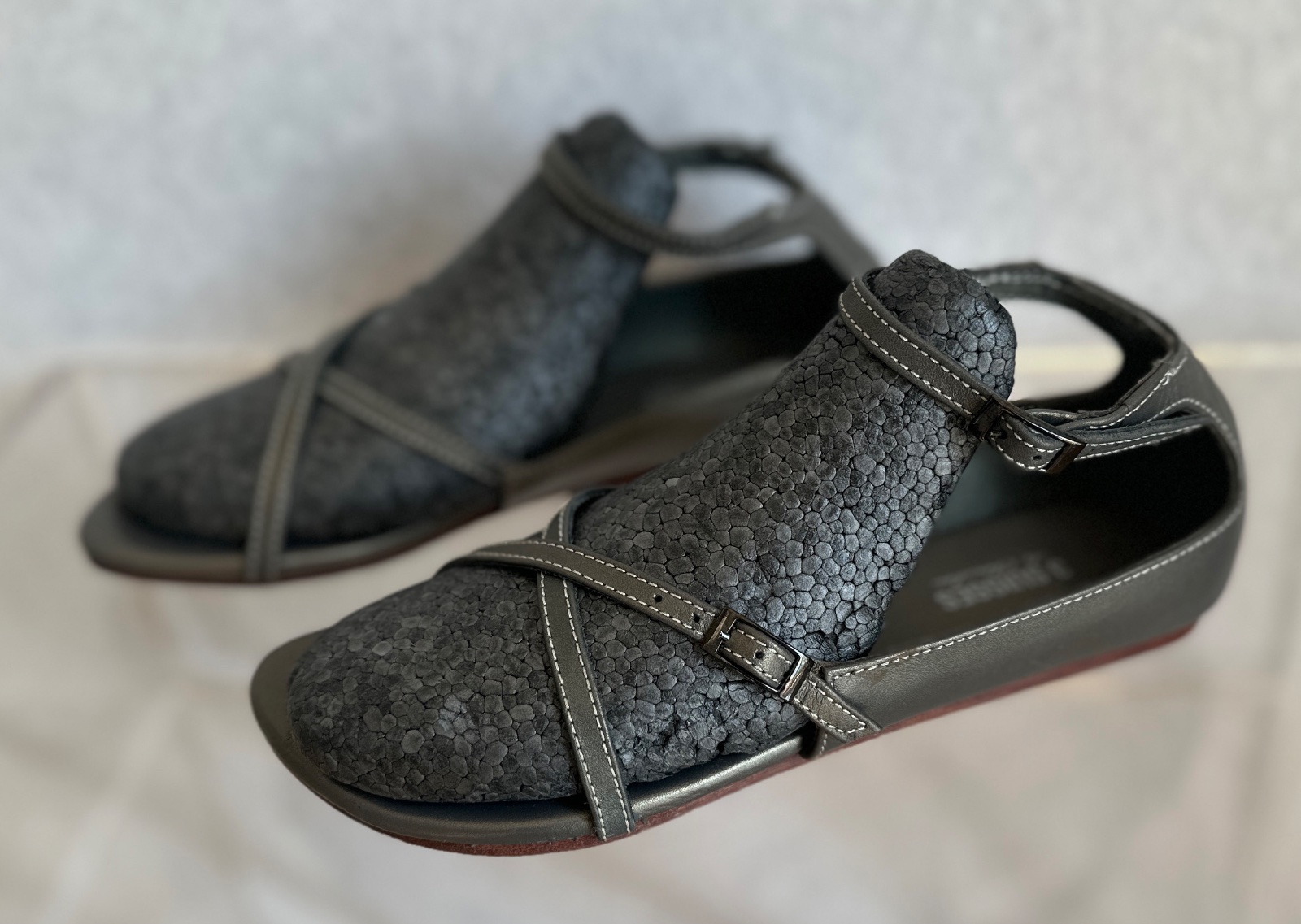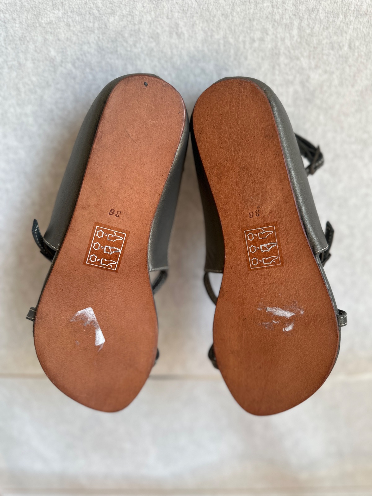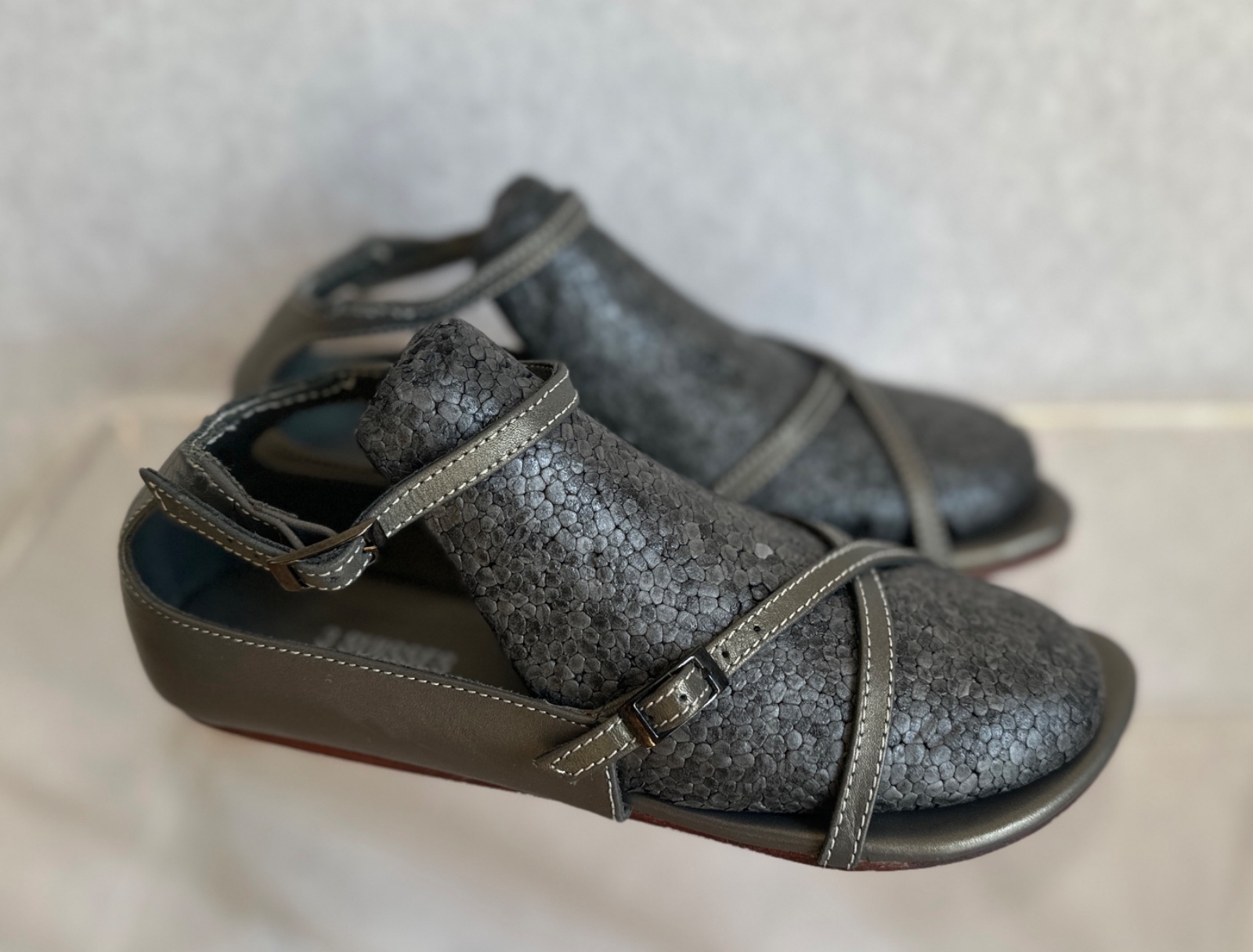 Krásne štýlové sandálky z jemných remienkov a plnou pätou. Farba je tmavošedá, ale na slnku v nej vystúpi zlatá metalíza - krásny efekt - pôsobia luxusne a nadčasovo.