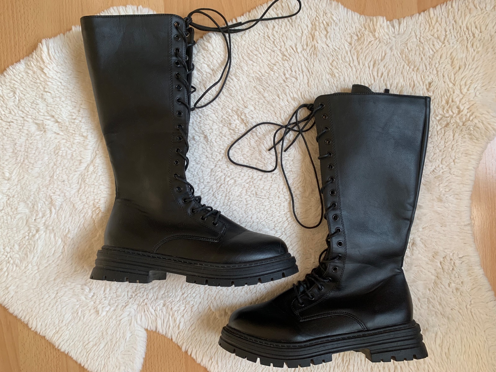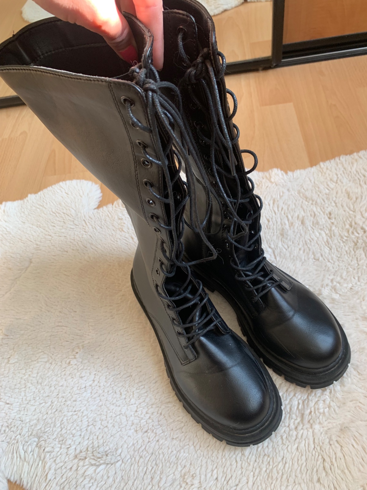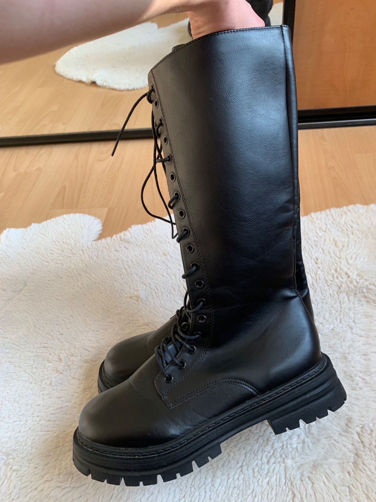 Čierne vysoké čižmy vo veľkosti 41. Pohodlné. Z vnútornej strany mierne šuchnutie - stačí zatrieť krémom. Celková výška 45 cm, opätok 4,5 cm a sára 40 cm.