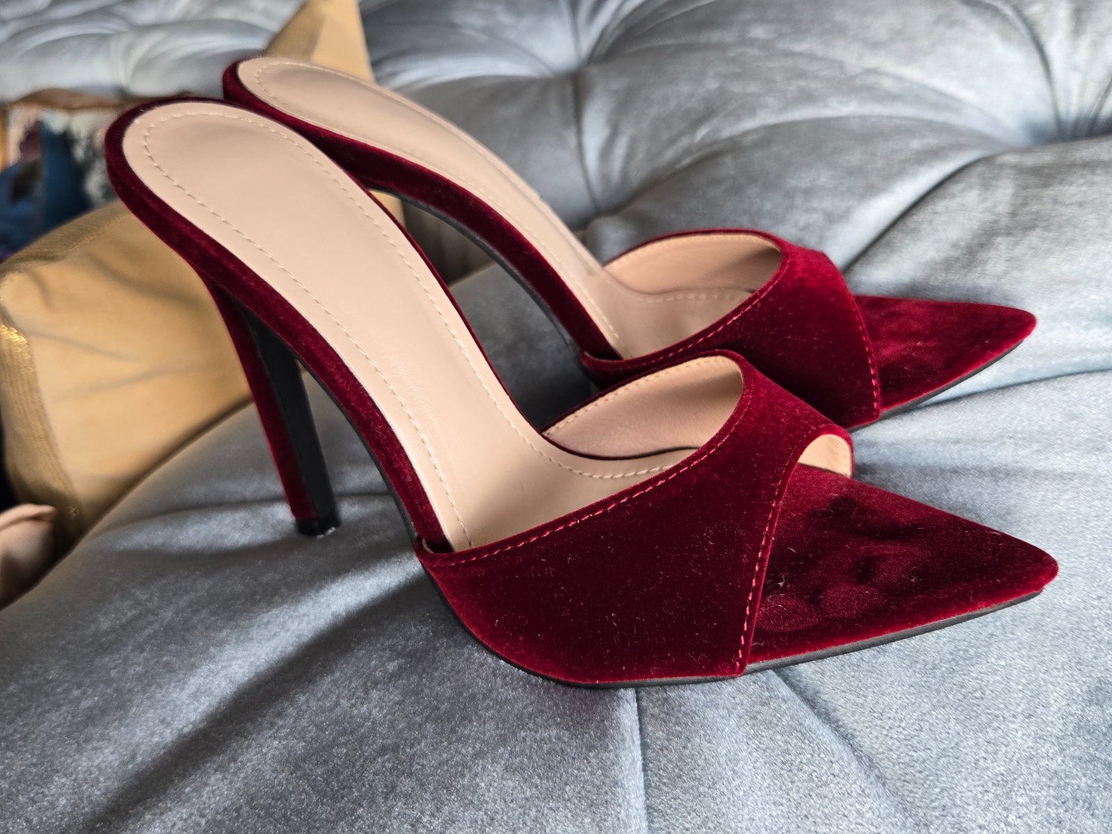 Krásne šlapky vínovej farby, použité iba na fotenie, predlžujú úžasne nohy. Top stav. Cena symbolická.