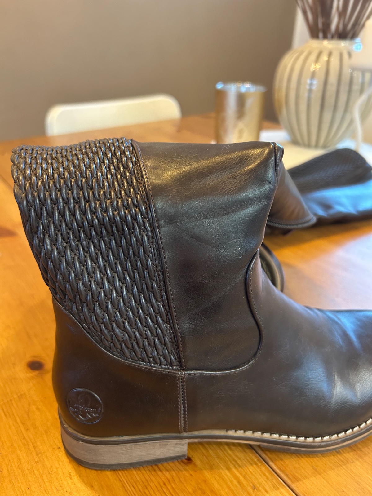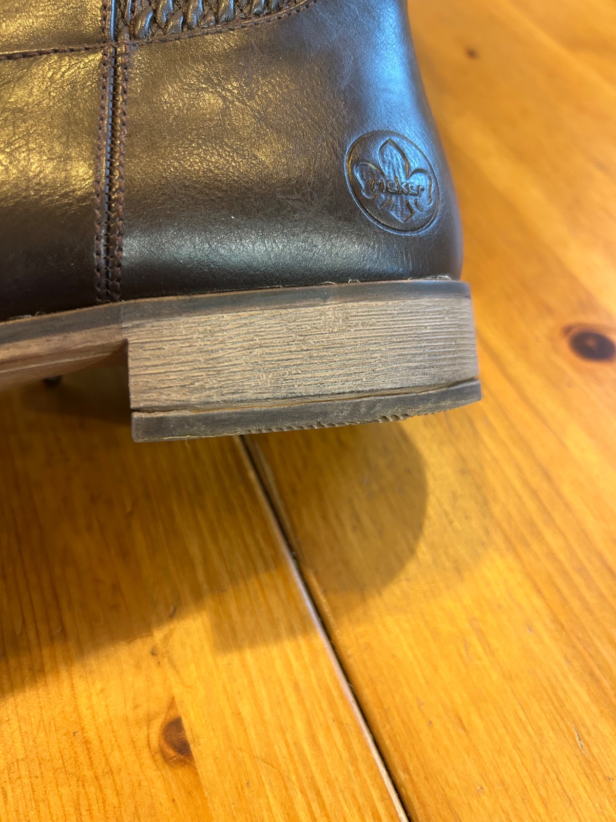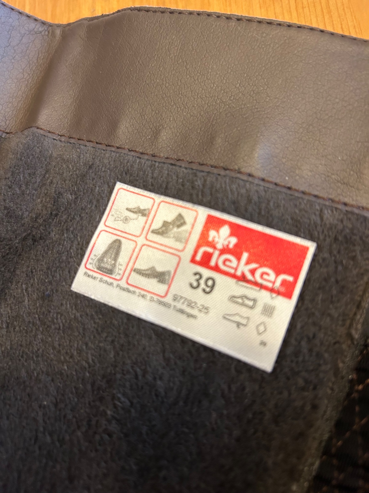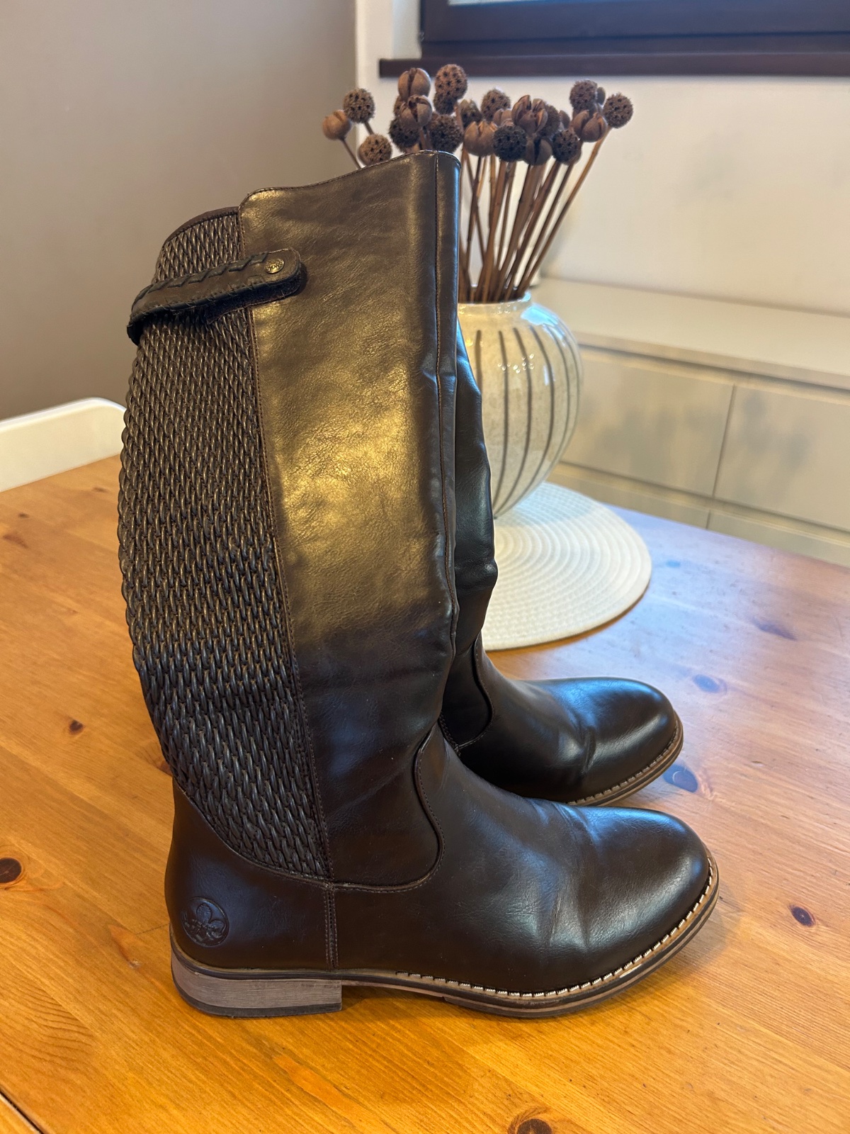 Posuvam krasne tmavohnede cizmy znacky Rieker. Kupila som nove mamine, trochu jej pribralo lytko a uz ich nezapne. Su vo vybornom stave, vid. foto. Pc bola 129 Eur. Kupujete prakticky nove cizmy. Su ozaj krasne. Vhodne skor na uzsiu nohu. Maju ale velku strecovu cast, takze sa nohe prisposobia, nie su pevne.