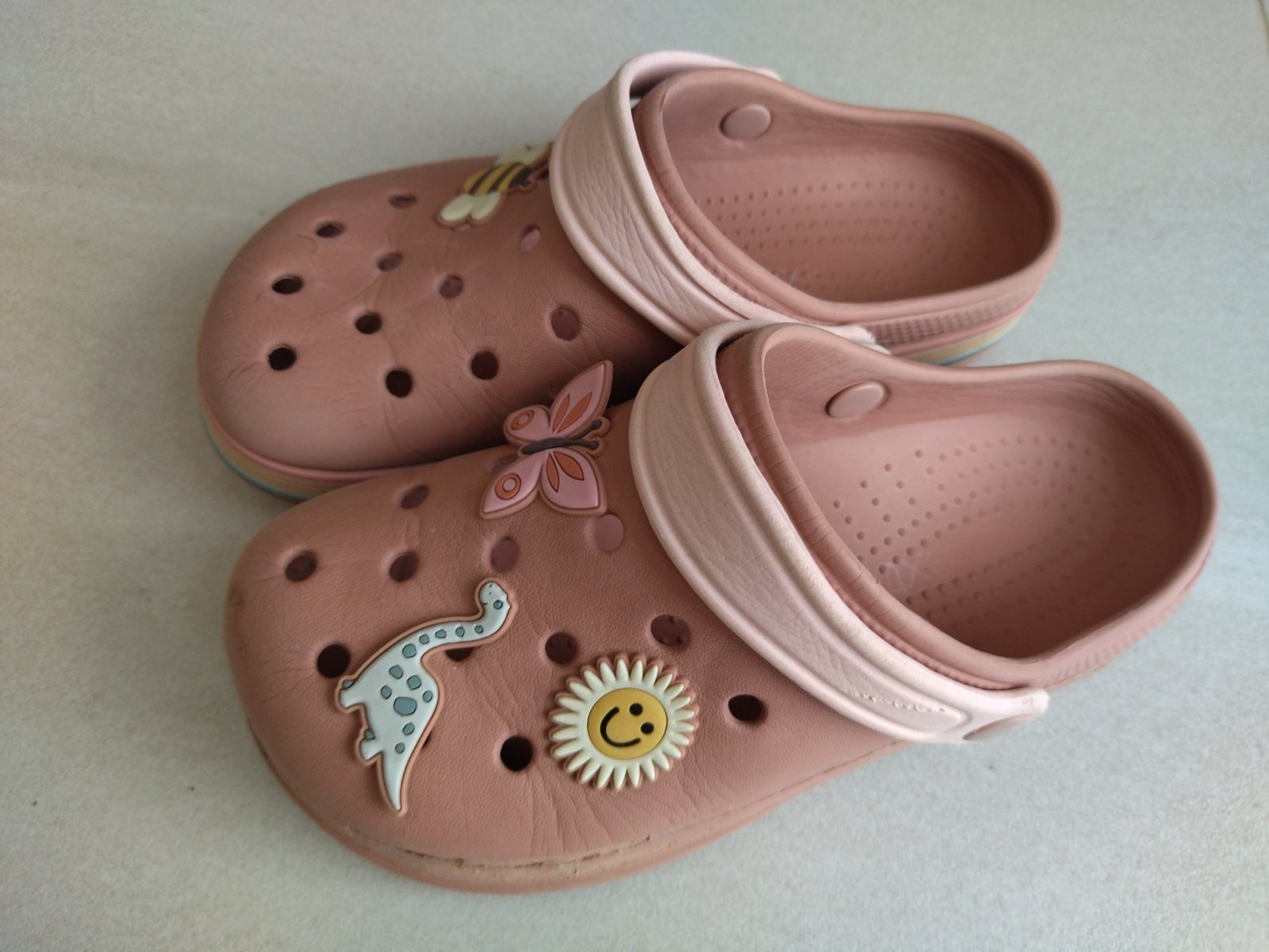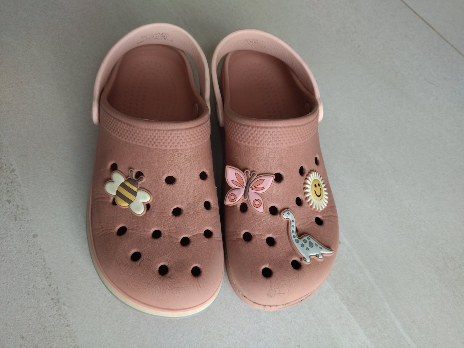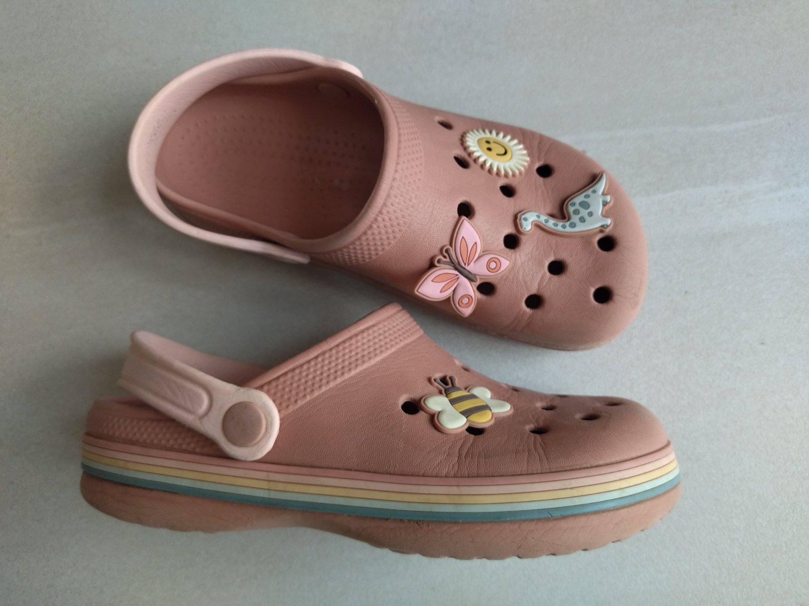 Predám krásne kroksy zn. Next. Nevydratá podrážka. S dúhovým pásom po obvode a veselými ozdôbkami. Dúhový pás na jednej topánke žiaľ chýba. Super aj do vody. Sú mäkké, ľahké a pohodlné. Velkost 33